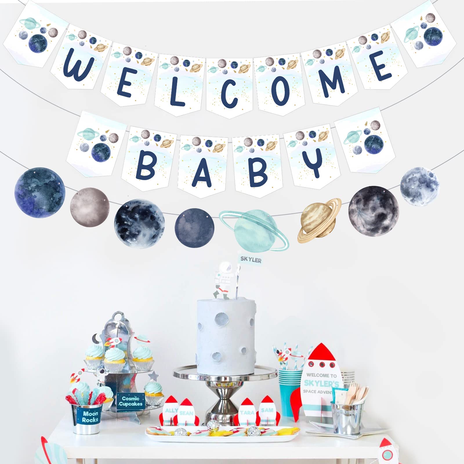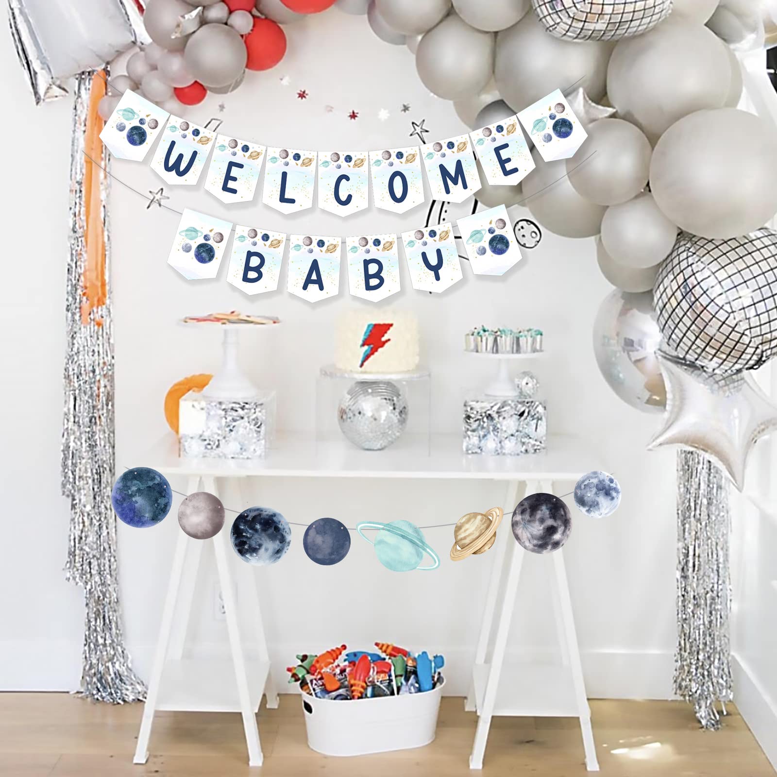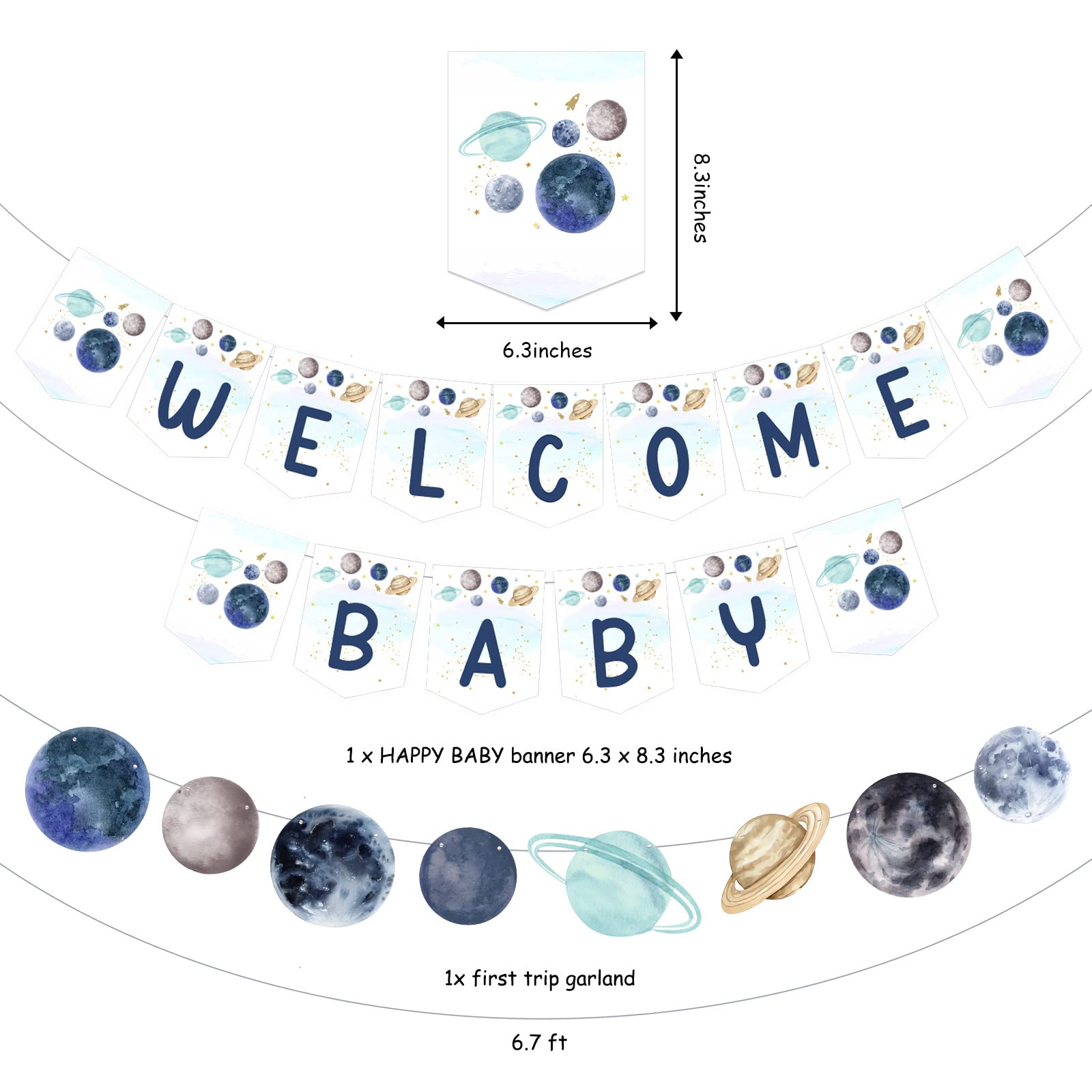 PACKAGE INCLUDES 1 Welcome Baby banner 6.6 feet, 1 garland 6.6 feet with 8 planet cards on it