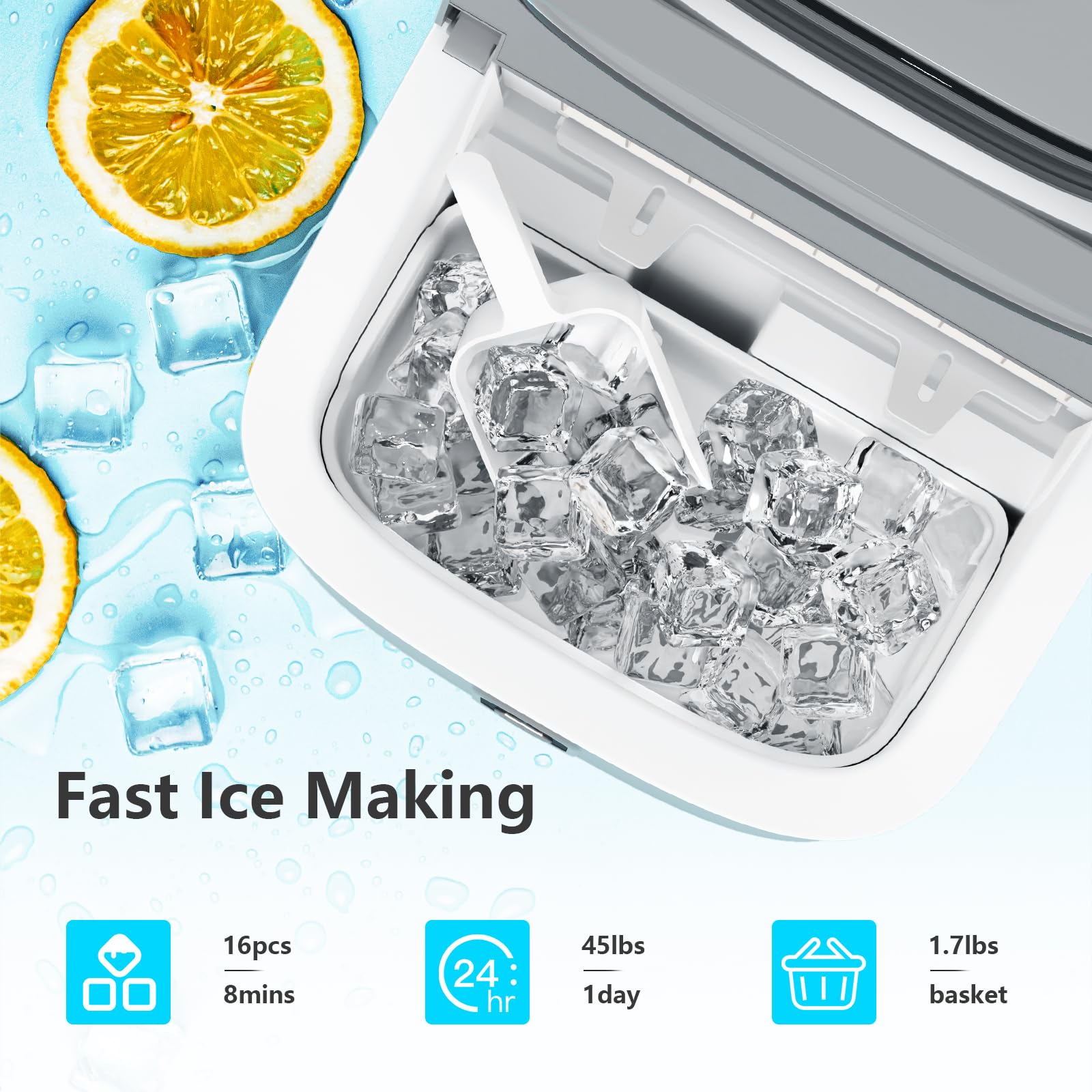 Swift Ice Production: Our ice maker efficiently crafts 16 ice cubes in just 8 minutes, ensuring a continuous supply of fresh ice for your needs. 11.81"D x 8.66"W x 16.54"H