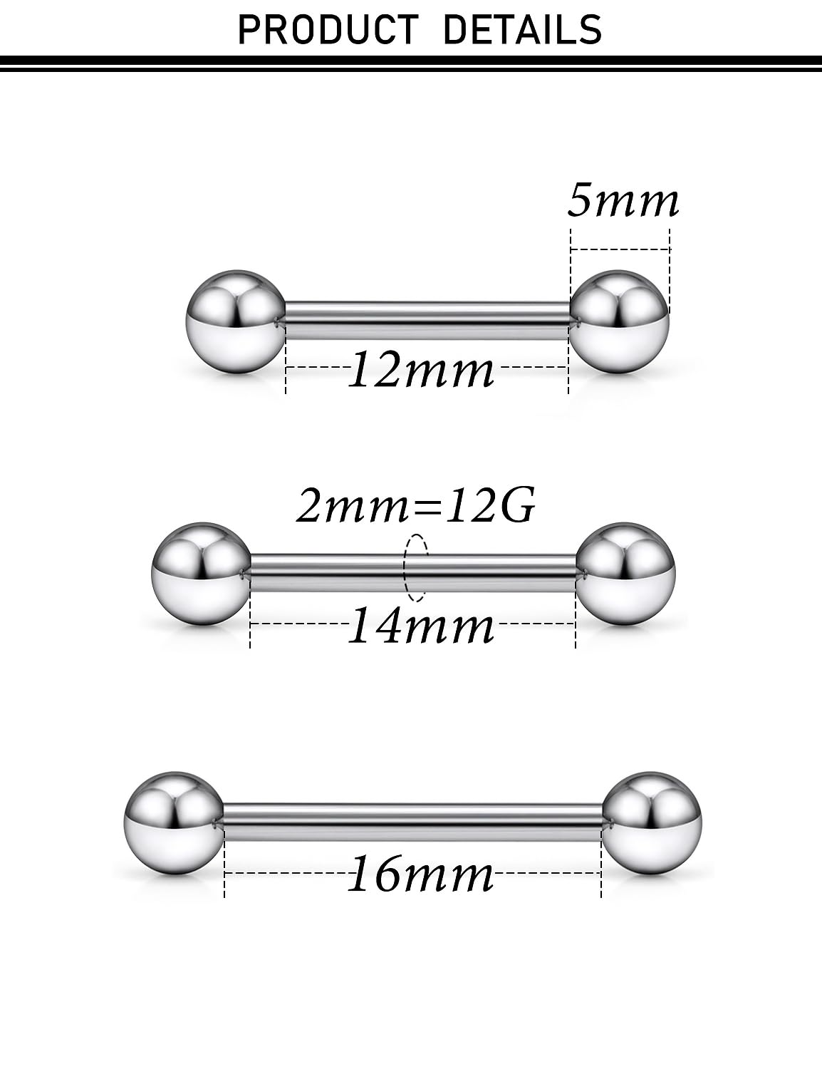 SIZE:Nipple Piercing Tongue Rings Bar Thickness: 12G=2.0mm, Wearable Length: 12mm 14mm 16mm, The Ball Size is 5mm.