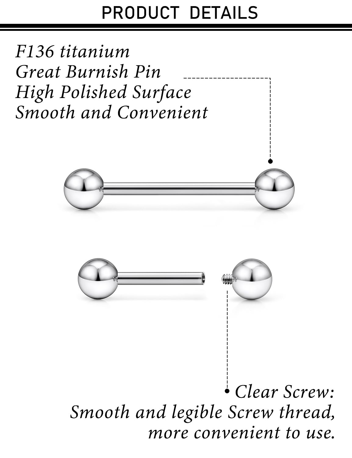 MATERIAL:The Nipple Barbells are Made of G23 Titanium Material, not Harmful to the Skin but cn Help with wound Healing, is Comfortable for Wearing. This Bar is Internally Threaded