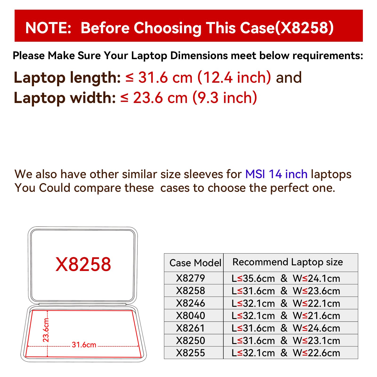 Model No.: X8258: internal dimensions of the case: 31.8x24x2.7 cm ( 12.5x9.4x1.1 inch ).Recommend Laptop Size: 31.6x23.6x2.2 cm. Please confirm your laptop dimension. If the size of your laptop exceeds our recommended dimensions on any side, this sleeve will not fit your laptop