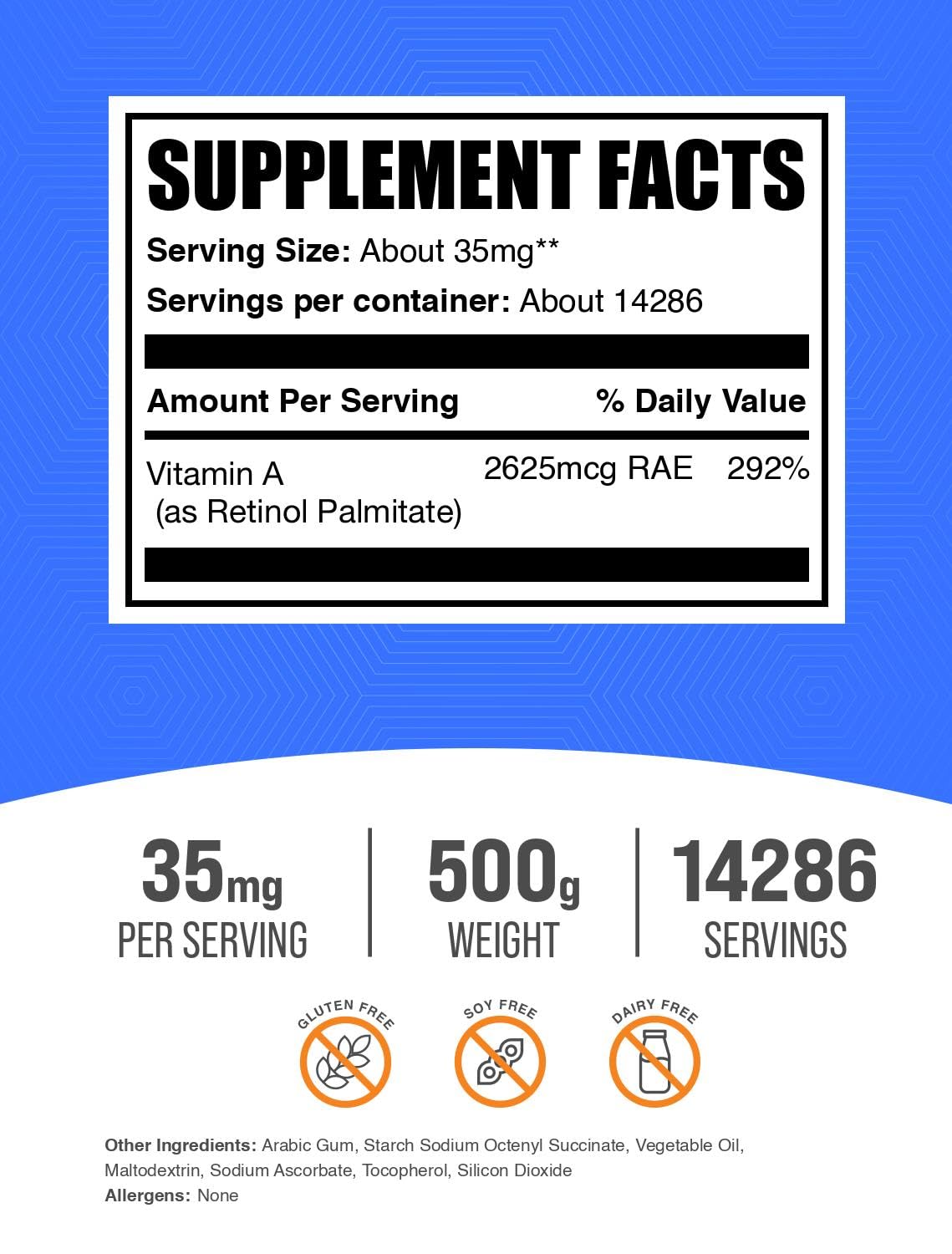 BulkSupplements.com Vitamin A Palmitate Powder - as Retinol Palmitate, Vitamin A Supplement for Immune & Eye Support - Gluten Free, 35mg per Serving, 500g (1.1 lbs) (Pack of 1)