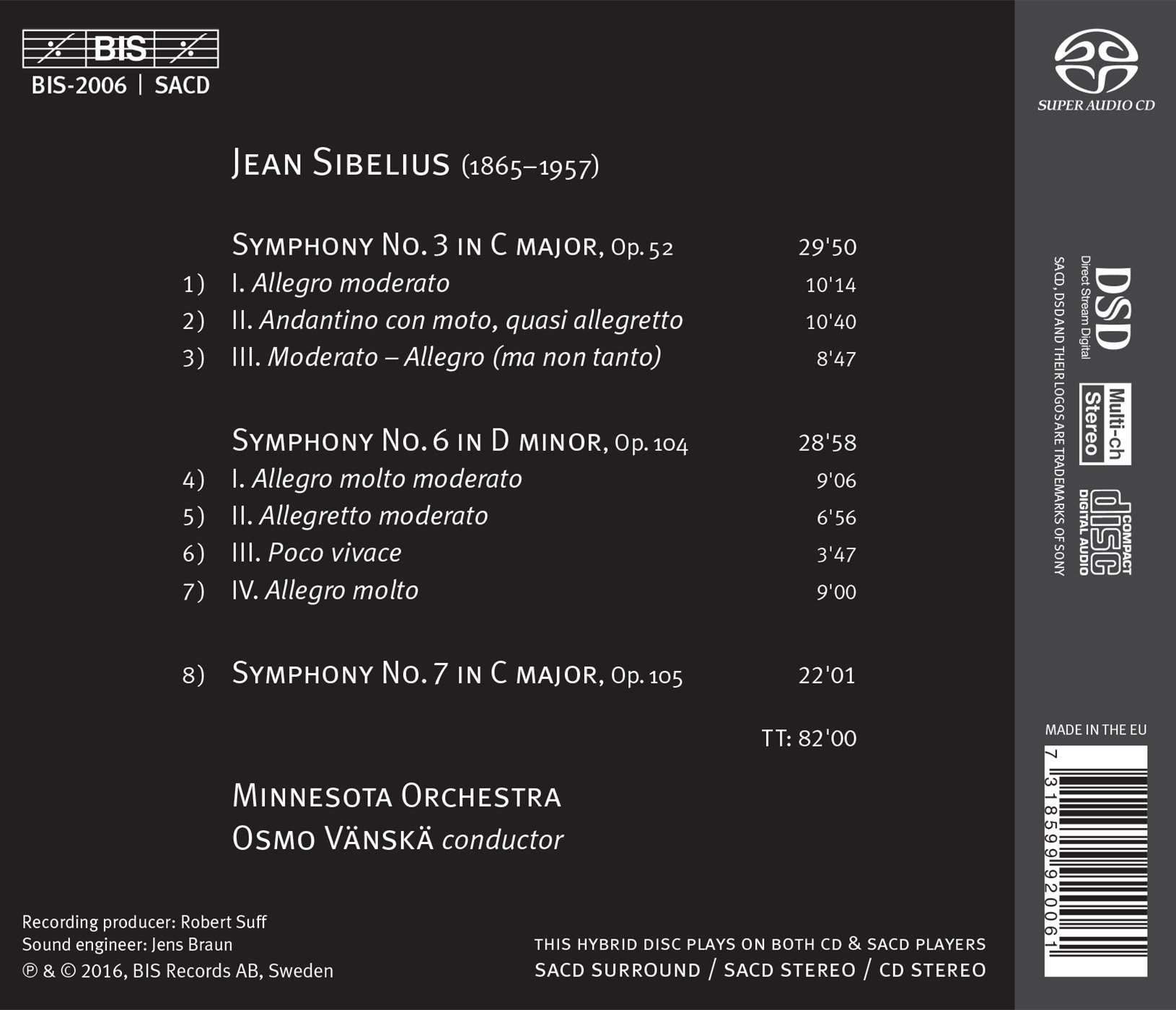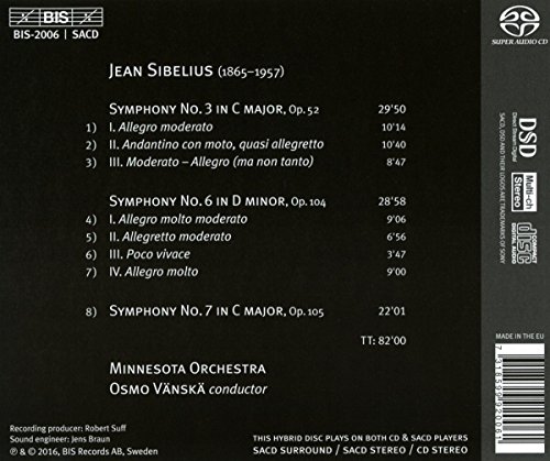 This new release from BIS is the final installment in the Sibelius cycle from Osmo Vanska and the Minnesota Orchestra. The prior albums found incredible success upon their release, with the second receiving a Grammy Award for Best Orchestral Performance. This album combines Sibeliuss Third Symphony, completed in 1907, with his two final symphonies, Nos. 6 and 7, which were composed between 1922 and 1924. The Third Symphony is his most classical symphony, which was a radical direction change after the opulence of his second. Conductor Koussevitzky called the work music far in advance of its time. The Sixth Symphony again surprised his admirers with its intense climaxes and virtuosic orchestrations. Immediately following came his symphonic swan song, the stern but majestic Seventh Symphony.