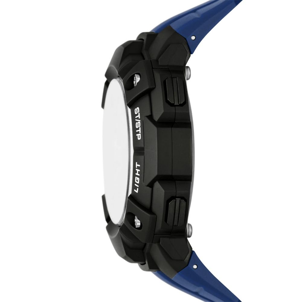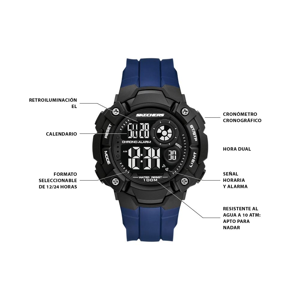 With a sizable 51mm round case and a comfortable blue strap, this Skechers digital watch makes a statement while ensuring all-day wearability. The negative display dial is clear and easy to read, protected by a sturdy mineral crystal.