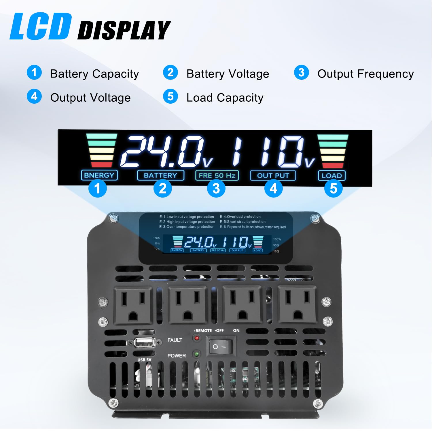 Intelligent LCD Display: Clear LCD screen displays battery voltage, output voltage, remaining battery capacity, inverter load percentage, error codes, and more.