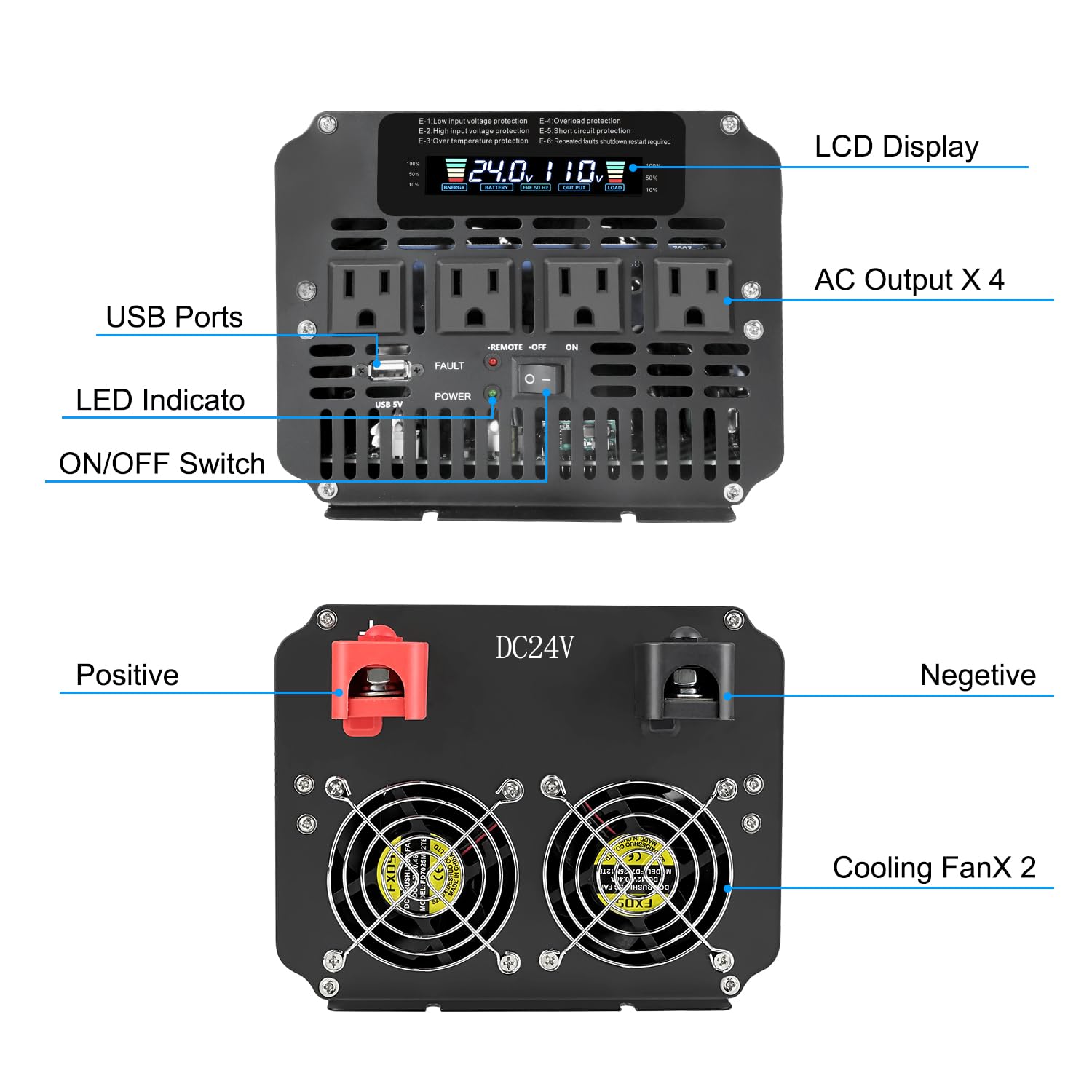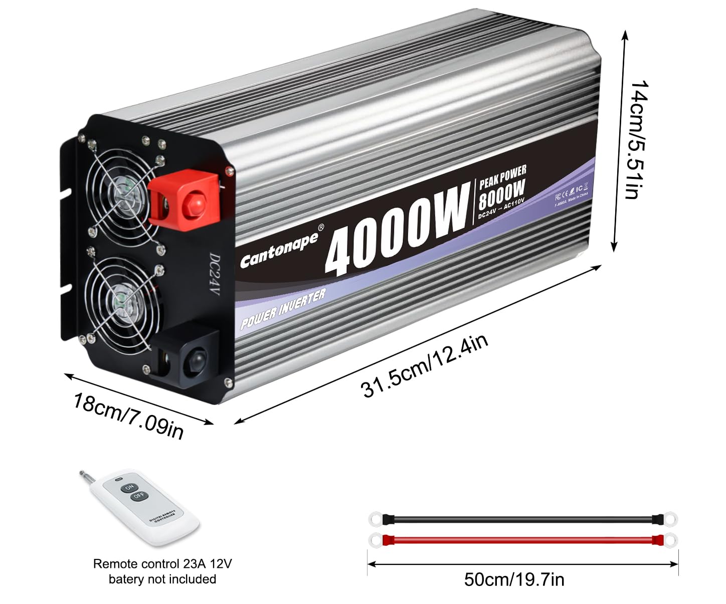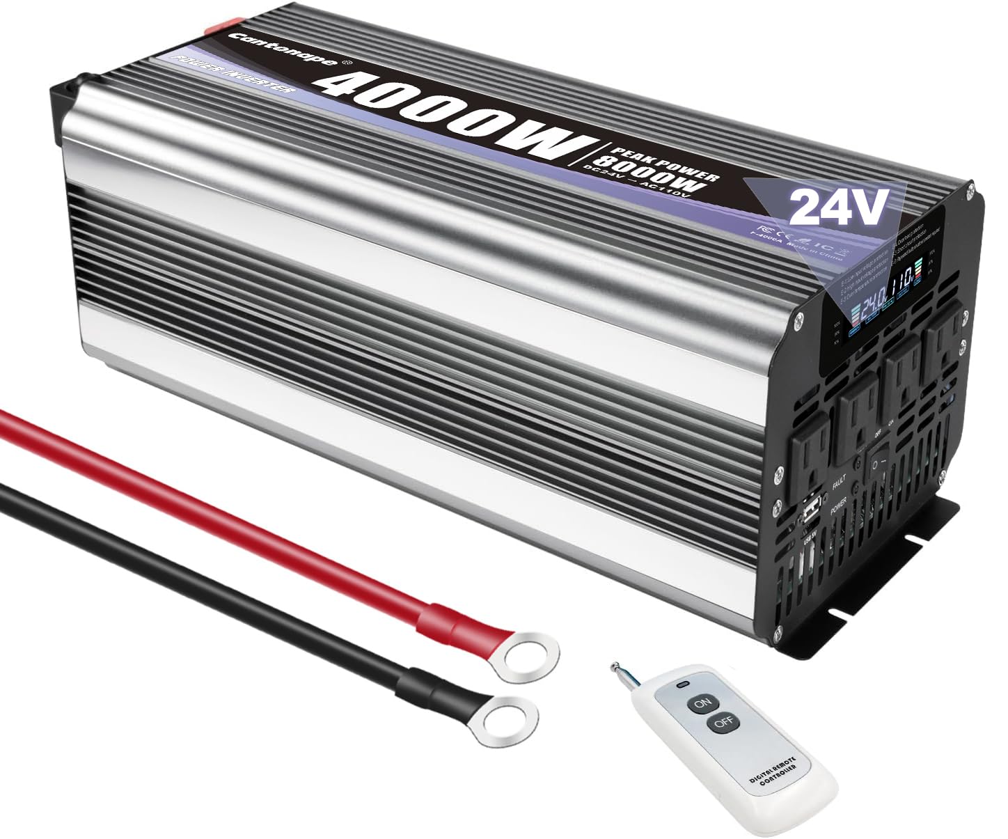 Powerful Performance: Converts DC 24V to AC 110V/120V with a continuous output of 4000 watts, peaking at 8000W. Equipped with 4 AC output interfaces and a hard-wired connection option.