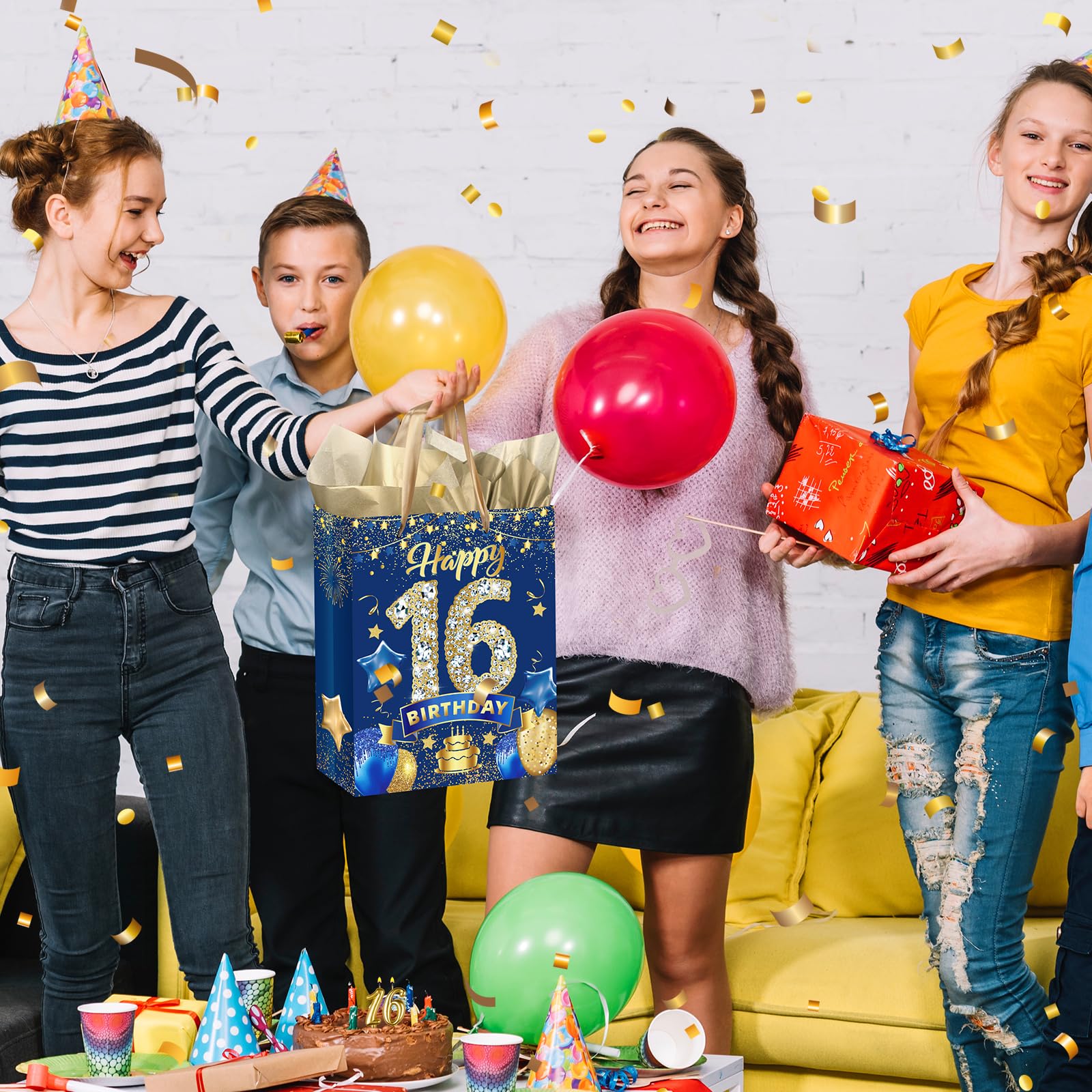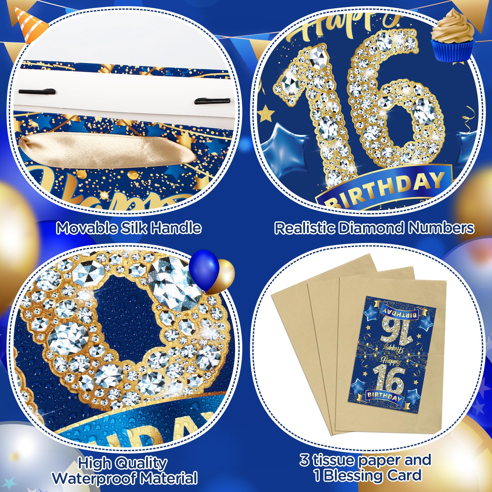 🎁Great Design:Navy Blue and Gold 16th birthday gift bag features a very shiny and realistic print, with a 16th birthday blessing card and 3pcs gold tissue paper which make the birthday gifts look more full of birthday party atmosphere