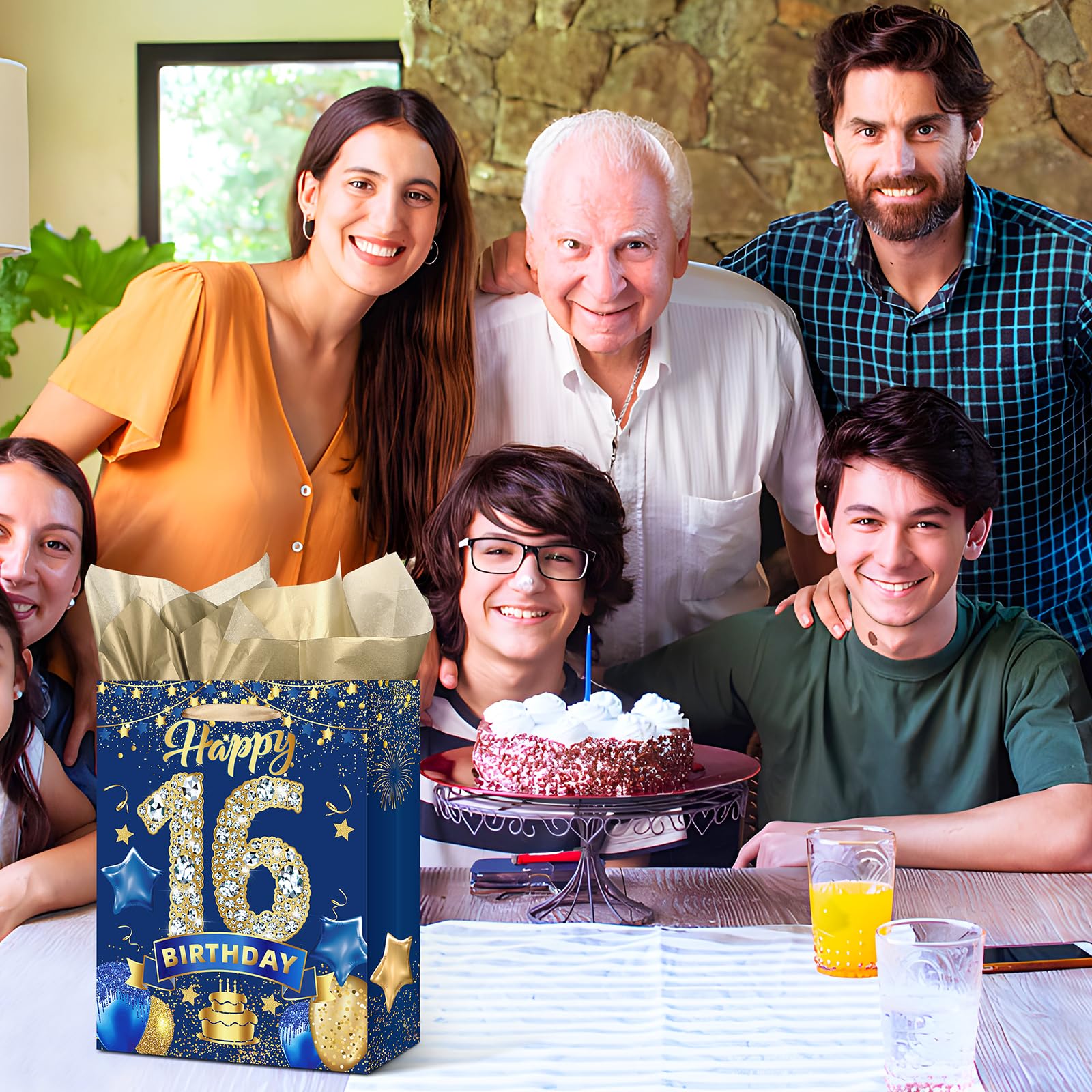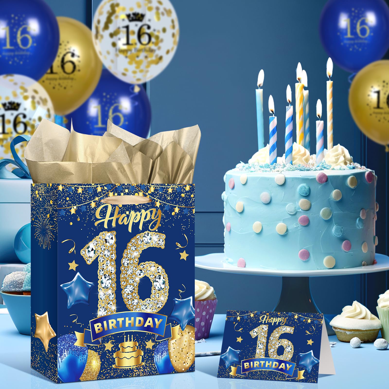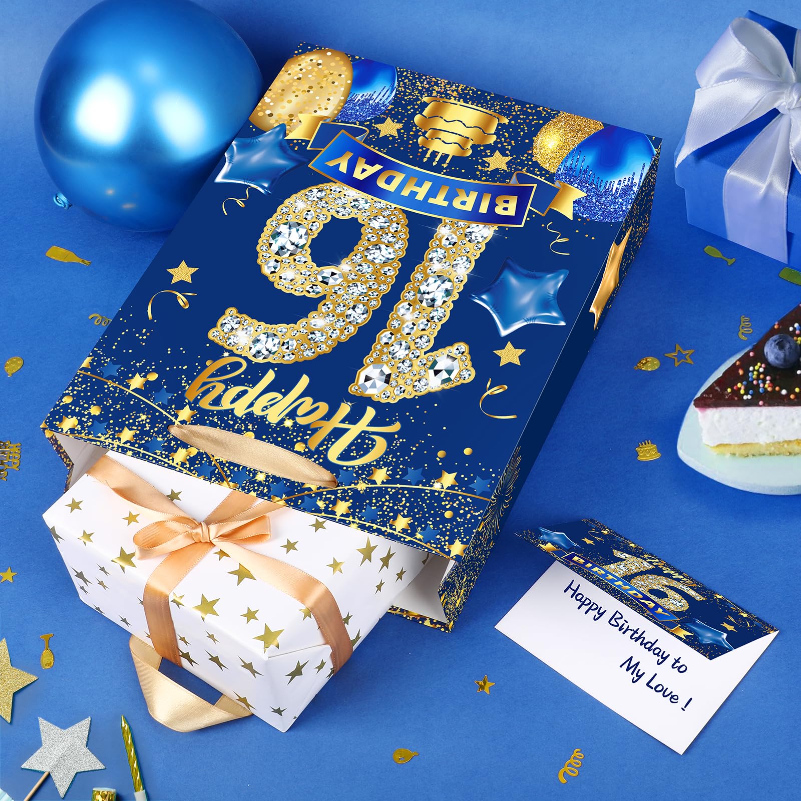 🎁Size:The size of Navy Blue and Gold 16th birthday gift bag:33 x 25 x 8 cm/13.0 x 9.8 x 3.2 inches; The size of 16th birthday blessing card: 18 x 12 cm/7.1 x 4.7 inches, The 16th birthday gift bag is large enough to hold a large number of gifts