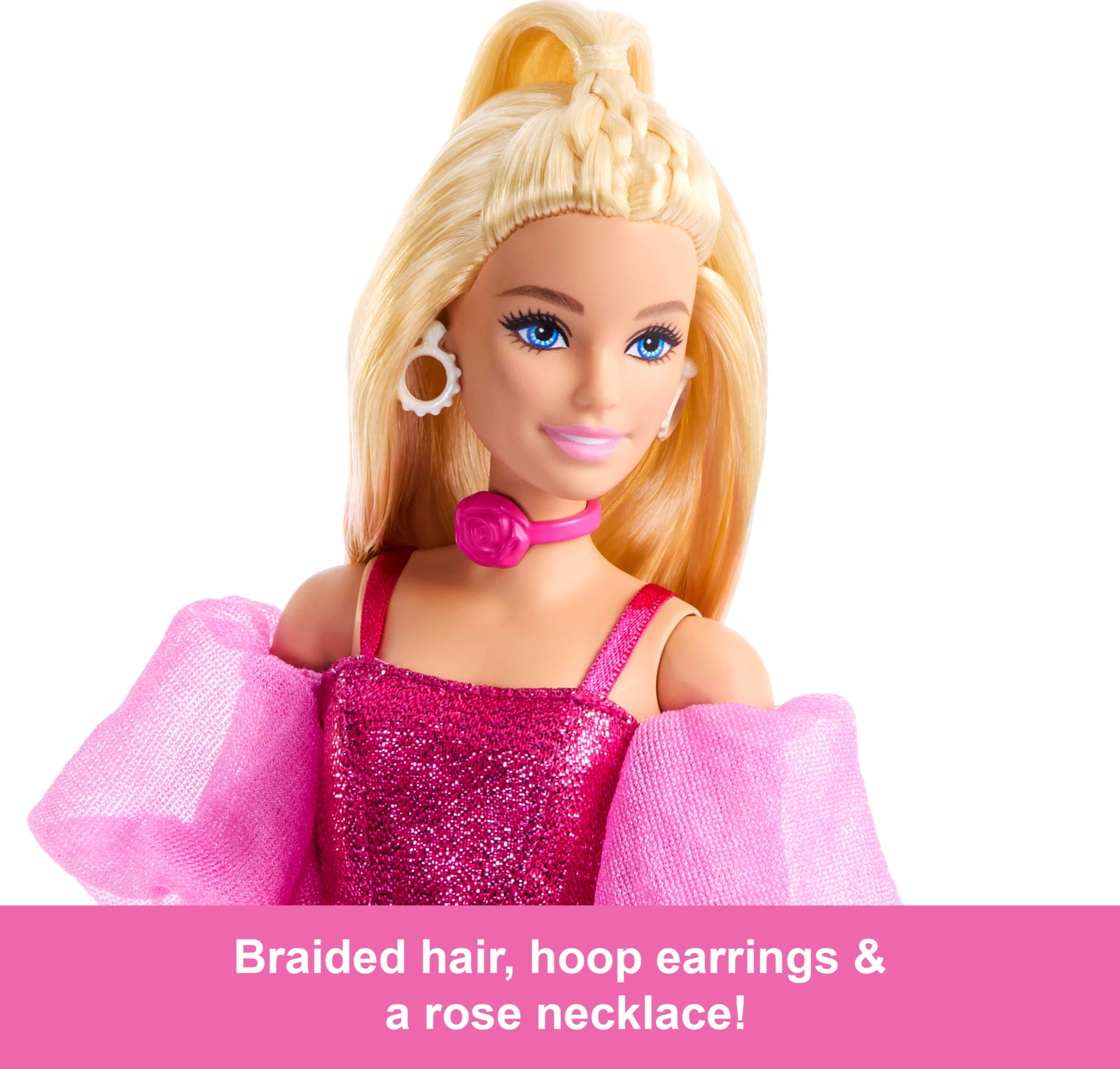 This Barbie doll shimmers in head-to-toe pink! Her sparkly metallic corset top is balanced by light-as-air organza sleeves that seem to "float" off her shoulders.