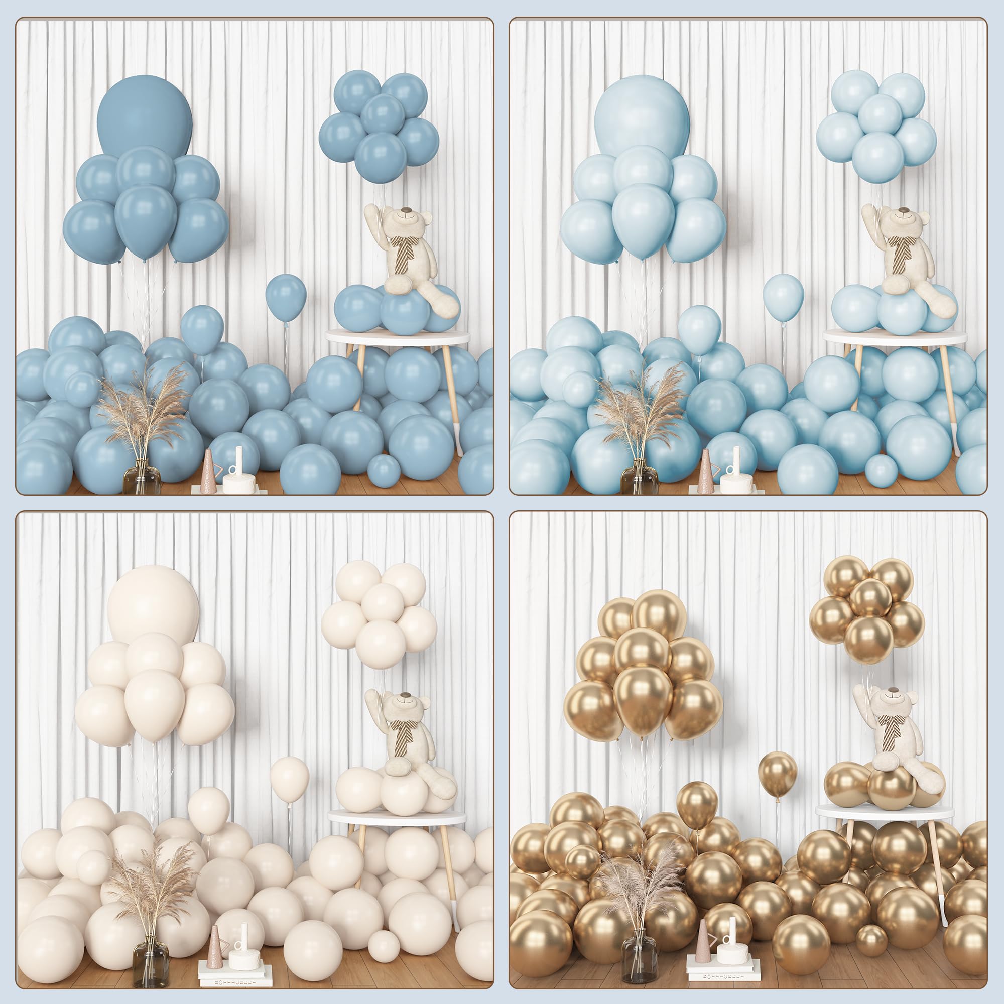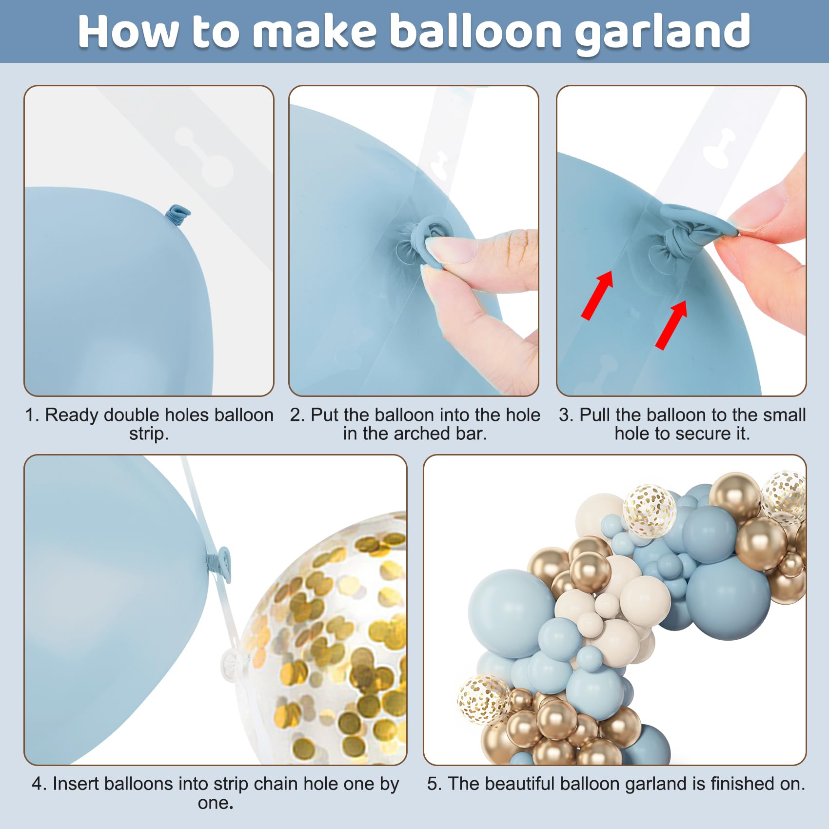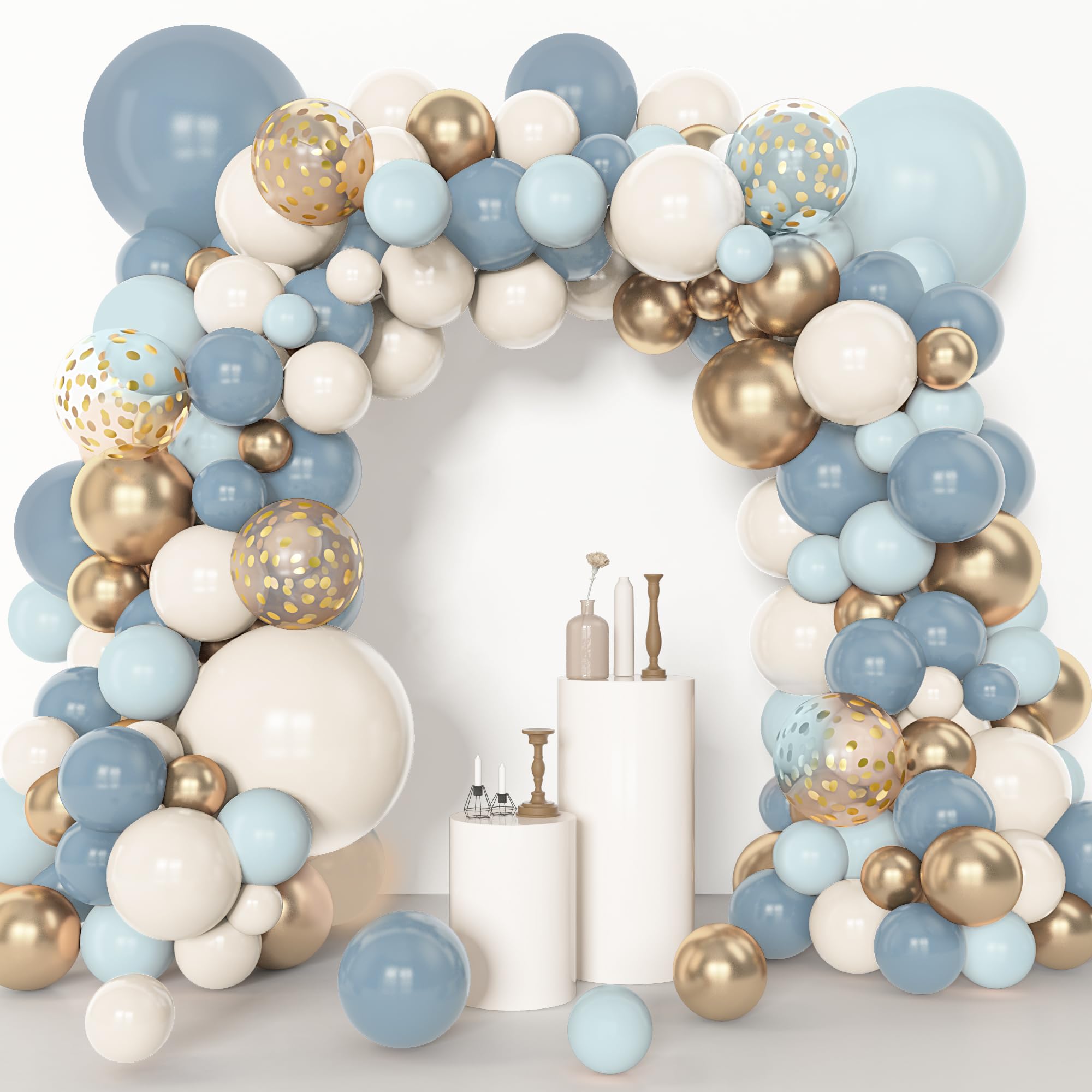 Sufficient Quantity of Dusty Blue Balloons: The dusty blue balloon arch kit includes 18”dusty blue/white sand/pastel blue balloons(3 pcs), 12” dusty blue/white sand/pastel blue/metallic gold/confetti gold balloons(25 pcs), 10” dusty blue/white sand/pastel blue/metallic gold balloons (50 pcs), 5” dusty blue/white sand/pastel blue/metallic gold balloons (65 pcs) and 10 pcs balloon tools(balloon arch strips, tying tool, 100 glue points, ribbon, flower balloon clip, hook)