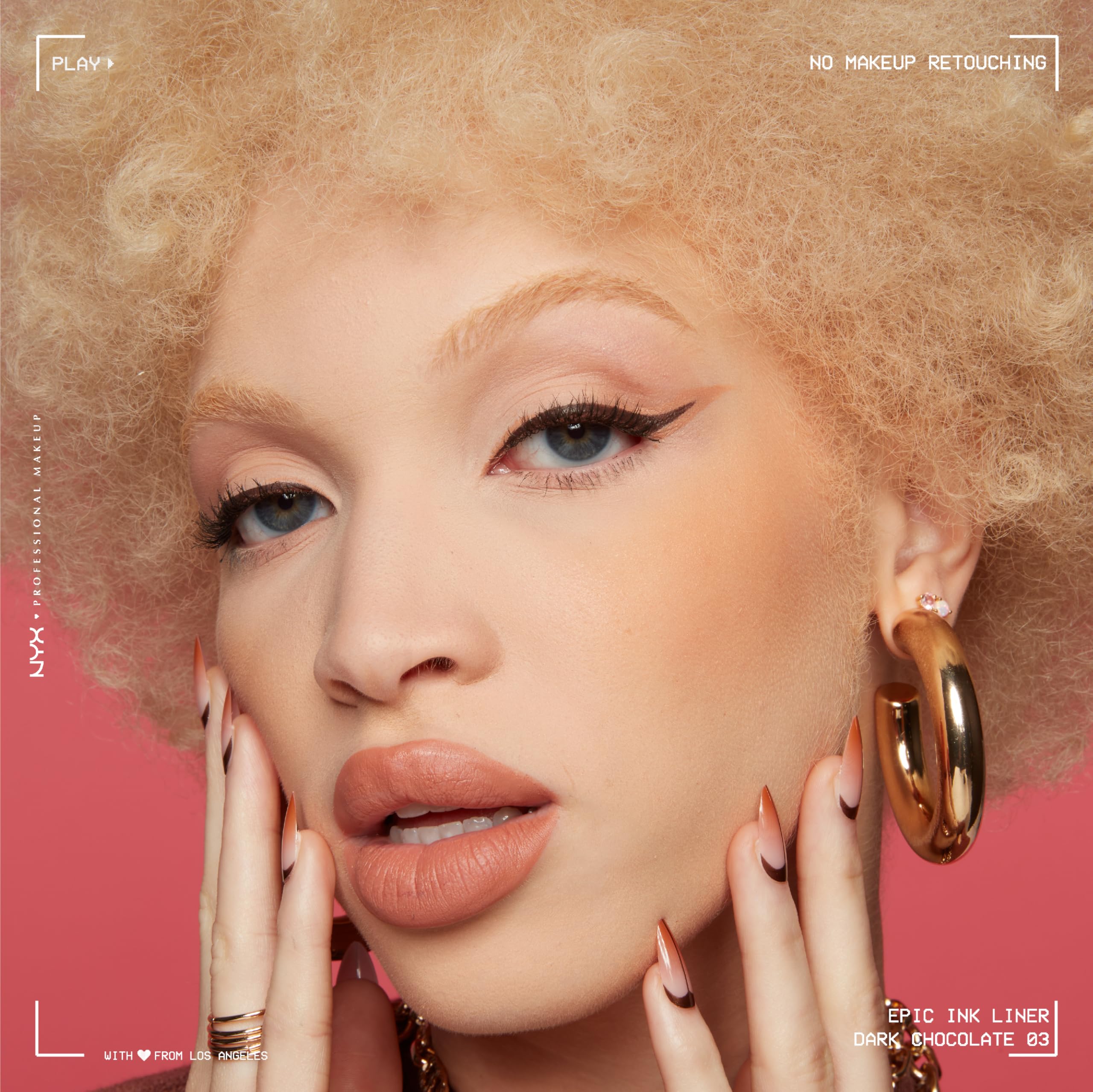 Going nude never felt s’more good. Eye-line, Eye-Contour, Eye-Light with NYX Professional Makeup's #1 Liner. S'more inspired shades & s'more precision with our flexible brush tip for intense pigments and epic nude liner looks. See up to 24 hours of wear with our waterproof, flake-resistant and matte eyeliner formula. Use the slender point of the felt-tip liquid eyeliner to trace along your upper lash line for subtle definition. Or, press down a touch more on the eyeliner pen to create a thicker line, then flick it upward at the outer corner of your eye for a striking cat-eye look.