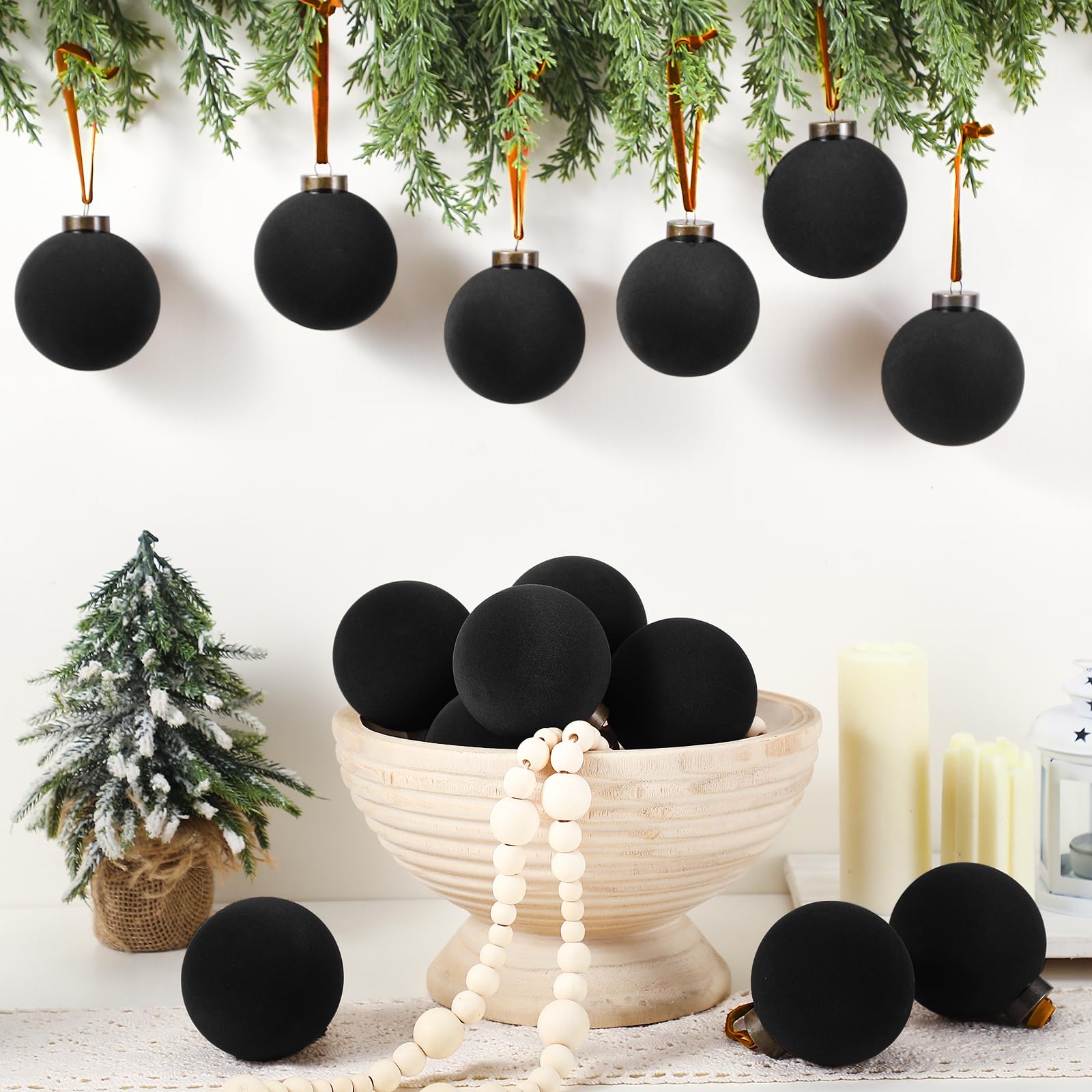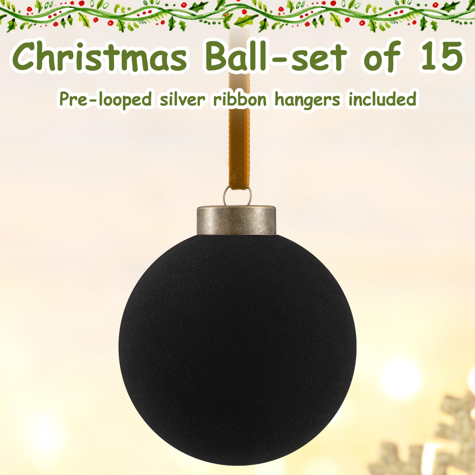 Package List: the package contains 15 pieces of flocked Christmas ball ornaments, measuring approx. 3.15 inches in diameter, featuring black color, sufficient quantity, classic styles, and nice texture can fully meet your needs for decorating and sharing
