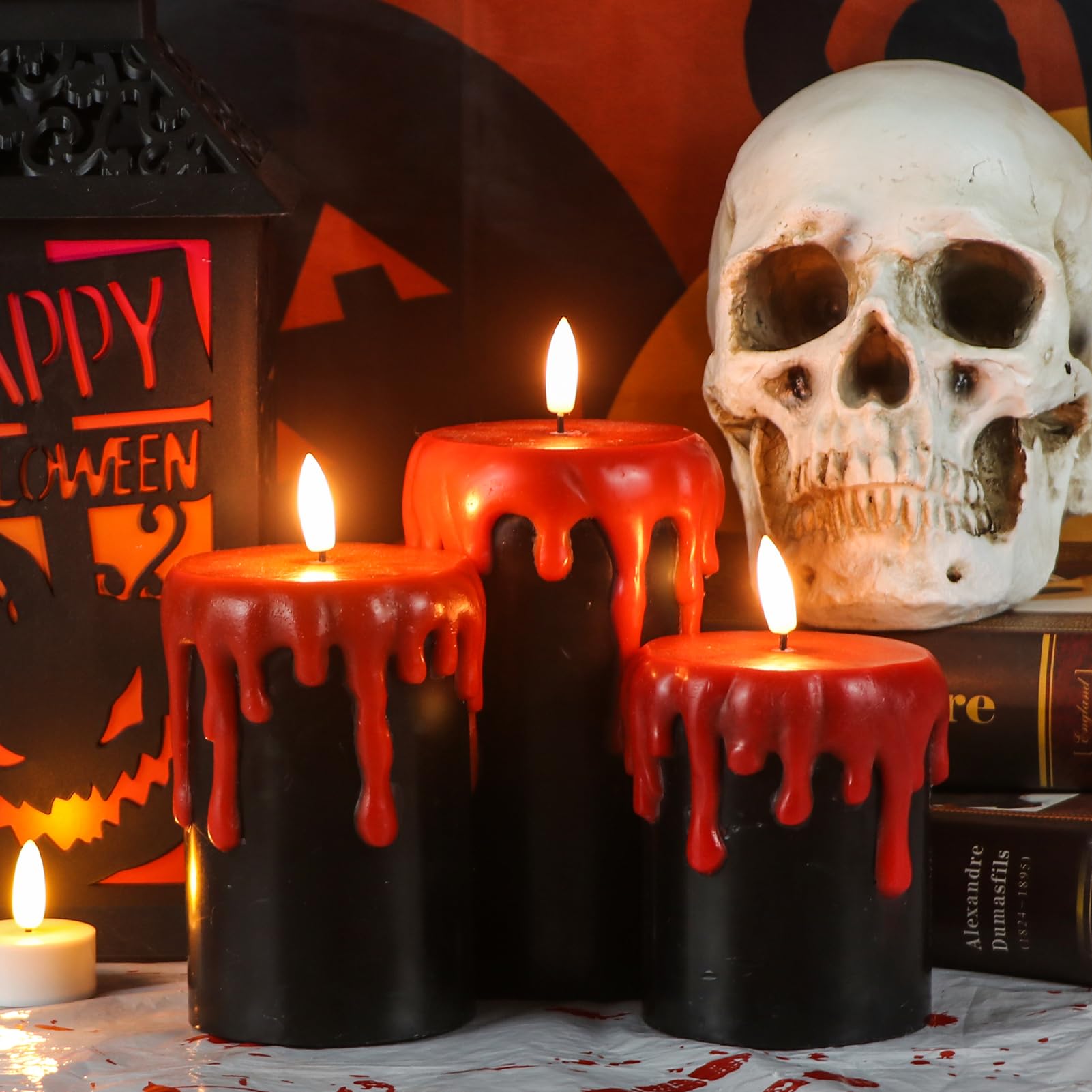 DRIPPING WAX EFFECT: All LED flickering candles are made by real wax with 3D wick flickering. Red real wax on candle top make them look like real candles blood dripping wax effect, adds a spooky atmosphere in your room