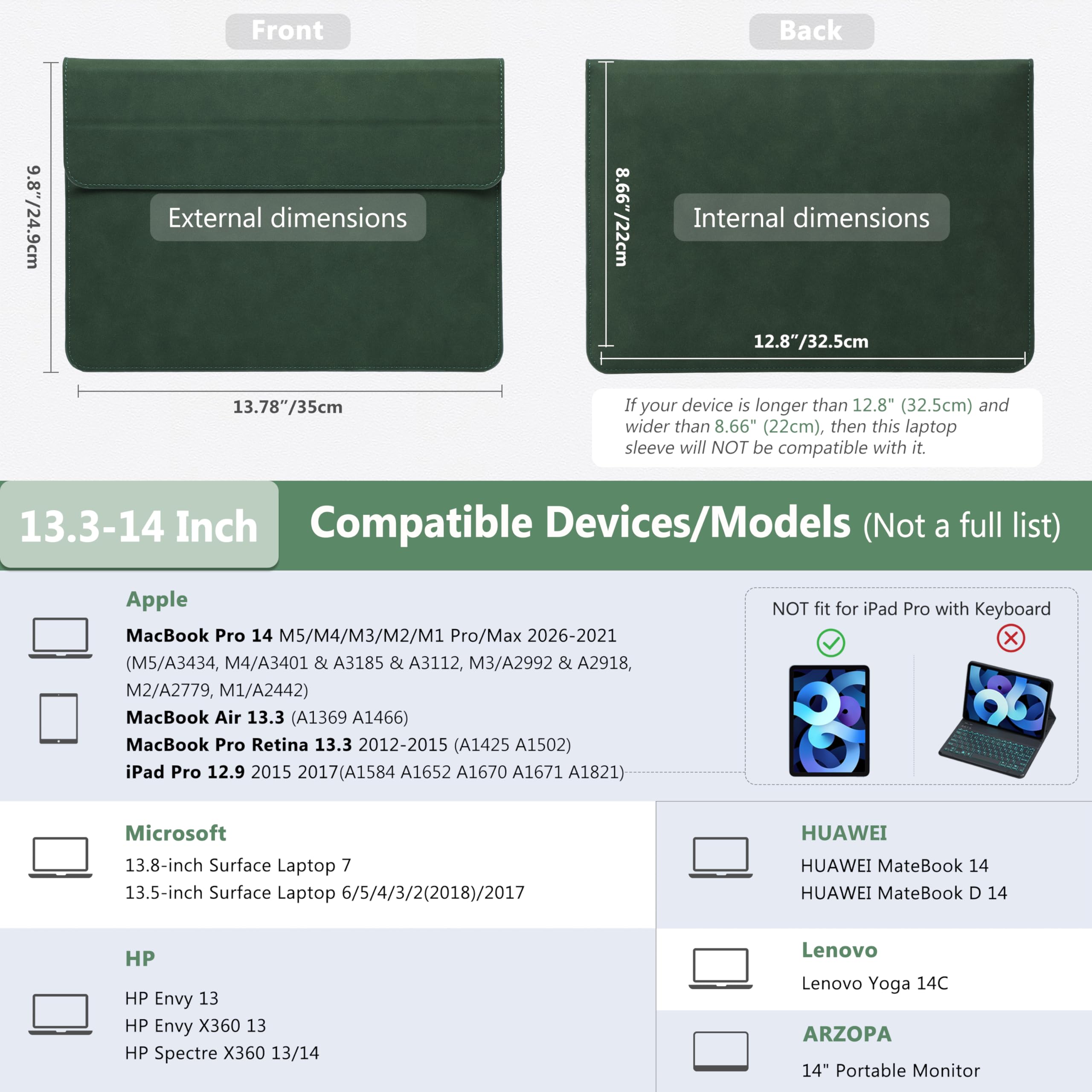 Internal Dimensions: 12.8" x 8.66" (32.5 cm x 22 cm). Compatible with 2026-2021 MacBook Pro 14 M5/M4/M3/M2/M1 Pro/Max (A3434, A3401, A3185, A3112, A2992, A2918, A2779, A2442), 13.8"/13.5" Surface Laptop 7/6/5/4/3/2 (2018)/2017, MacBook Air 13 2012-2017(A1369, A1466), MacBook Pro 13 2012-2015(A1425, A1502), iPad Pro 12.9-inch 2nd/1st Gen. 2017 2015, HP Envy 13, HP Envy X360 13, HP Spectre X360 13/14, Huawei MateBook 14, Lenovo Yoga 14C, Lenovo Yoga 720/910/920, etc.