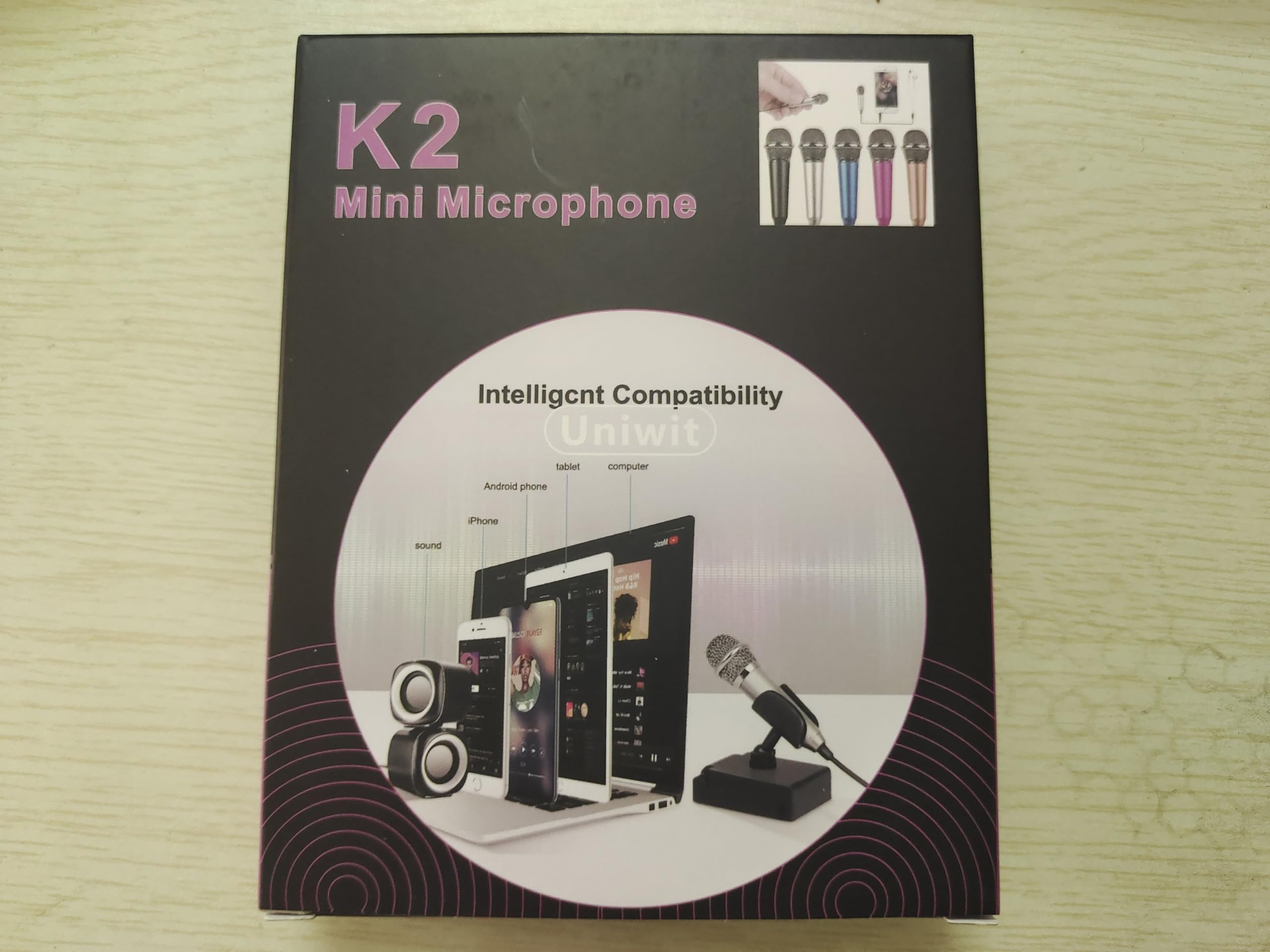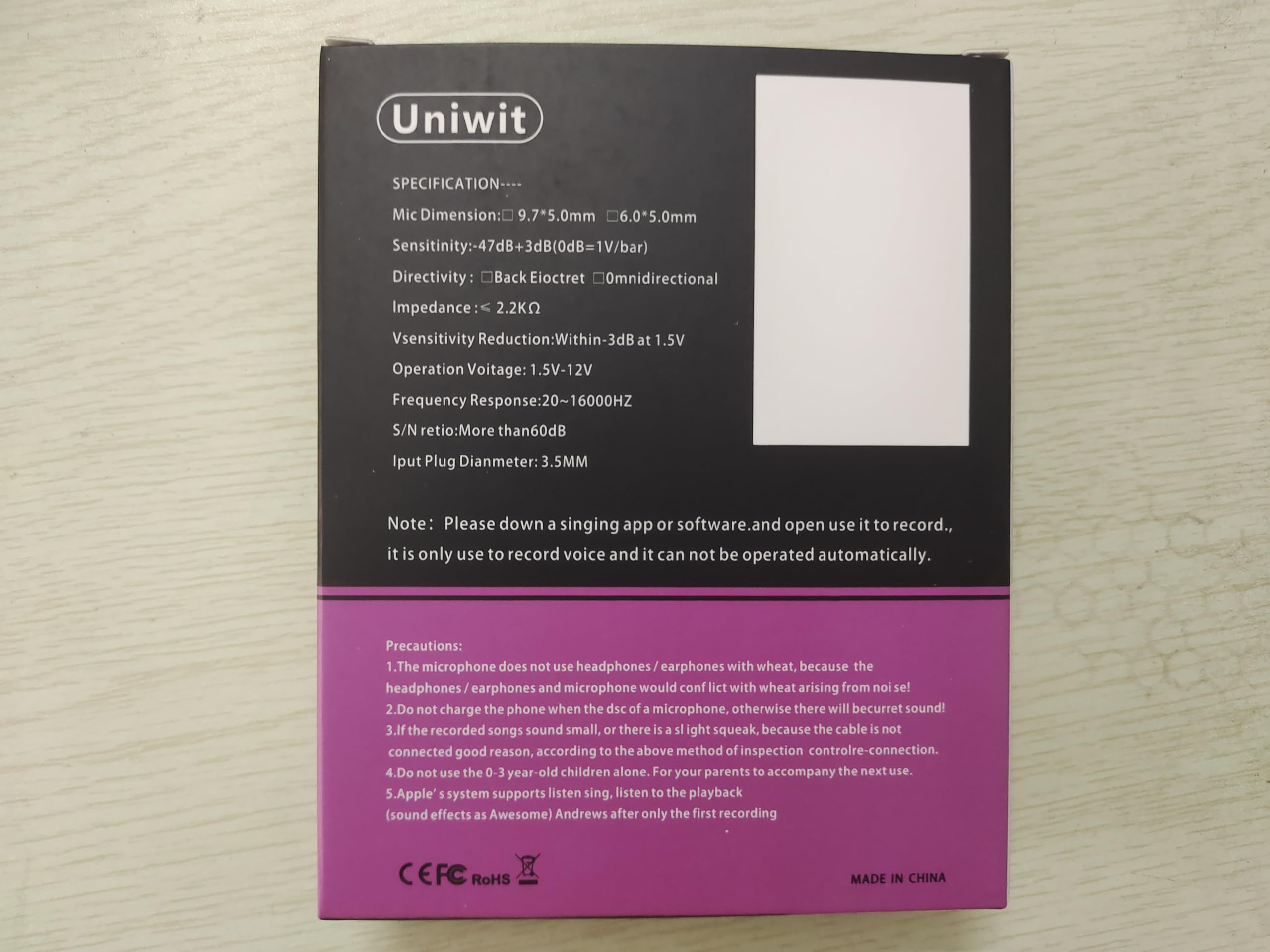 Uniwit Mini Portable Vocal/Instrument Microphone for Voice Video Recording Singing,Vlogging, Podcasting, Tiny Microphone for iPhone Android Phone Computer Latop Notebook Tablet iPad Instructions of microphone Plug and Play: Interface: Work with any 3.5mm-equipped device(Cellphone, Tablet, PC). Headphone Connection. When microphone is put on,the amplified mode of phone will beautomatically turned off, headset plugged in will be working directly. No 3.5mm interface? For iPhone/ Android users, an adapter is required if your device doesn't have a 3.5mm interface. Specification: Use:Mobile Sing;network recording CONDENSER MICROPHONE. Unidirectional Frequency Response:30HZ~20KHZ Ourput Impedance:<200¦¸ Sensitivity:-30dB+/-3db(0dB=1V/PA AT 1KHZ) Power:3V Interface:3.5M(Work with any 3.5mm-equipped device). Wiring lenghth:~1.5M Package: 1 * Mini Microphone 1 * Stand For Microphone