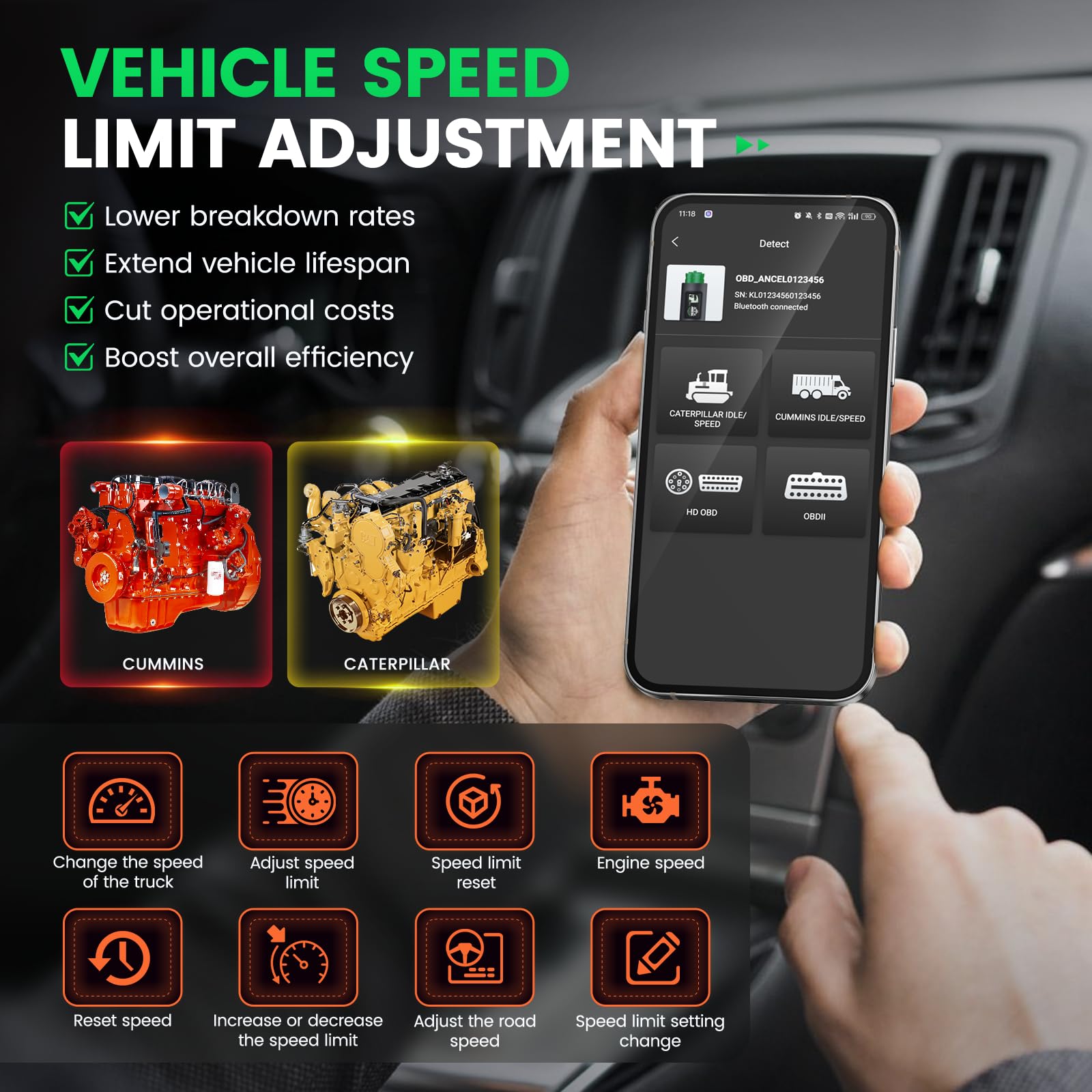 ăFlexible Speed Adjustment ToolăMeet the HD200 diesel scan toolâa pocket-sized game-changer for engine speed adjustments! Say goodbye to restrictive speed limits and fine-tune your engine settings to match your needs. If your engine isnât running smoothly or a cylinder misfires, itâs time to make some adjustments, you can easily set your truckâs maximum speed in compliance with local traffic laws, ensuring safety on the road and even saving on insurance costs. Smart driving, legal cruisingâitâs time to take control with the HD200 heavy duty truck scanner