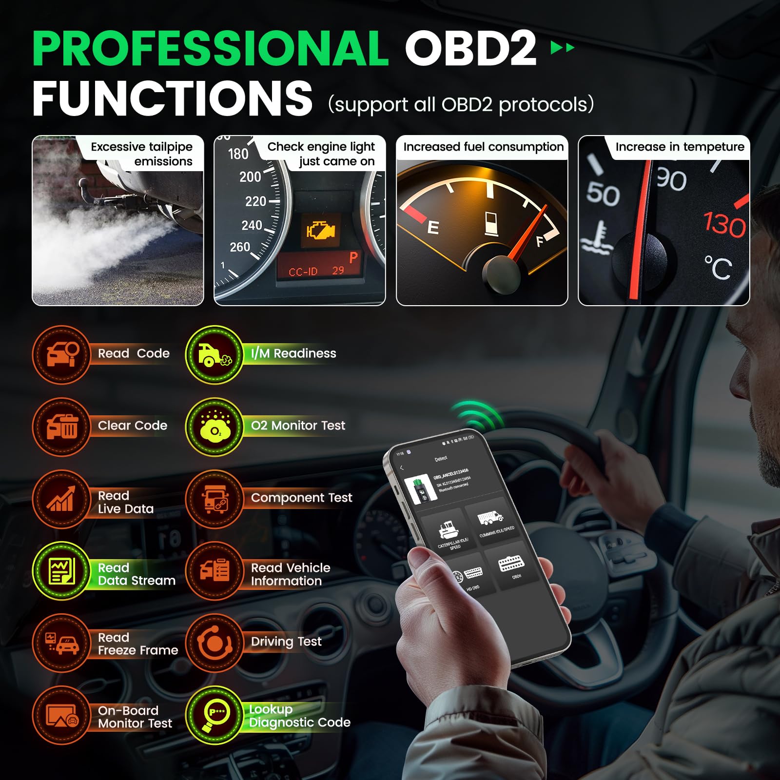 đ©Everything you need to understand is in one place: The HD200 heavy duty truck scanner isnât just another truck scannerâitâs your ultimate roadside lifesaver. Unlike clunky competitors, its sleek Bluetooth dongle design is compact, portable, and ready to tackle emergencies anytime, anywhere. With just one use, it practically pays for itself!User-friendly and straightforward, the HD200 diesel scanner diagnostic tool helps you nip minor issues in the bud before they snowball into costly repairs. Itâs engineered to support speed limit adjustments for Cummins and Caterpillar engines.Youâll enjoy lifetime free software updates and version upgrades