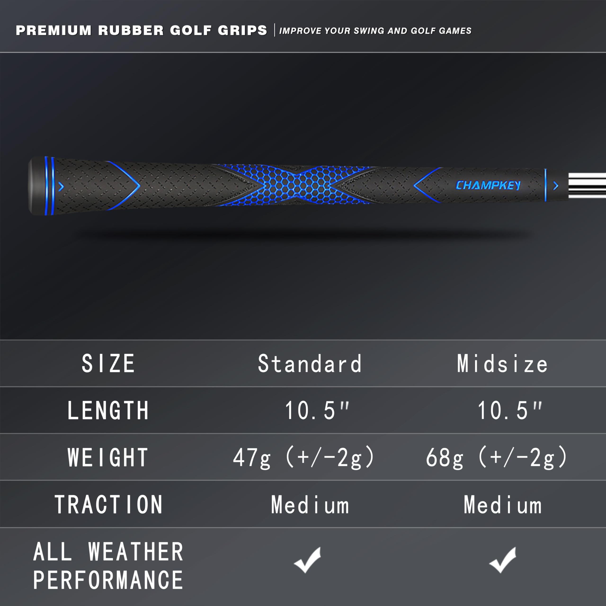 Package Includes : 13 * golf grips , 15* golf tapes ,1 * champkey grip tape spray solution,1*rubber vise clamp,1* grip blade.