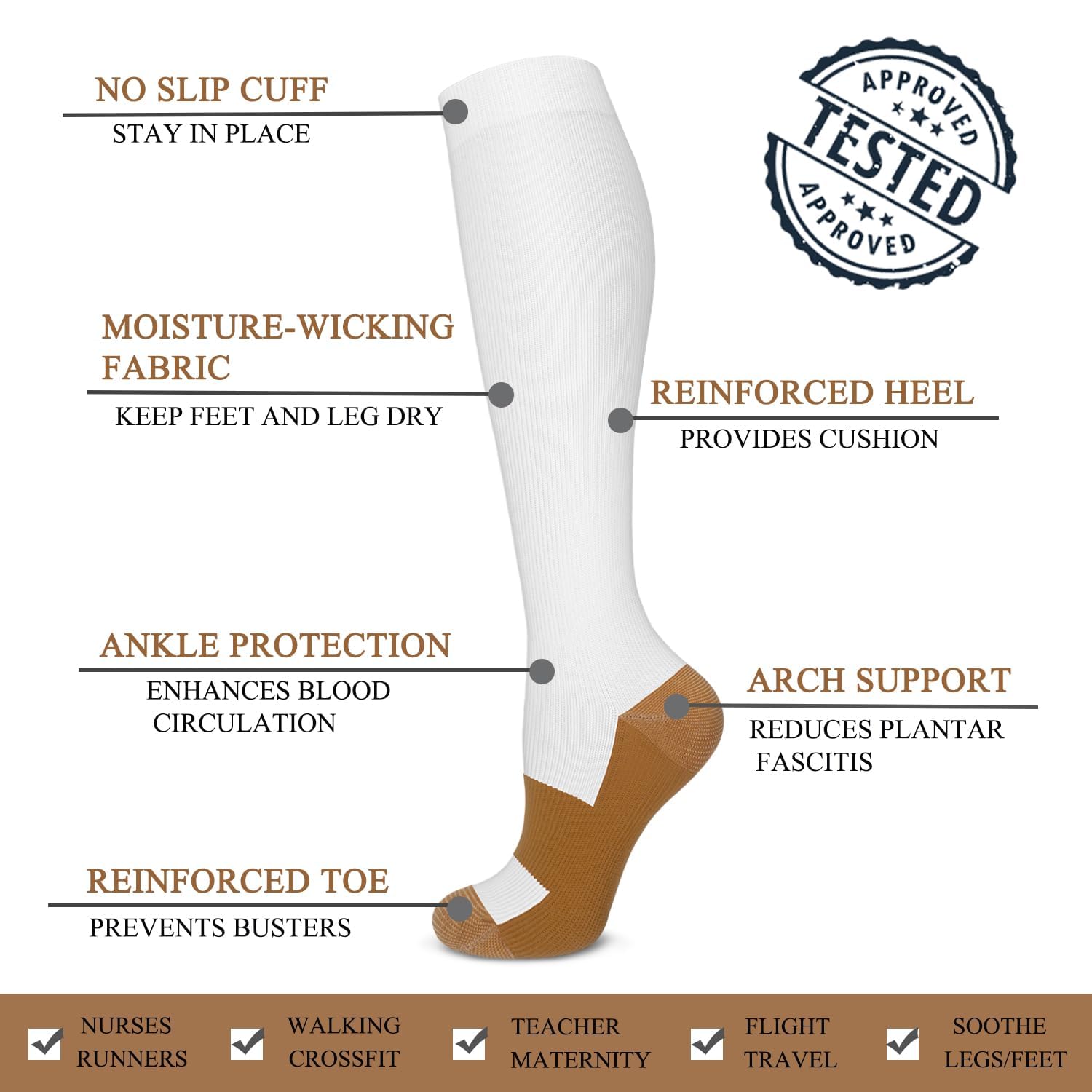 Knee-high design with a secure calf fit offers consistent coverage and support, making these compression stockings suitable for nurses, office staff, travelers, and people who spend long hours on their feet or moving throughout the day.