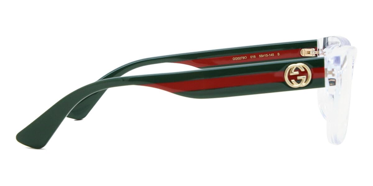 Description Gucci GG0278O eyeglasses includes the Gucci logo on the temple. These Gucci GG0278O plastic full rim rectangle shape eyeglasses are made for women.