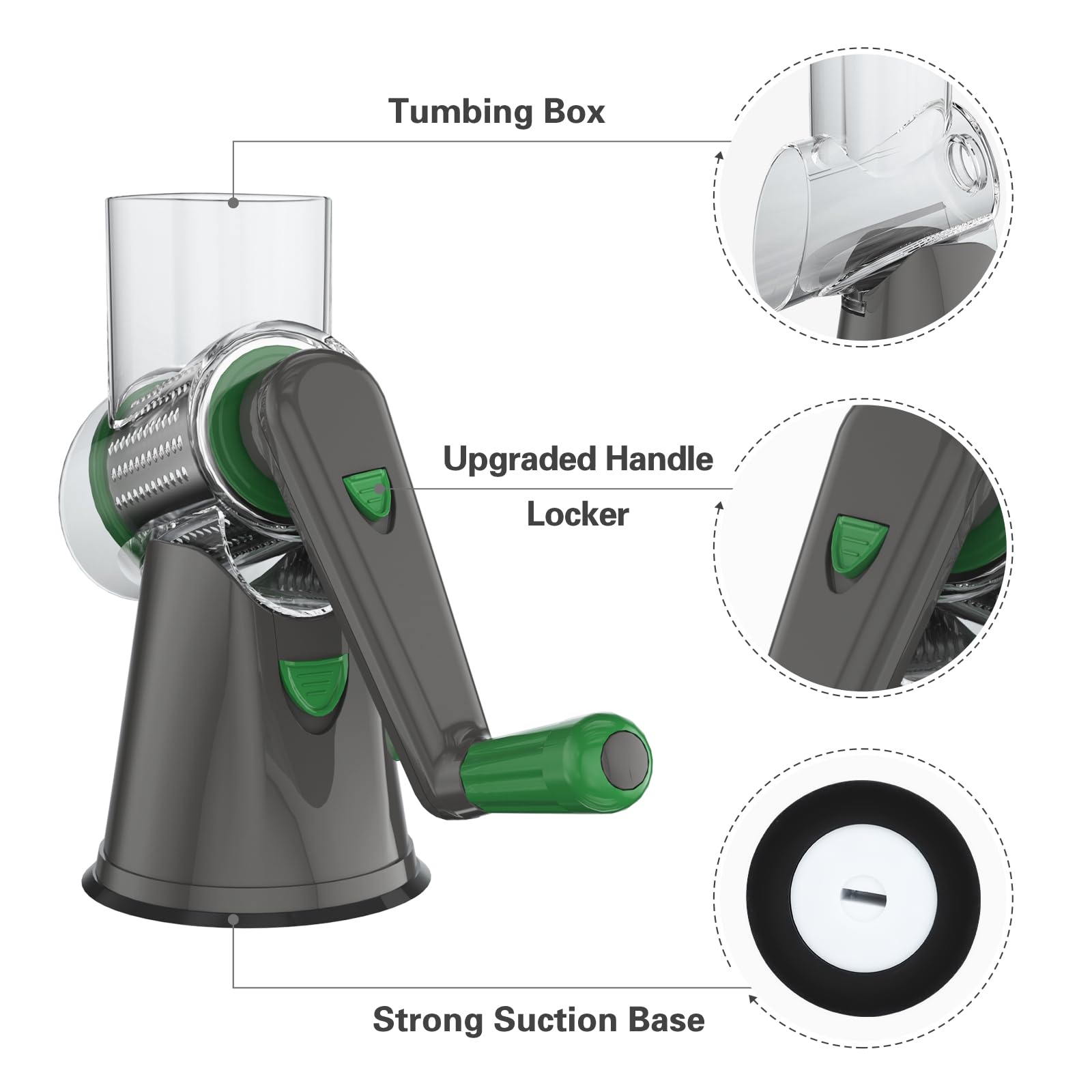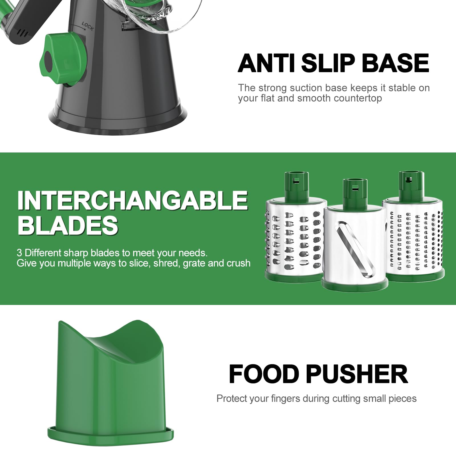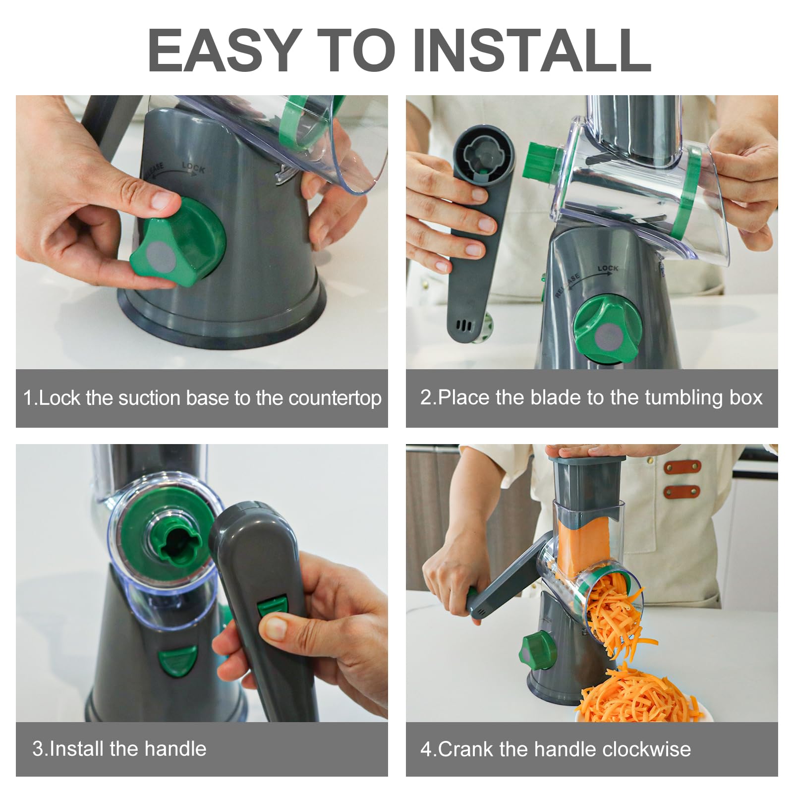 Three Blades: Coarse shredding blade, fine shredding blade with different diameter ; One slicing blades; A pound of cheese is only 30 seconds, avoid contact between fingers and blades