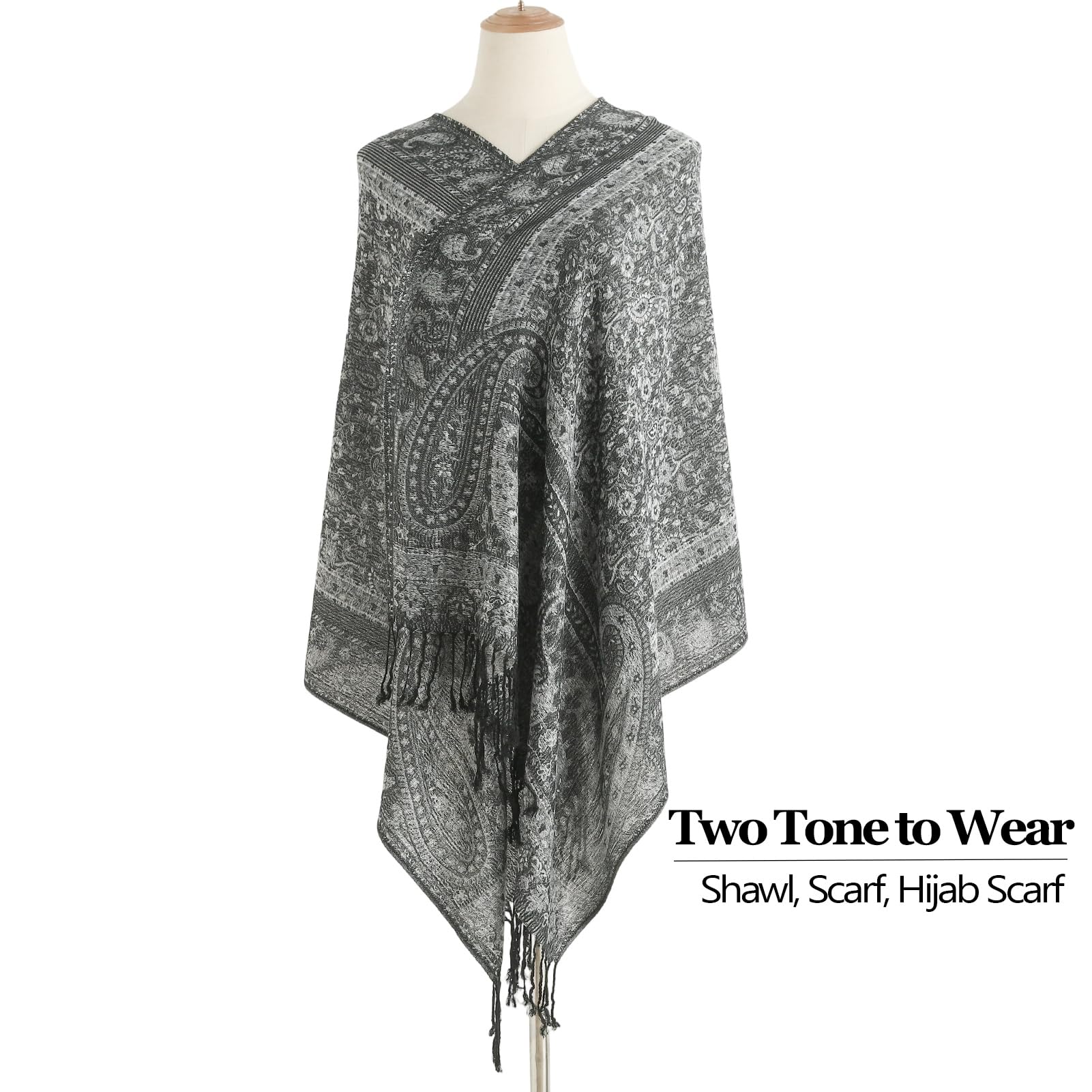 SOFT COZY FABRIC: --Our black silver pashmina scarf is made of 55% Viscose+45% Acrylic high quality fabric, delicate to touch, skin-friendly and breathable,Classic Durability