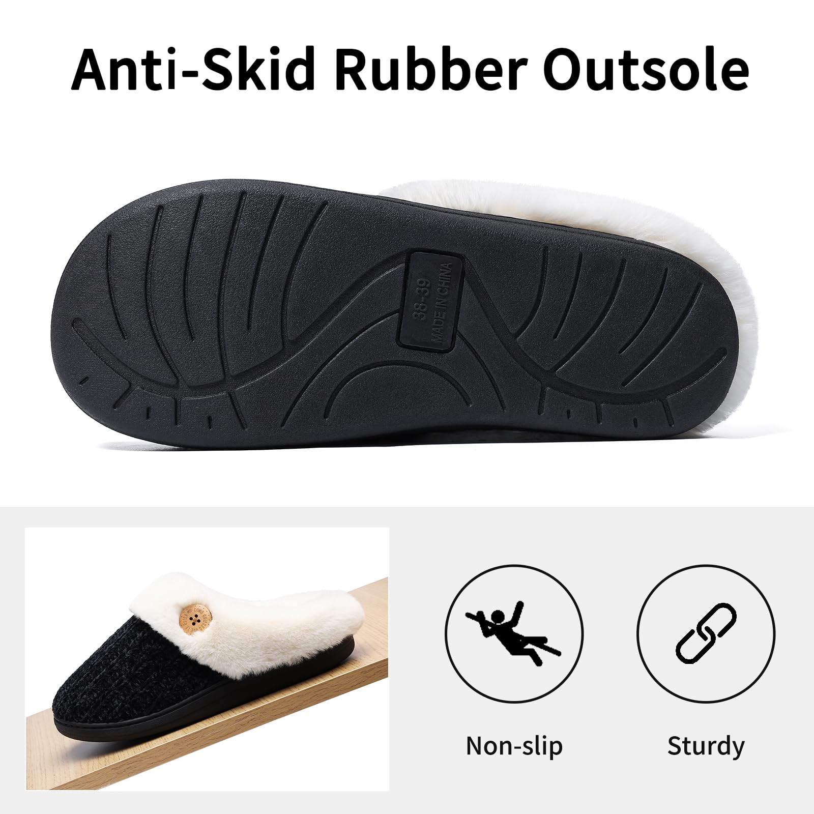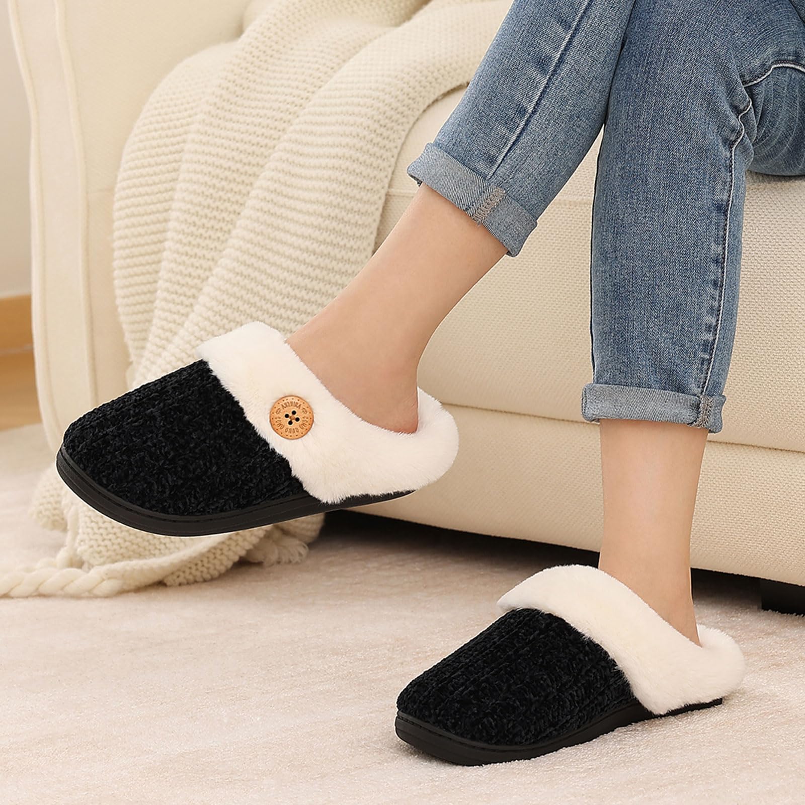 Women's Classic Knitted Slippers: Our women's slippers feature a breathable chenille knit upper gorgeously crafted with a thick inner lining of premium wool-like. Experience ultimate warmth and comfort while keeping your feet cozy.