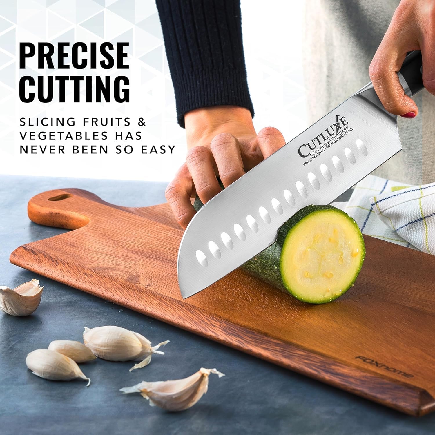 ALL-PURPOSE KITCHEN KNIFE - This santoku knife versatile design provides excellent control when chopping, dicing, mincing, or vegetables, poultry, roasts, and more.