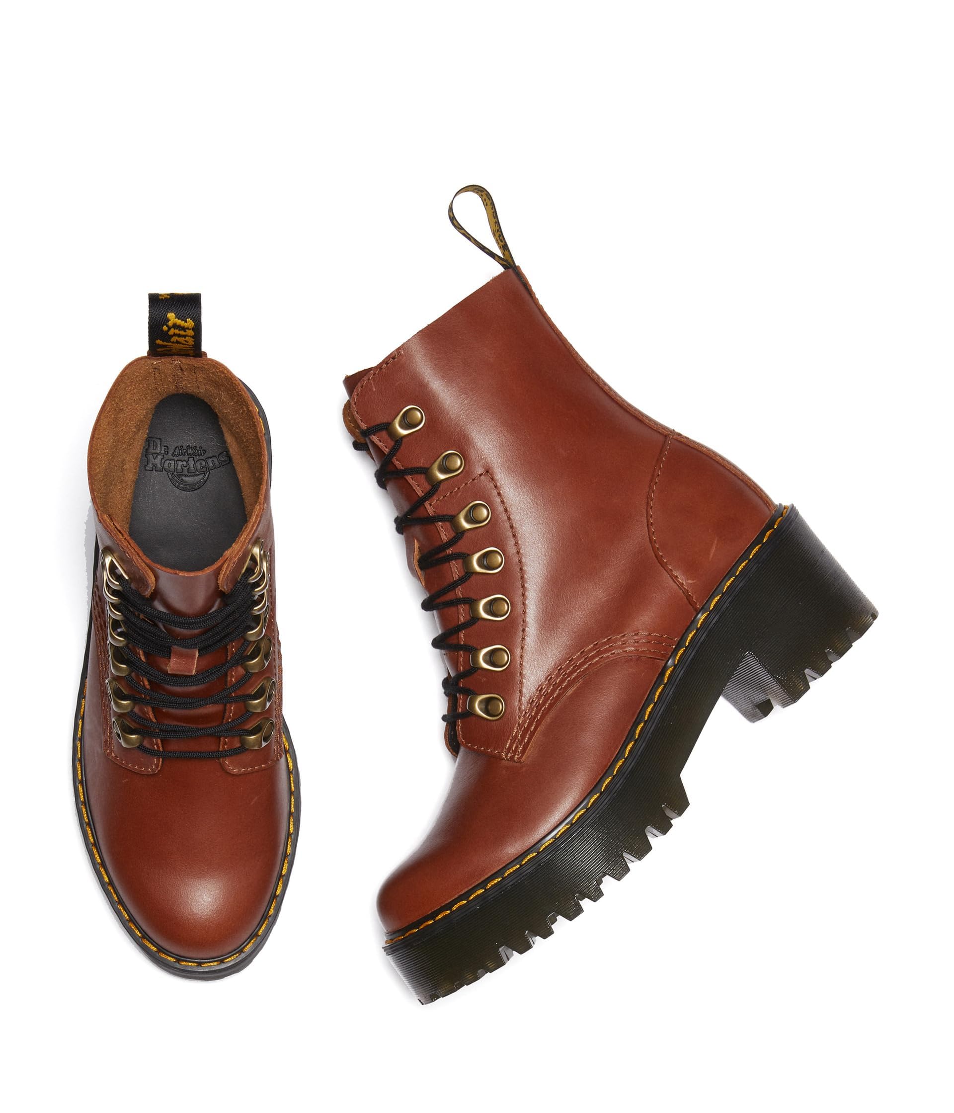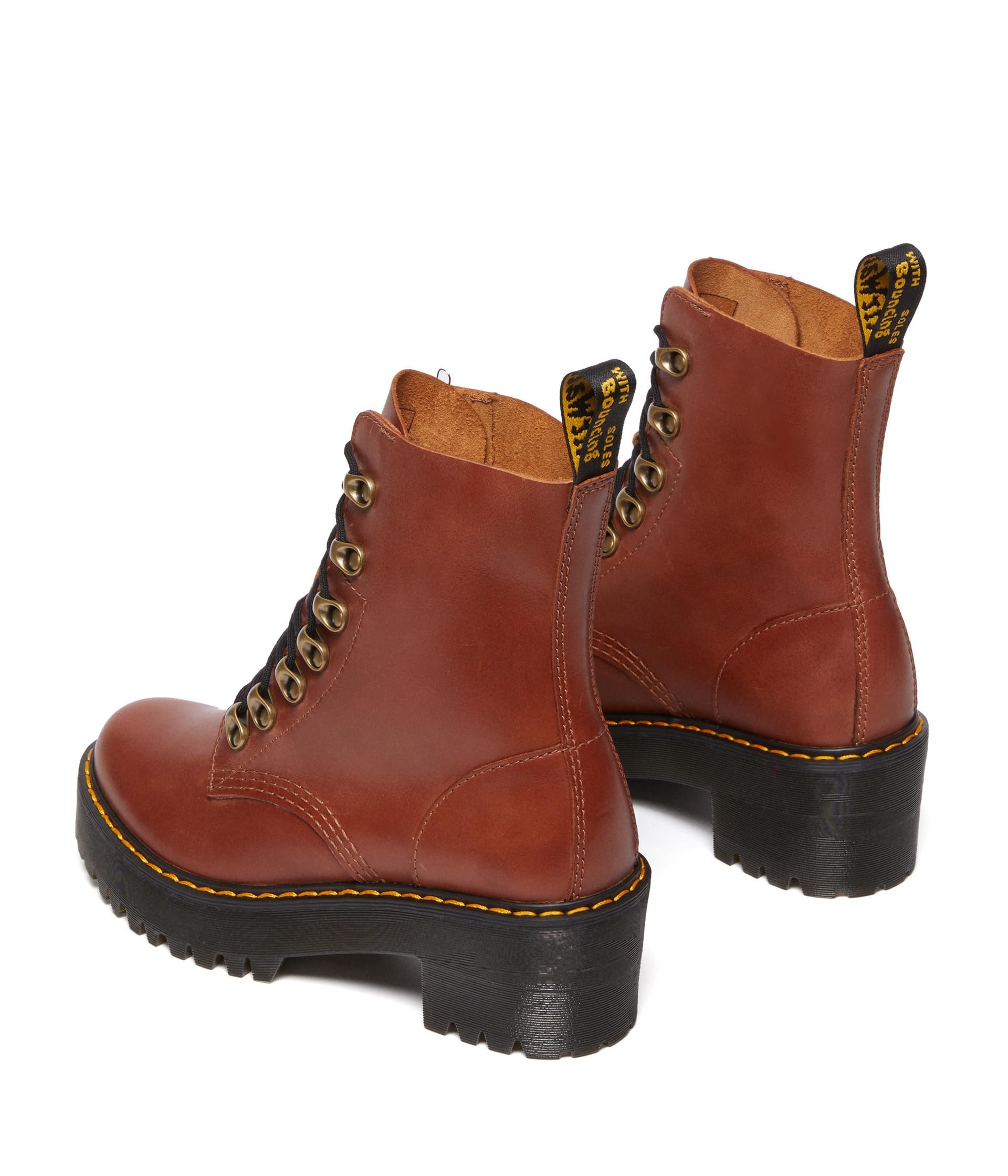 Description The leona boot is the perfect balance of femininity and the tough, rebellious Dr. Martens spirit. Featuring a high-profile silhouette, a chunky heel and antiqued brass eyelets, the women's boot is finished with hiking boot-inspired hooks and a branded heel-loop.