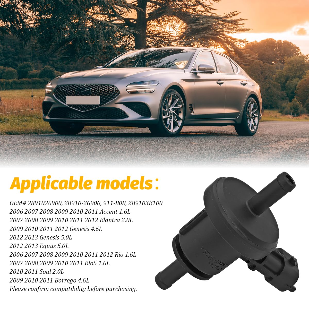 Wide Application: It is suitable for various vehicle models, including the 2006-2011 Accent 1.6L, 2009-2012 Genesis 4.6L, 2012-2013 Genesis 5.0L, and 2012-2013 Equus 5.0L. Corresponding to OEM#2891026900, 28910-26900, 911-808, 289103E100, with dimensions of 1.57x1.57x2.76 inches, it offers broad compatibility. Specific applicable models are listed in the description section.