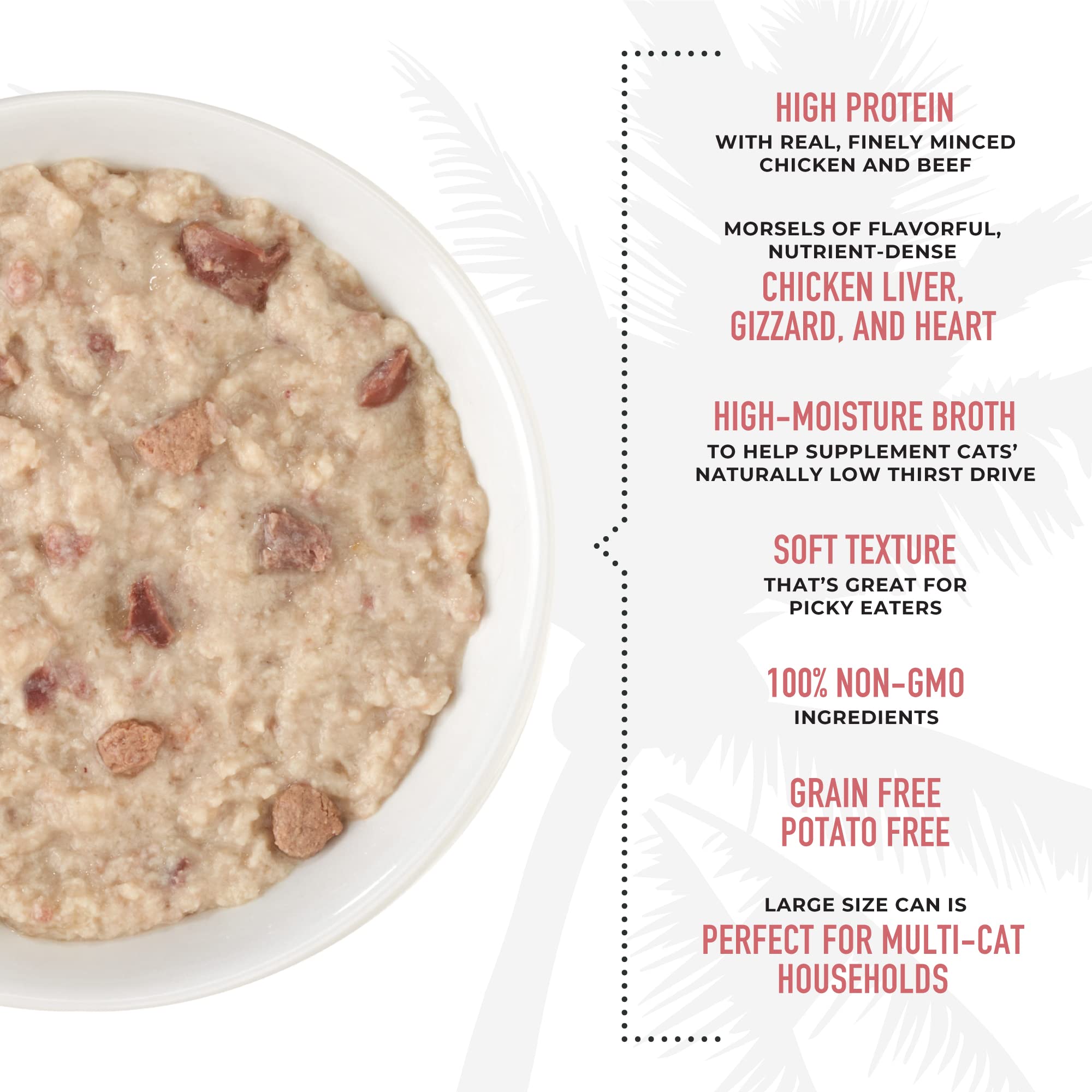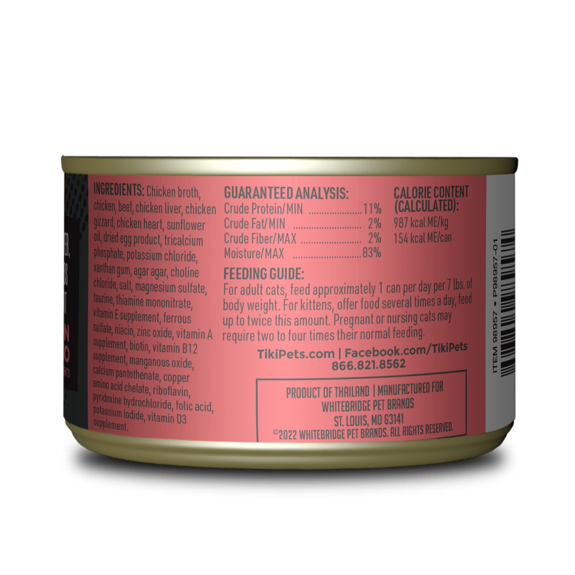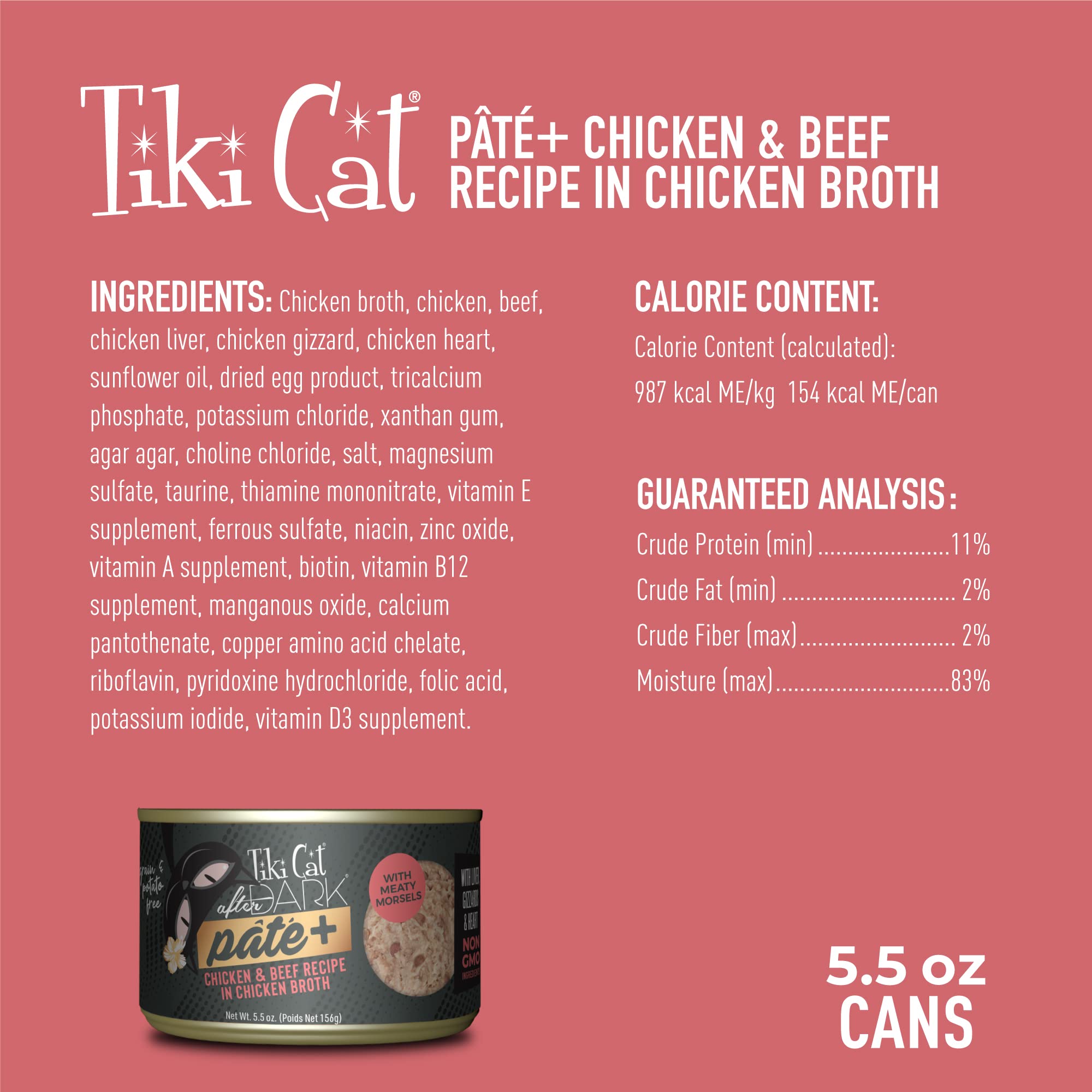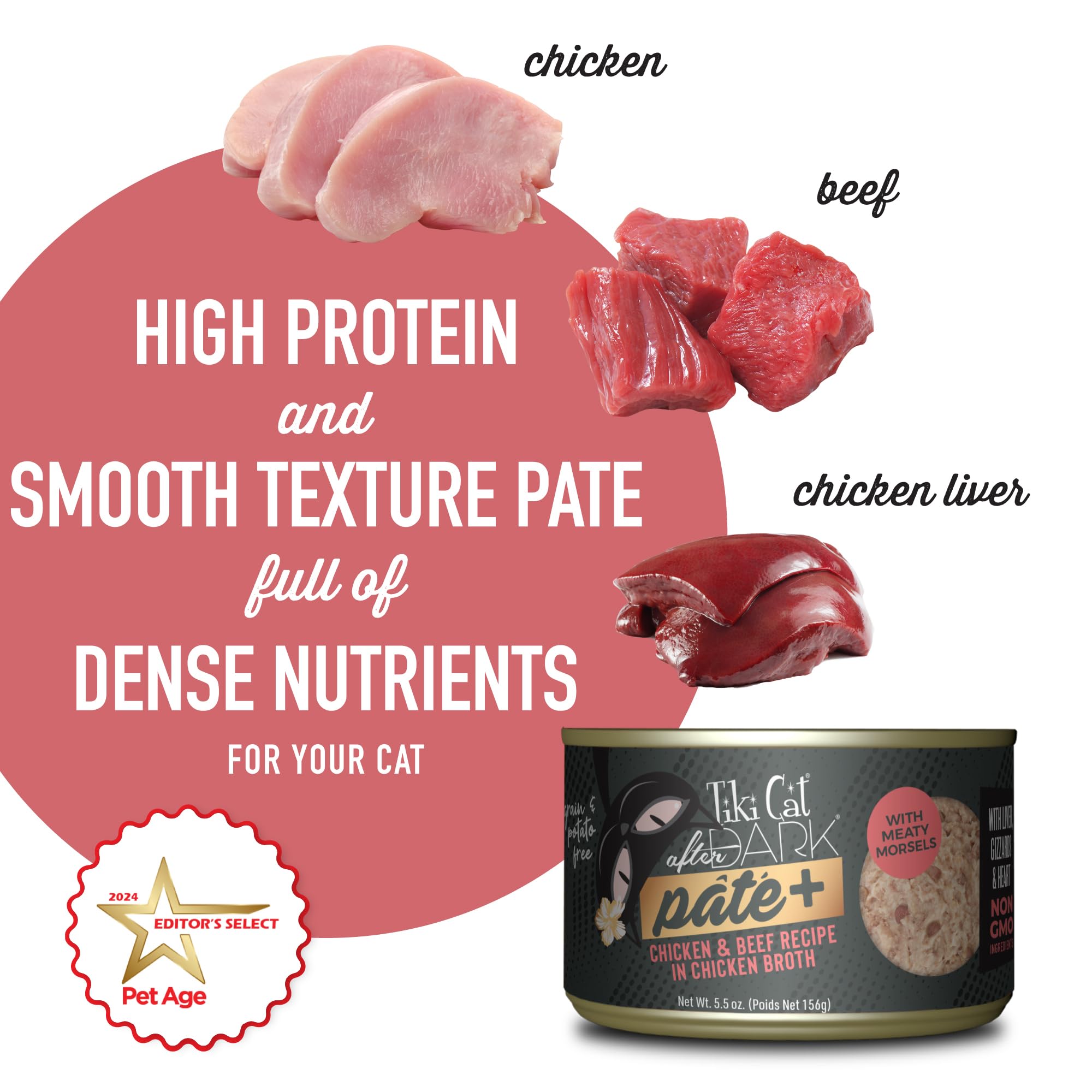 As obligate carnivores, cats have a natural instinct to hunt after dark and a nutritional need to eat meat. Tiki Cat After Dark Paté+ is a meat-lover’s dream, closely mimicking cats’ natural prey diets. Real, finely minced chicken and beef - plus meaty morsels of organ meat - are combined with savory broth for the soft texture cats love. Give your carnivore cat the meat they crave in this tasty, easy-to-eat meal!