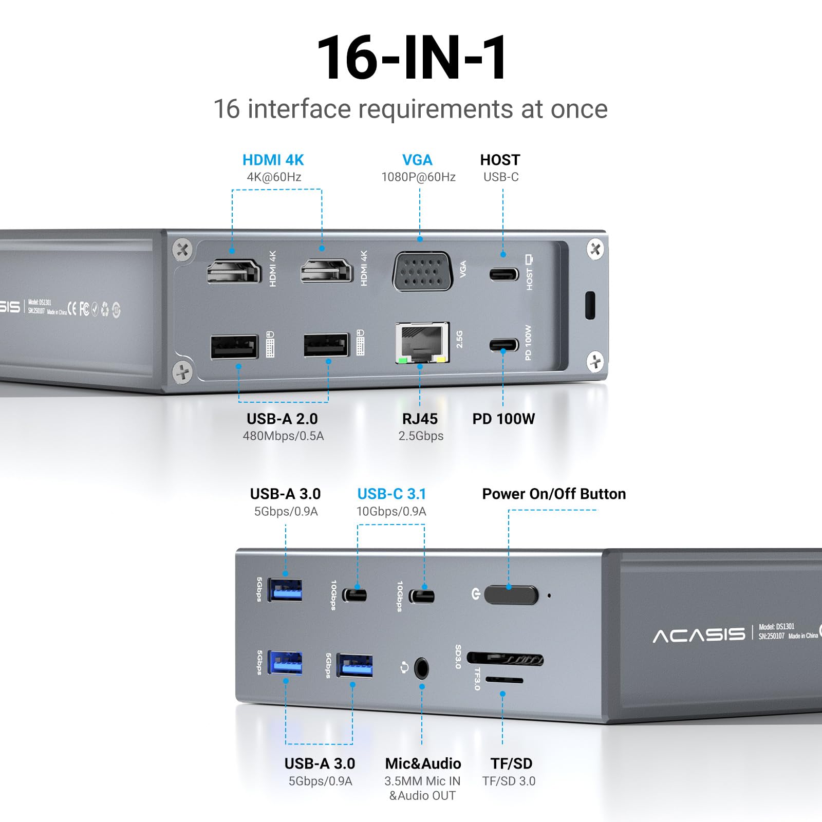 【Laptop Docking Station Dual Monitor】: This 16-in-1 usb c hub easily expands your laptop into a 16-port workstation, with 2*4K HDMI, 1080P VGA, 2*10Gbps USB C 3.1, 3*5Gbps USB A 3.0, 2*USB A 2.0, SD/TF card reader, 2.5Gbps RJ45 Ethernet,3.5mm audio and microphone, and PD 100W charging