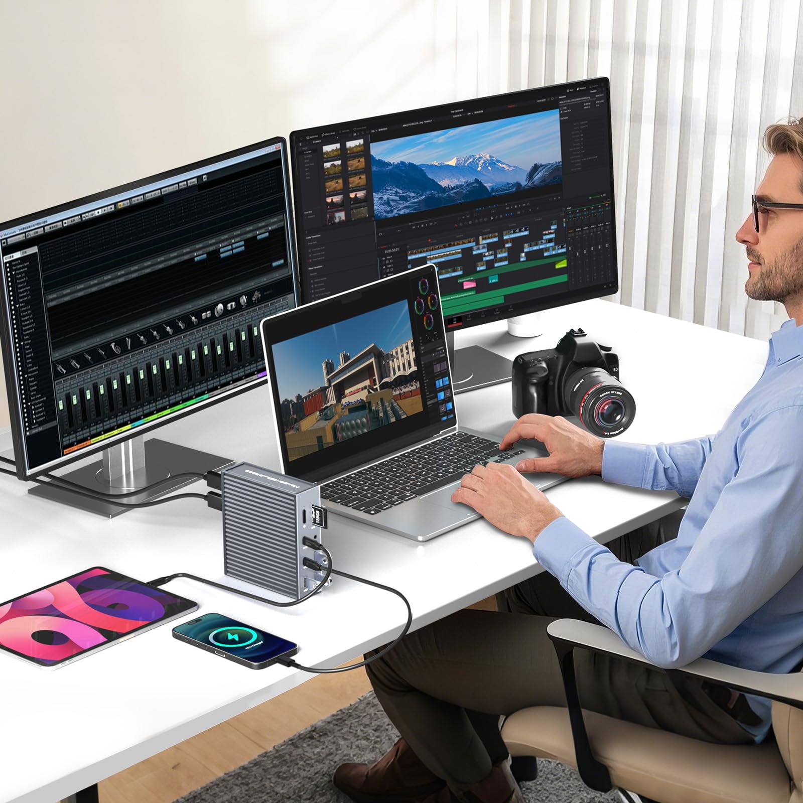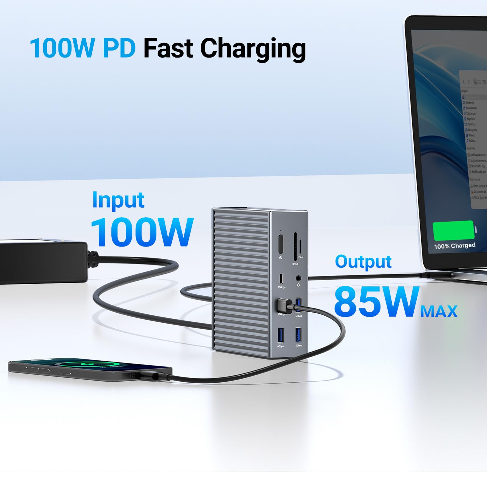 【PD 100W Fast Charging】:With 100W Charging USB C port, this usb c dock can charge your laptops/tablets/phone quickly when you using other ports.