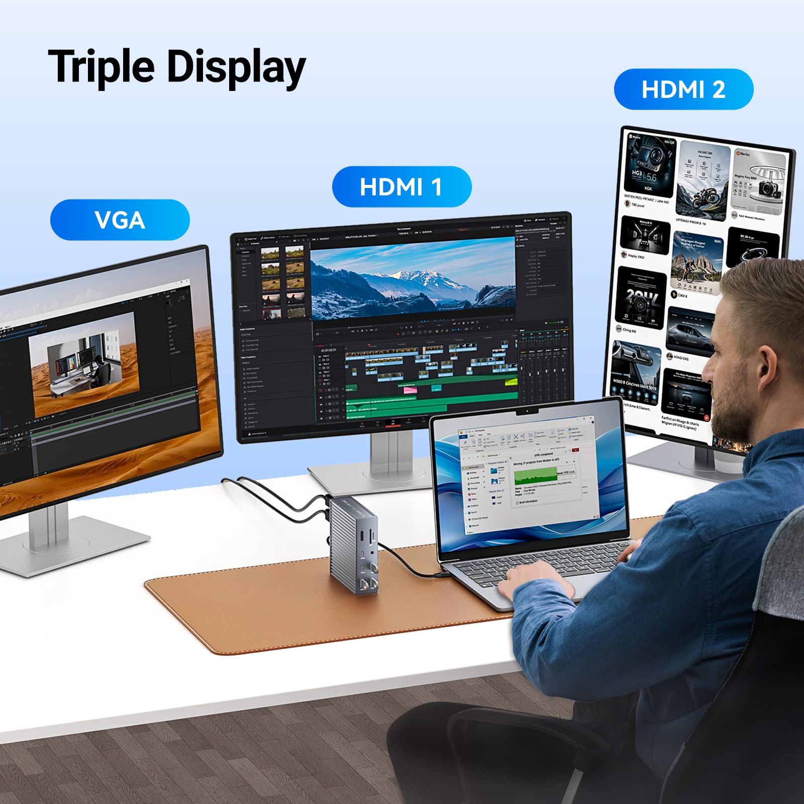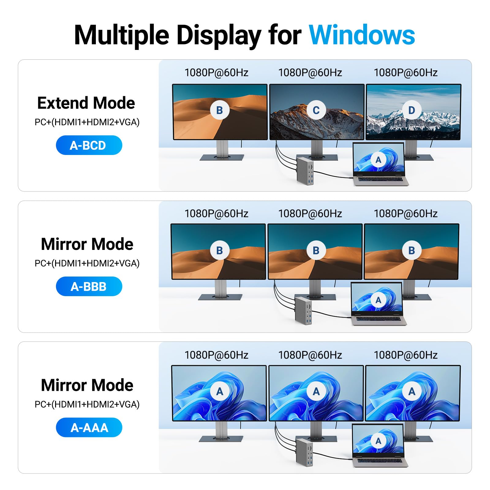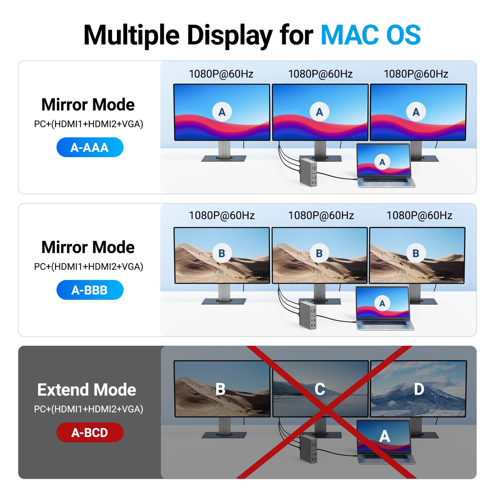 【Triple Display Docking Station】 : This 16 in 1 USB C Docking Station Dual HDMI Monitor supports single 4K display and triple 1080P 60Hz displays. ONLY Windows system support MST and SST(Mirror & Extend Mode). MacOS system DOES NOT support MST.