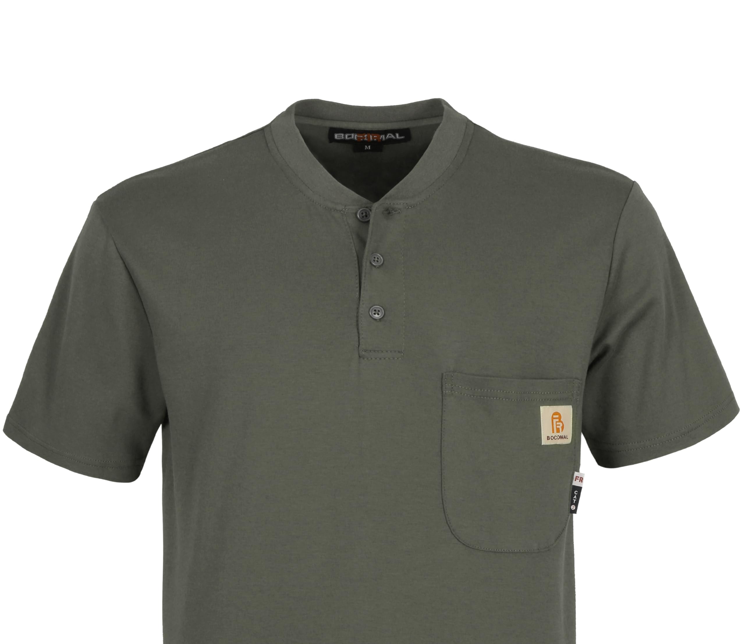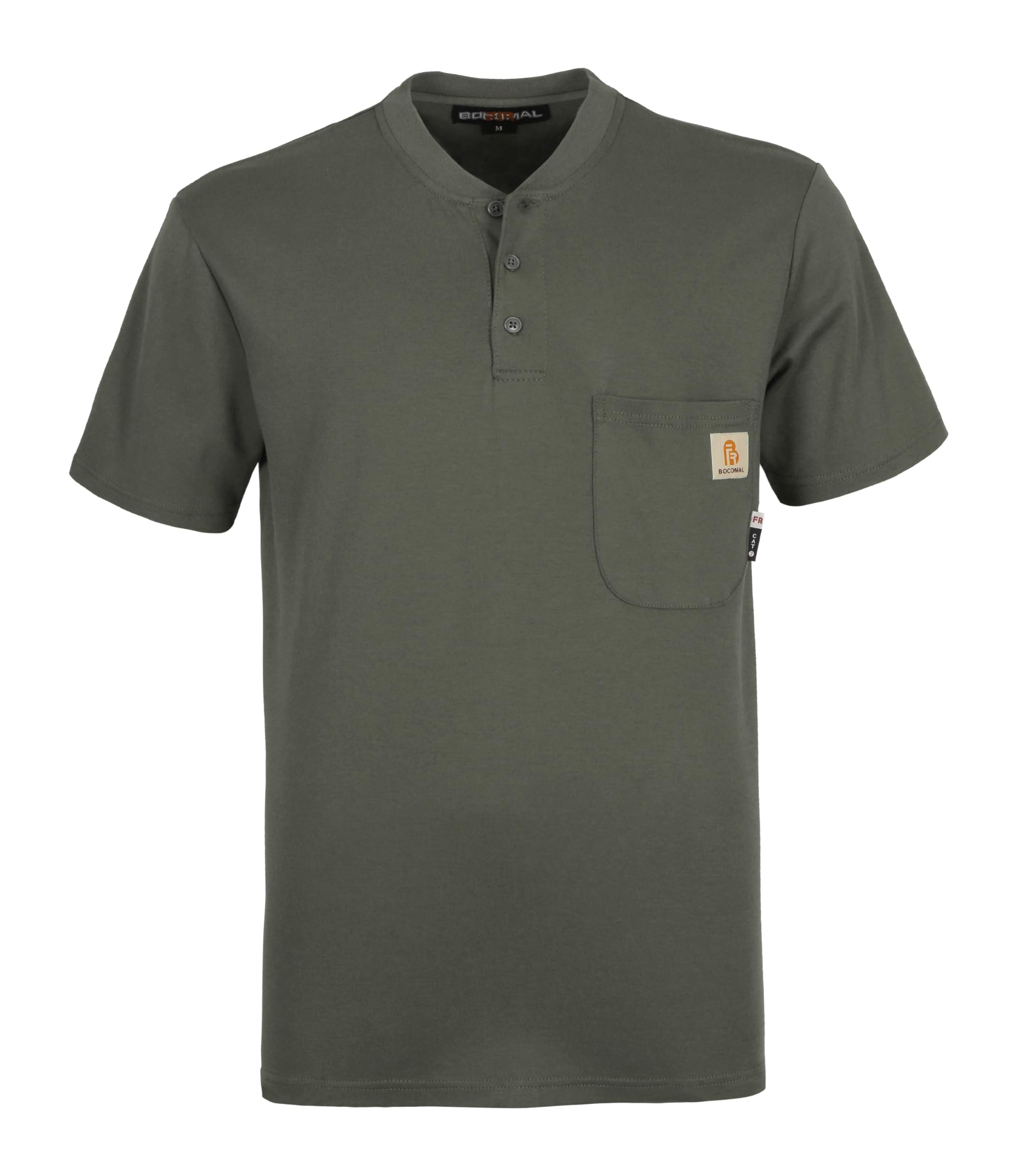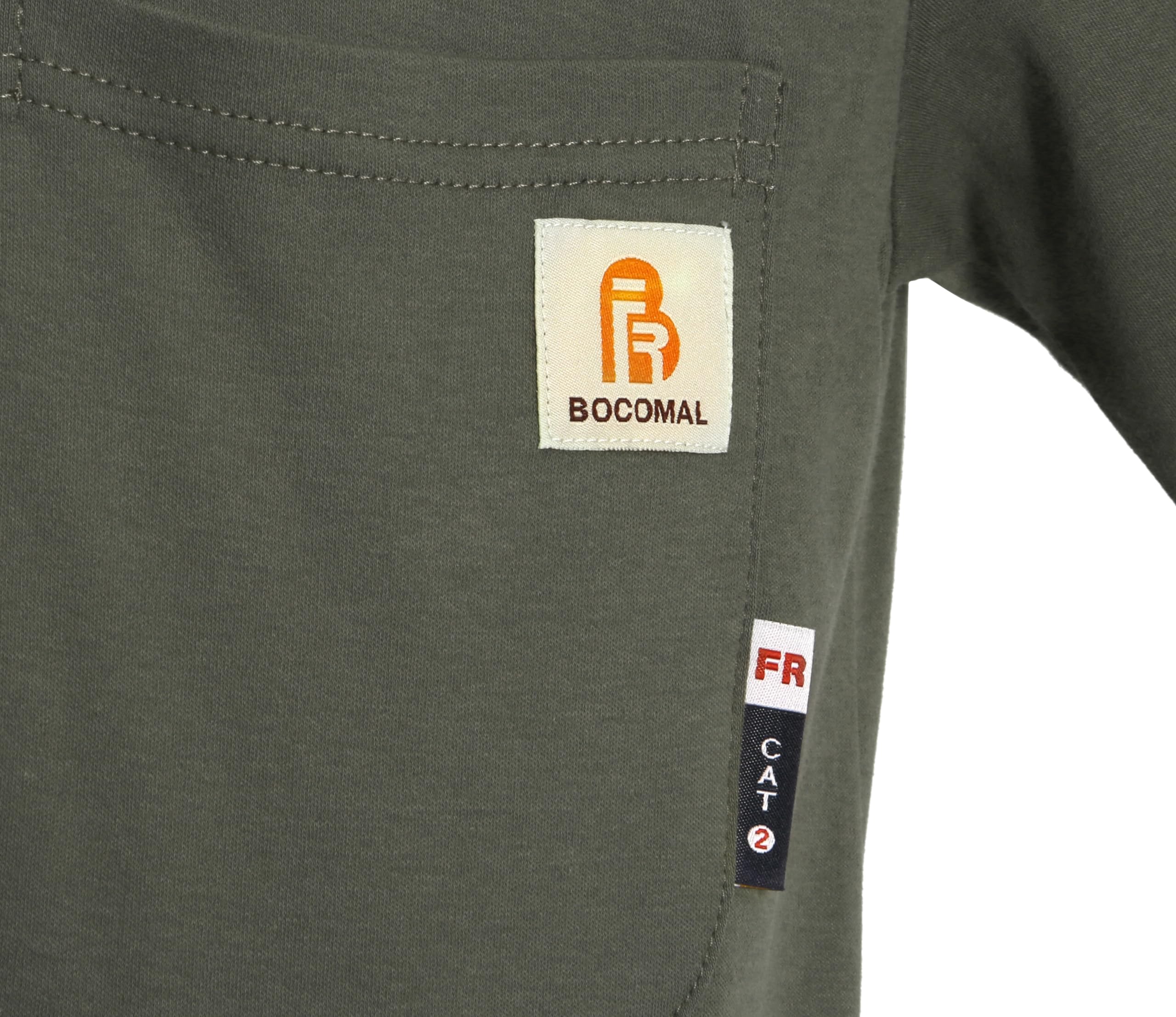 FR MATRIALS:5.5OZ Cotton Knit FR Treated,FR Buttons,FR Sewing Threads!Clear FR Tag on arms and bottom front.More FR info On Neck Tag About UL Certification.We Attached A Small Sample Inside Package For Cunstomers Simple FR Try