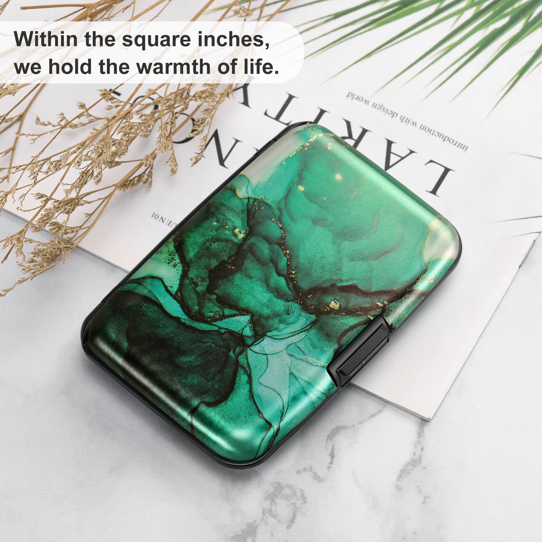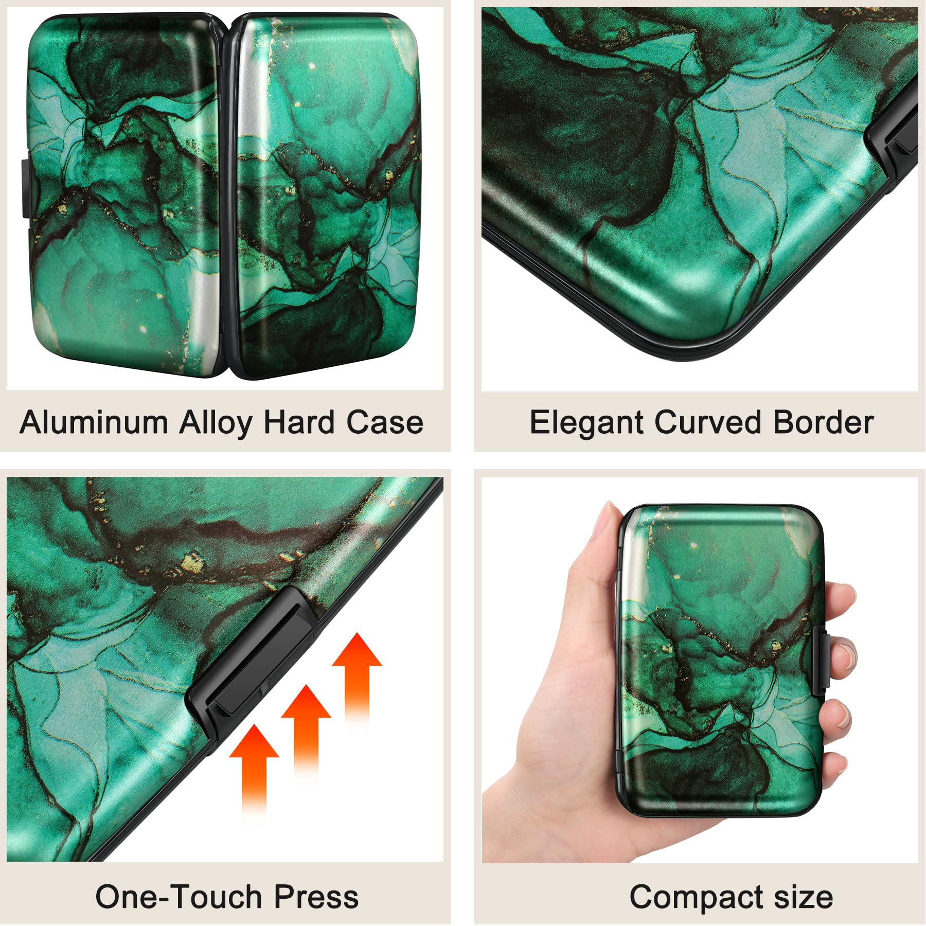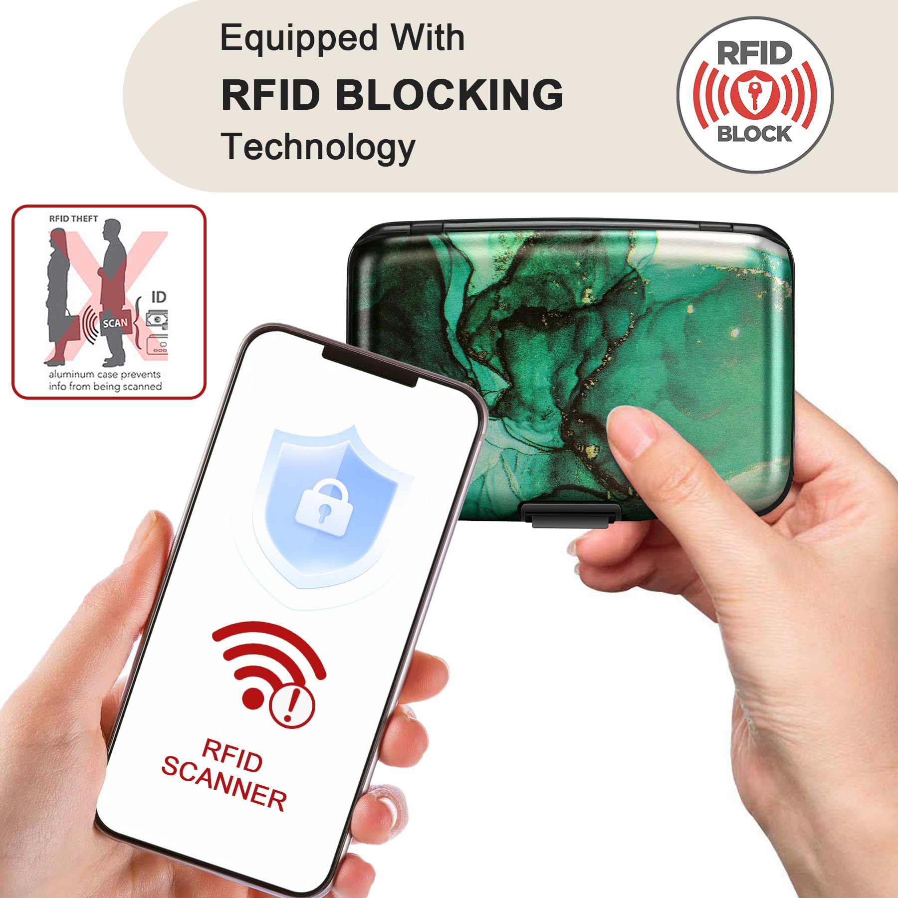 This credit card holder is made of aluminum shells, ABS plastic frame and clasp closure, RFID-blocking will protect your card data from RFID scanners and readers.