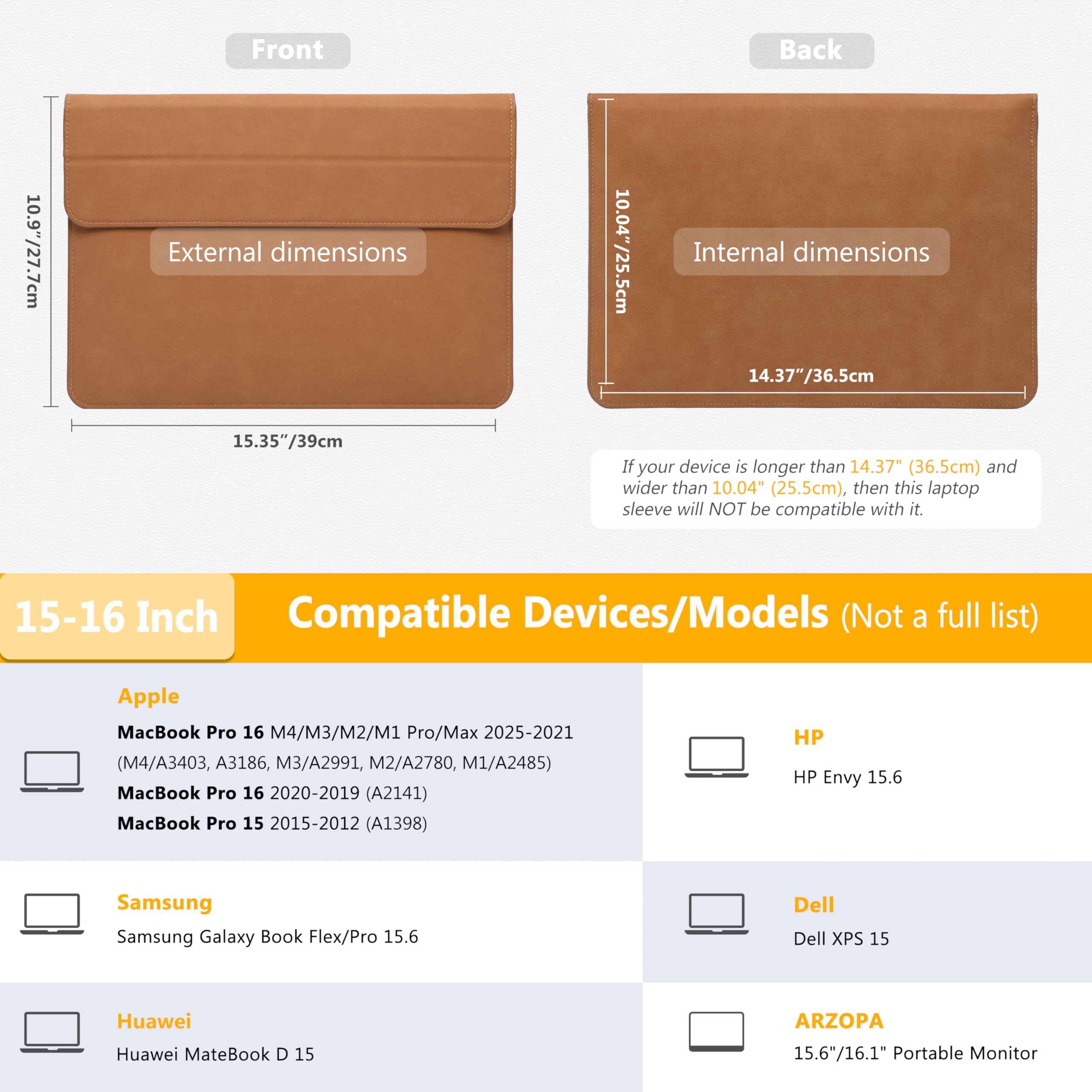 Internal Dimensions: 14.37" x 10.04" (36.5 cm x 25.5 cm). Compatible with MacBook Pro 16 M5/M4/M3/M2/M1 Pro/Max 2026-2019 (A3428, A3429, A3403 A3186 A2991 A2780 A2485 A2141), Compatible with MacBook Pro 15 2015-2012 (A1398), Compatible with Dell XPS 15, Compatible with HP Envy 15.6, Compatible with Huawei MateBook D 15, Compatible with Samsung Galaxy Book Flex/Pro 15, Compatible with ARZOPA 15.6"/16.1" Portable Monitor, etc.