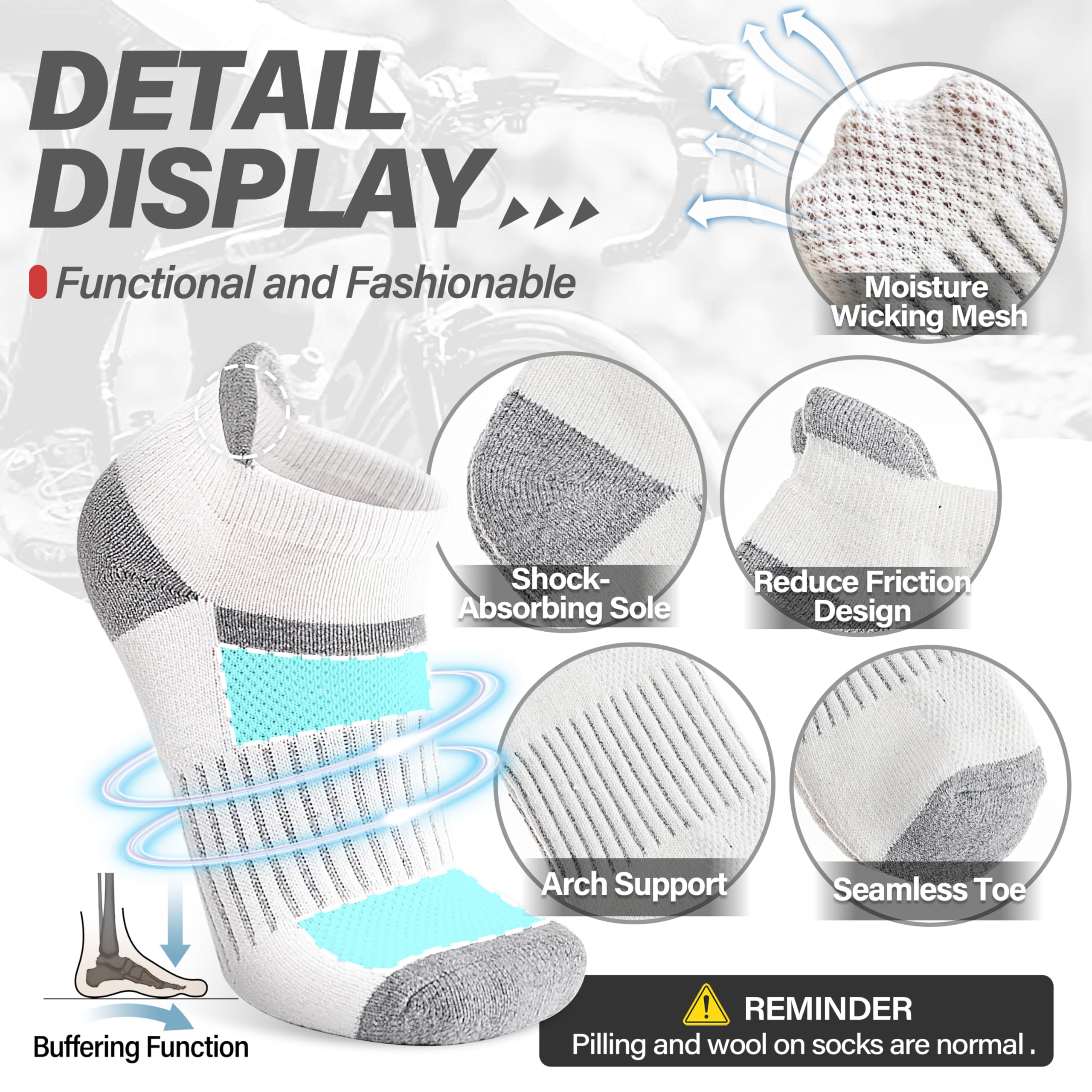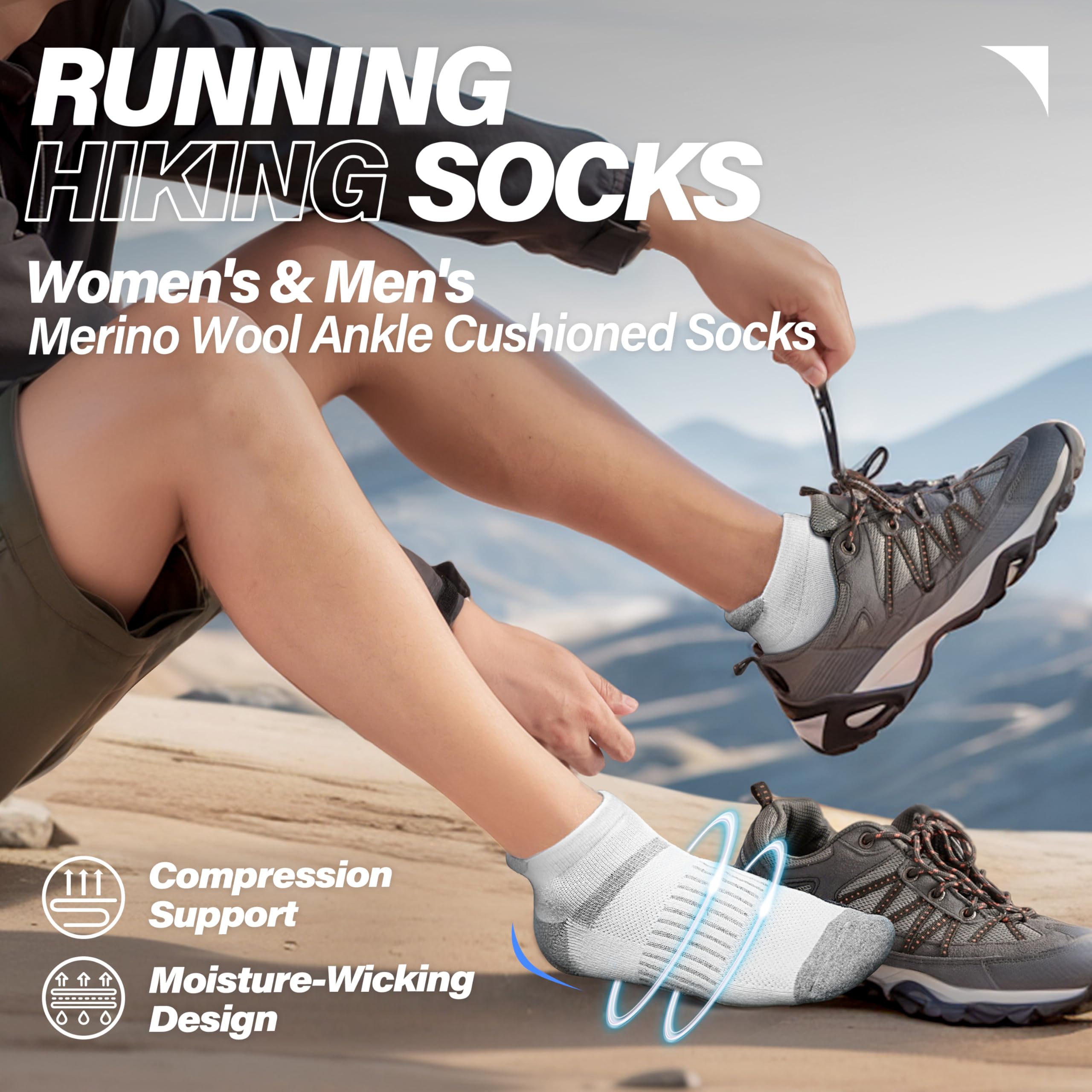 PROTECTION FOR FEET - These womens wool running ankle socks have stretchy cuff and arch support, which can have great compression support to reduce fatigue, protect the Achilles tendon, improve the blood circulation, and keep socks fit snugly. Cushioned sole absorbs shock and reduces risk of blistering. Pull tab resist abrasion and prevent slipping. All of these provide more protection for your feet.