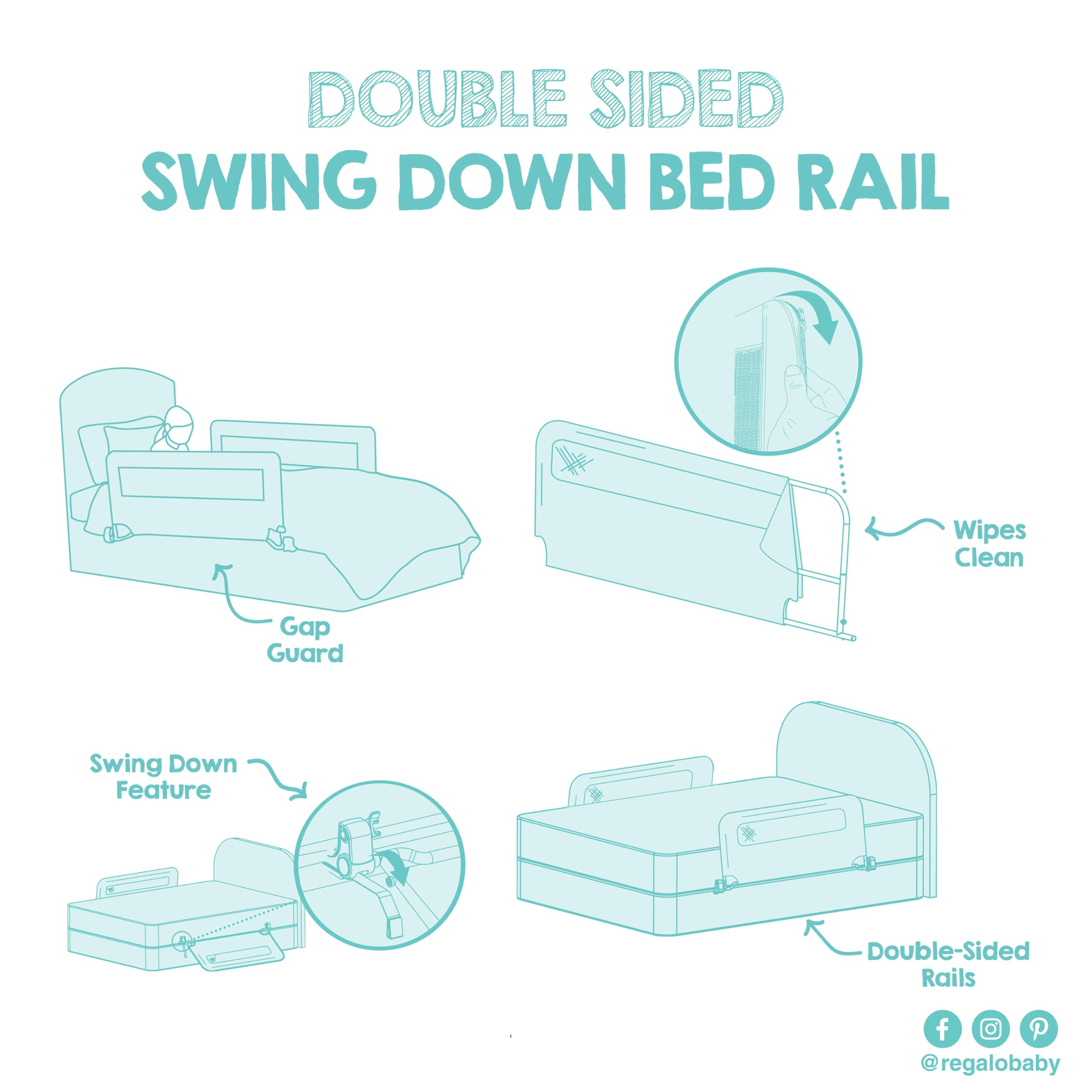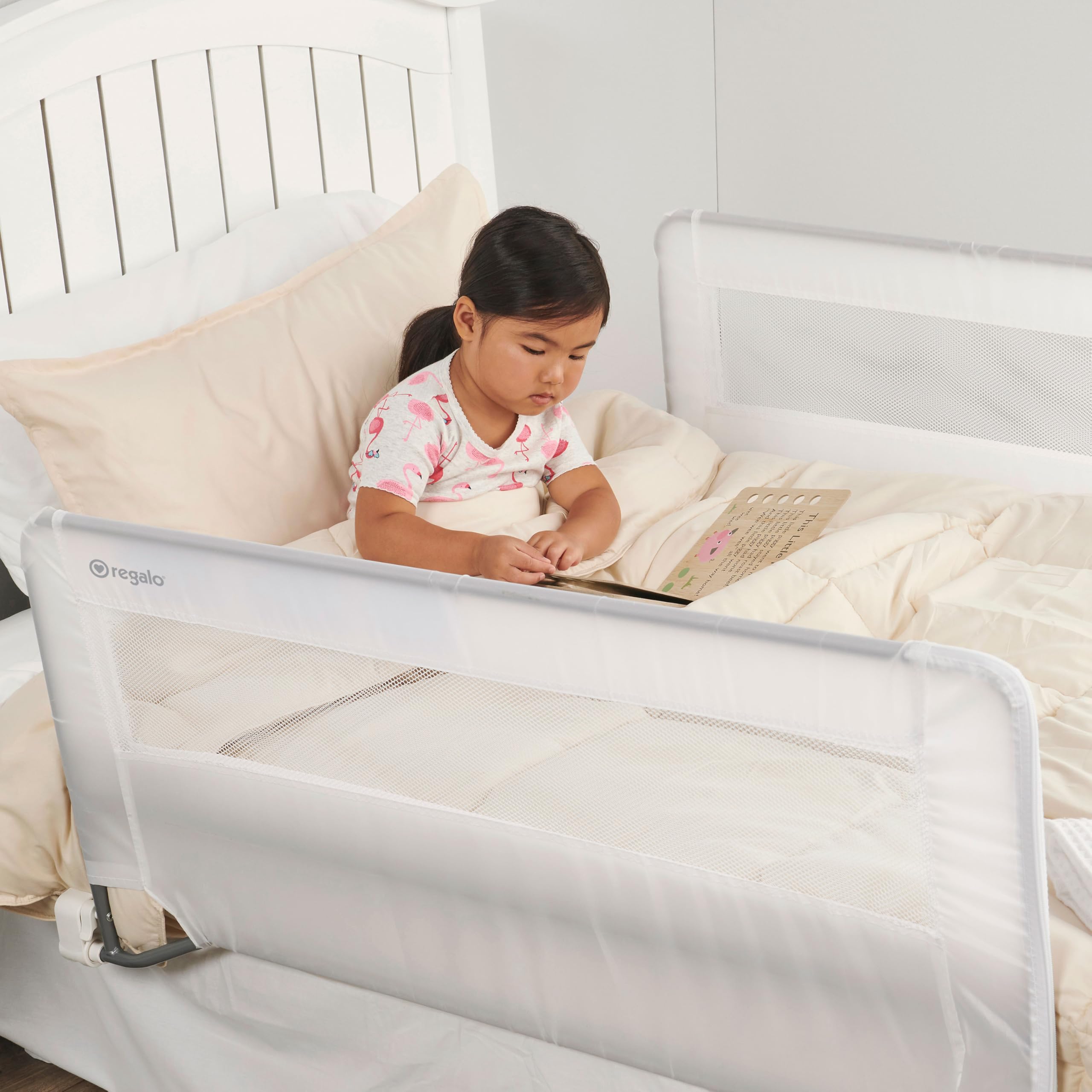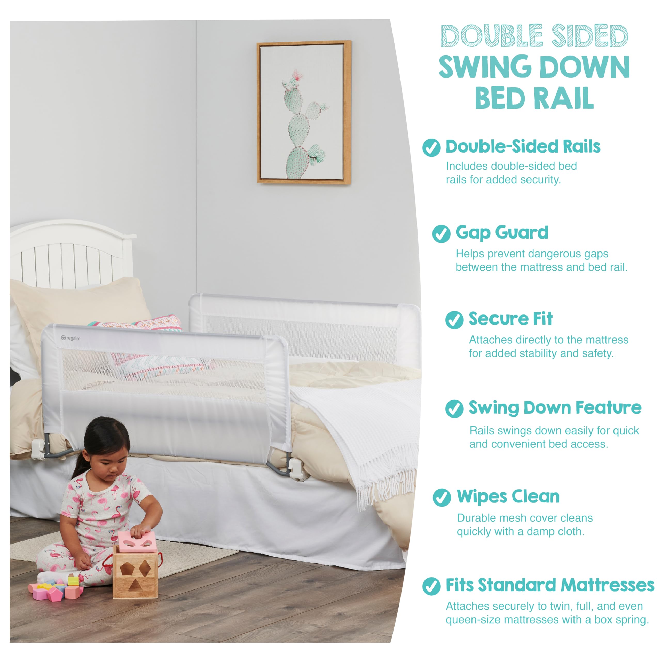 The Regalo Double-Sided Swing Down Bed Rail Guard provides added safety and peace of mind for parents and caregivers during your child’s transition from crib to bed. Designed with two rails for both sides of the bed, this toddler bed rail helps prevent nighttime falls while allowing your child to sleep comfortably. Each rail features a patented swing down design, allowing it to pivot out of the way when getting in and out of bed or changing sheets. The extra-long 43-inch length and 20-inch height provide enhanced coverage, making it ideal for thicker mattresses and active sleepers. Constructed with a durable all-metal frame and reinforced anchor safety system, this bed rail offers a secure and stable fit. Installation is quick and easy with no tools required. Designed to fit most twin to queen size beds with a box spring, this bed rail is suitable for children ages 2 to 5 years and is a practical solution for safer sleep at home.