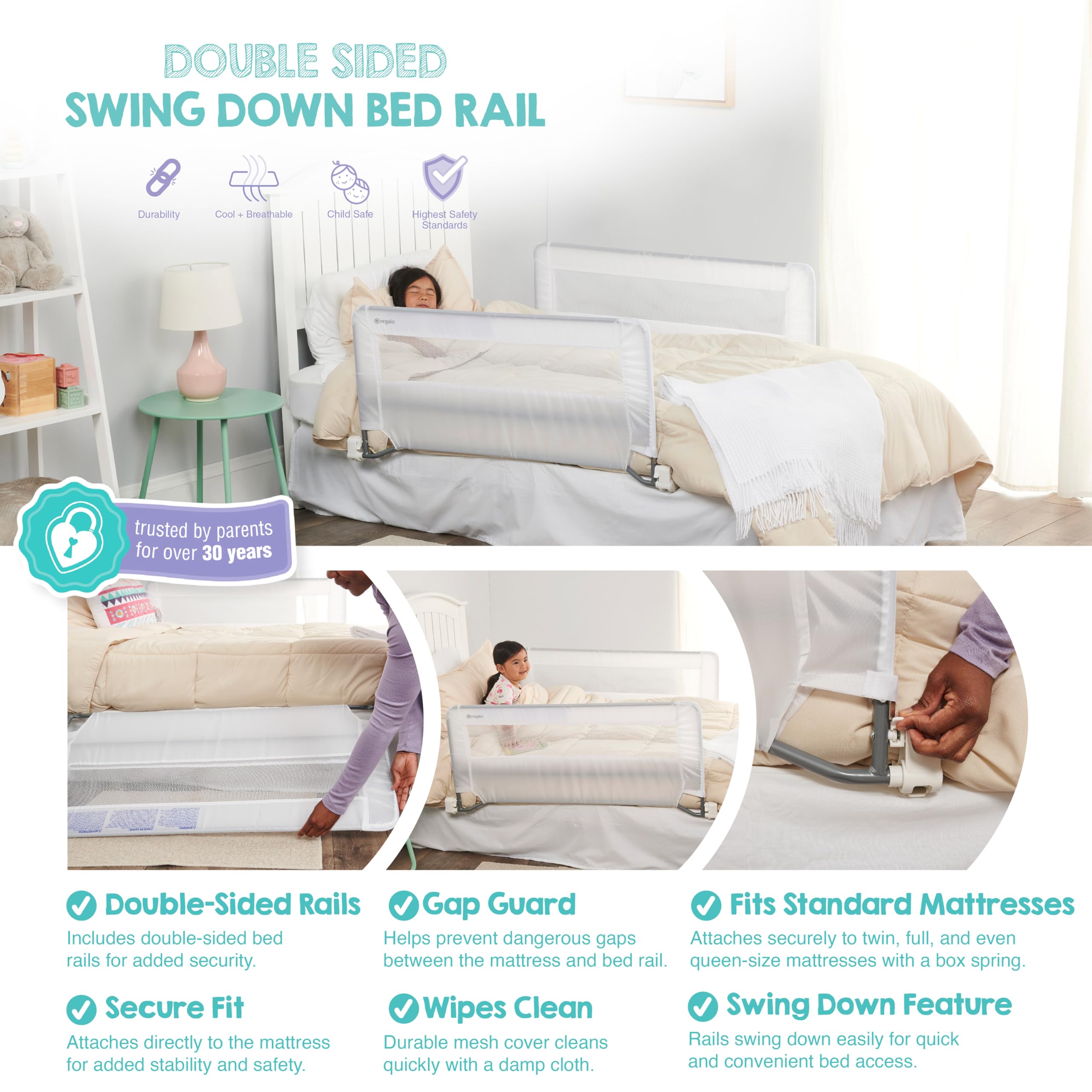 SWING DOWN DESIGN FOR EASY ACCESS: Patented swing down feature allows each rail to pivot down and out of the way, making it easy for children to get in and out of bed or for parents to change sheets.