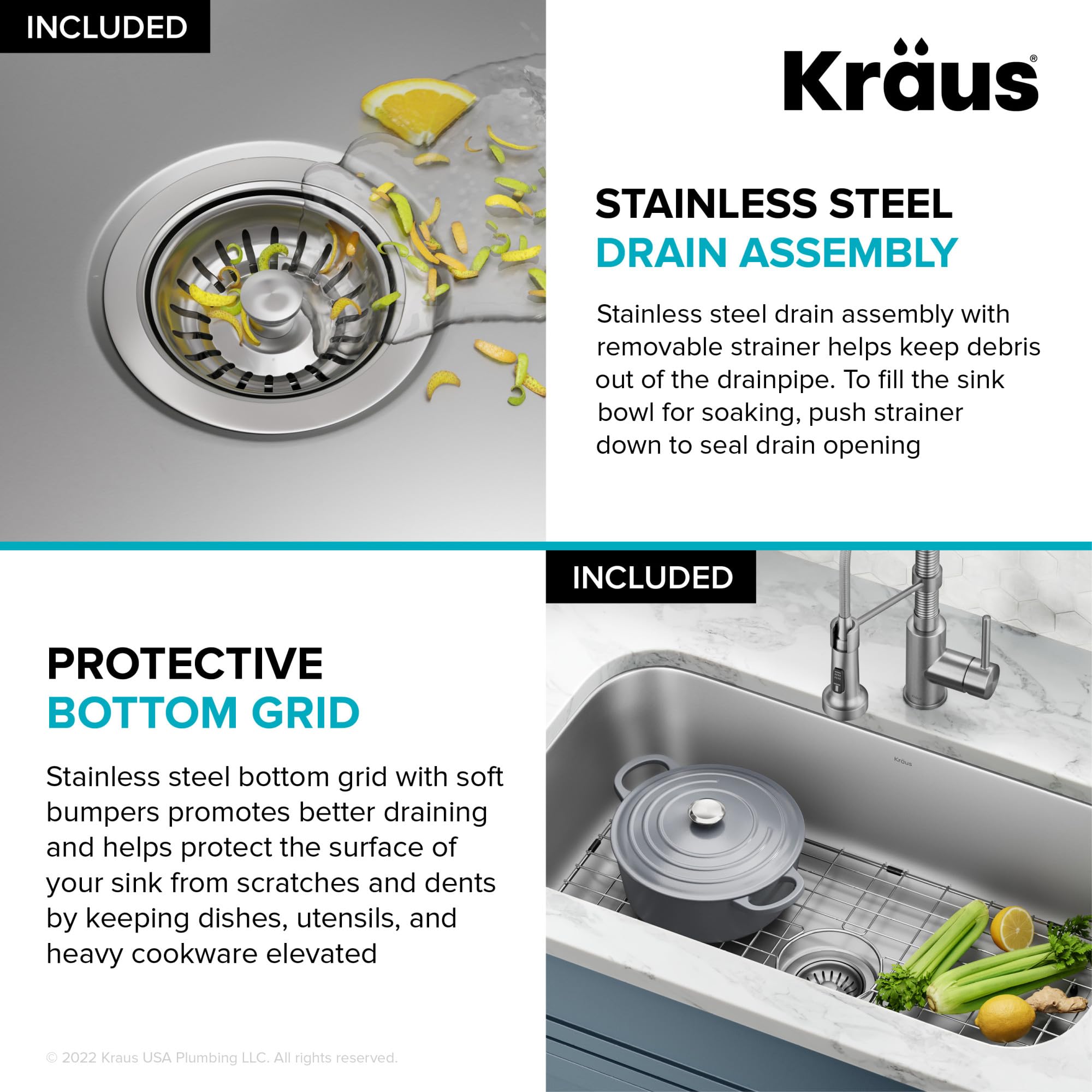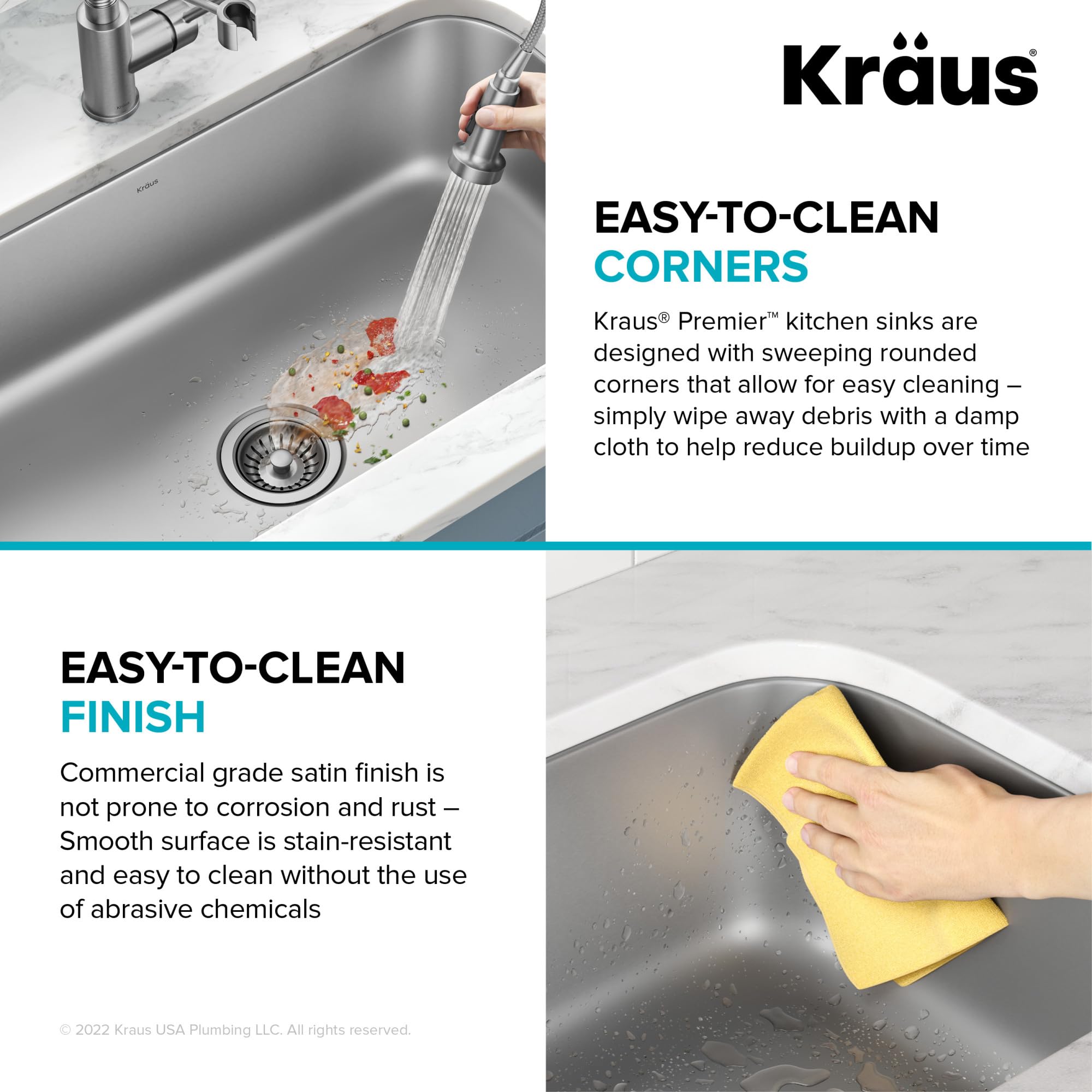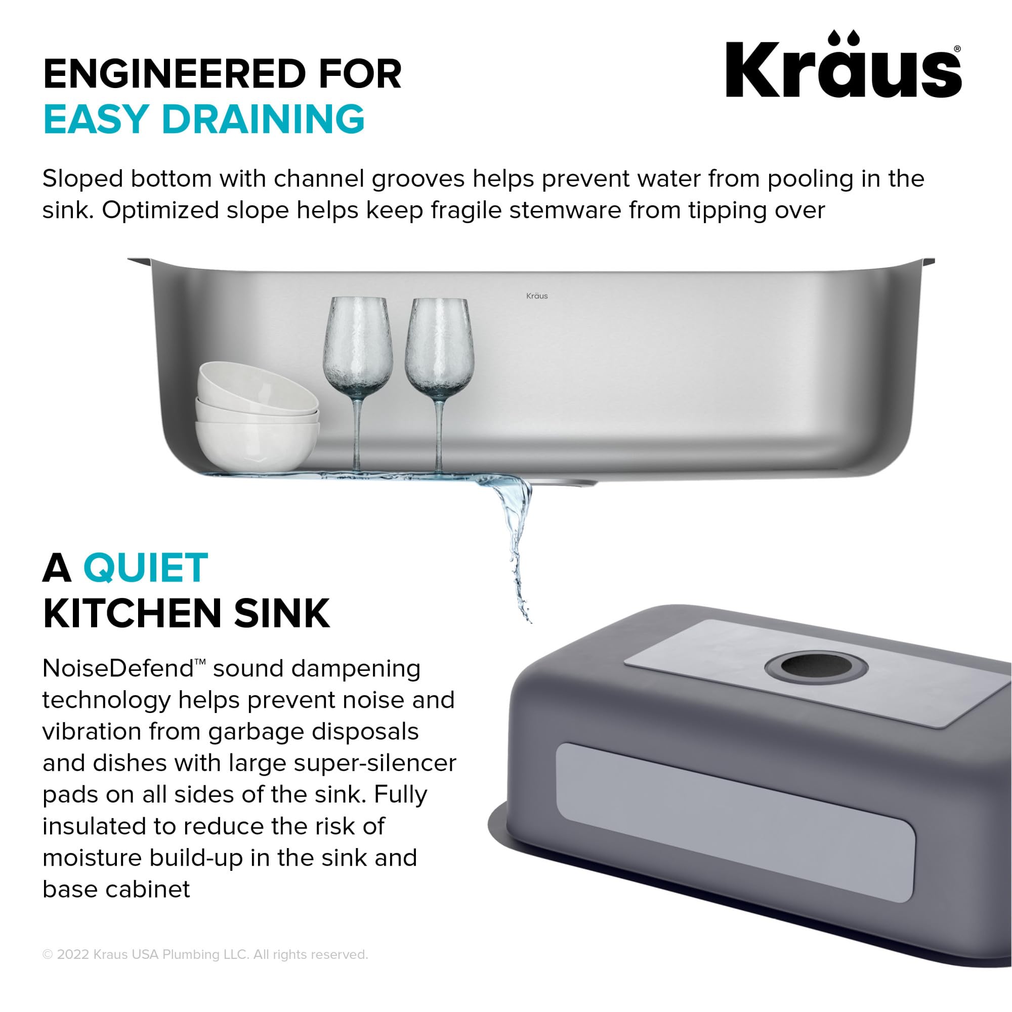 Designed for universal appeal and long-lasting durability, Kraus Premier Sinks feature rounded corners and sloping sidewalls that create a soft transitional look in any kitchen. Undermount installation makes cleaning easy, with no exposed mounting deck to trap food and debris, creating a seamless transition between sink and countertop. Heavy-duty 18-gauge construction offers lasting durability, with resistance to dents and damage. The high-capacity single bowl sink creates an uninterrupted work surface with ample space for large cookware and stacks of dishes. Thick NoiseDefend sound dampening pads help absorb noise and vibration for an ultra-quiet experience when the sink is in use. Perfect for busy kitchens, the commercial-grade satin finish is wear-resistant and not prone to corrosion, stains, or rust. Sweeping rounded corners make this sink easy to wipe clean, and help reduce build-up over time. A sloped bottom improves drainage so that your sink remains drier after each use. The installation-ready sink kit comes with a protective stainless steel bottom grid, cut–out template, and matching drain assembly for a clean look