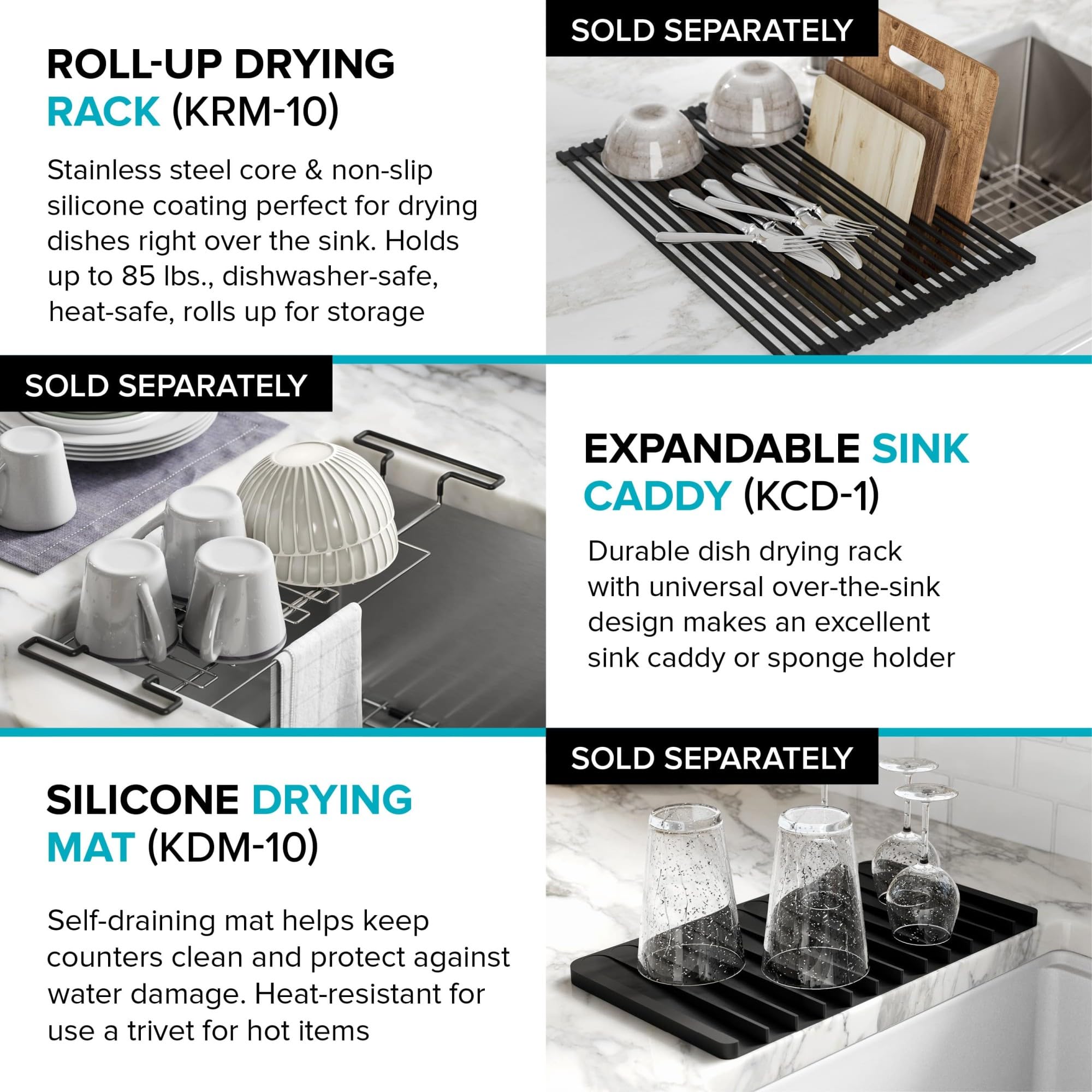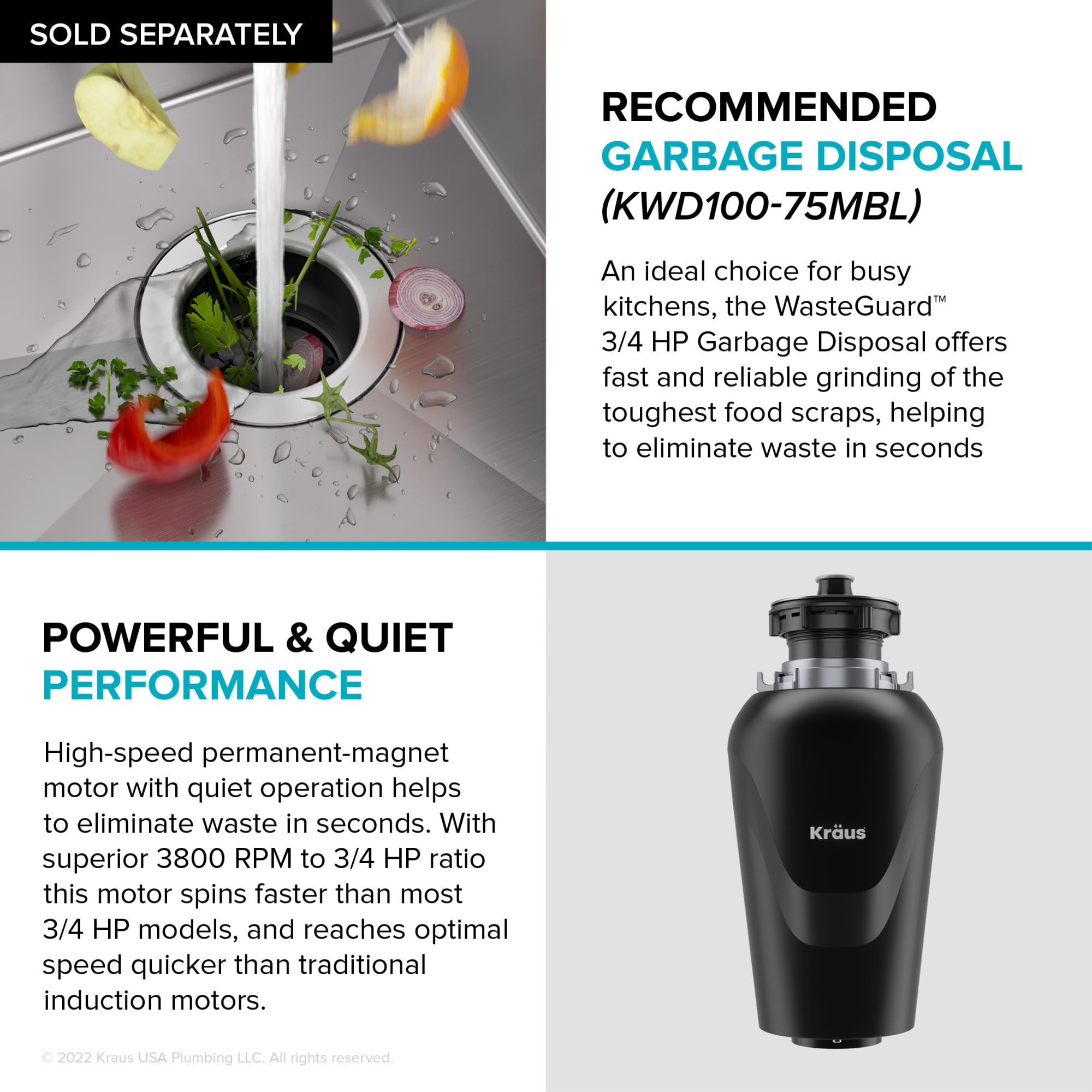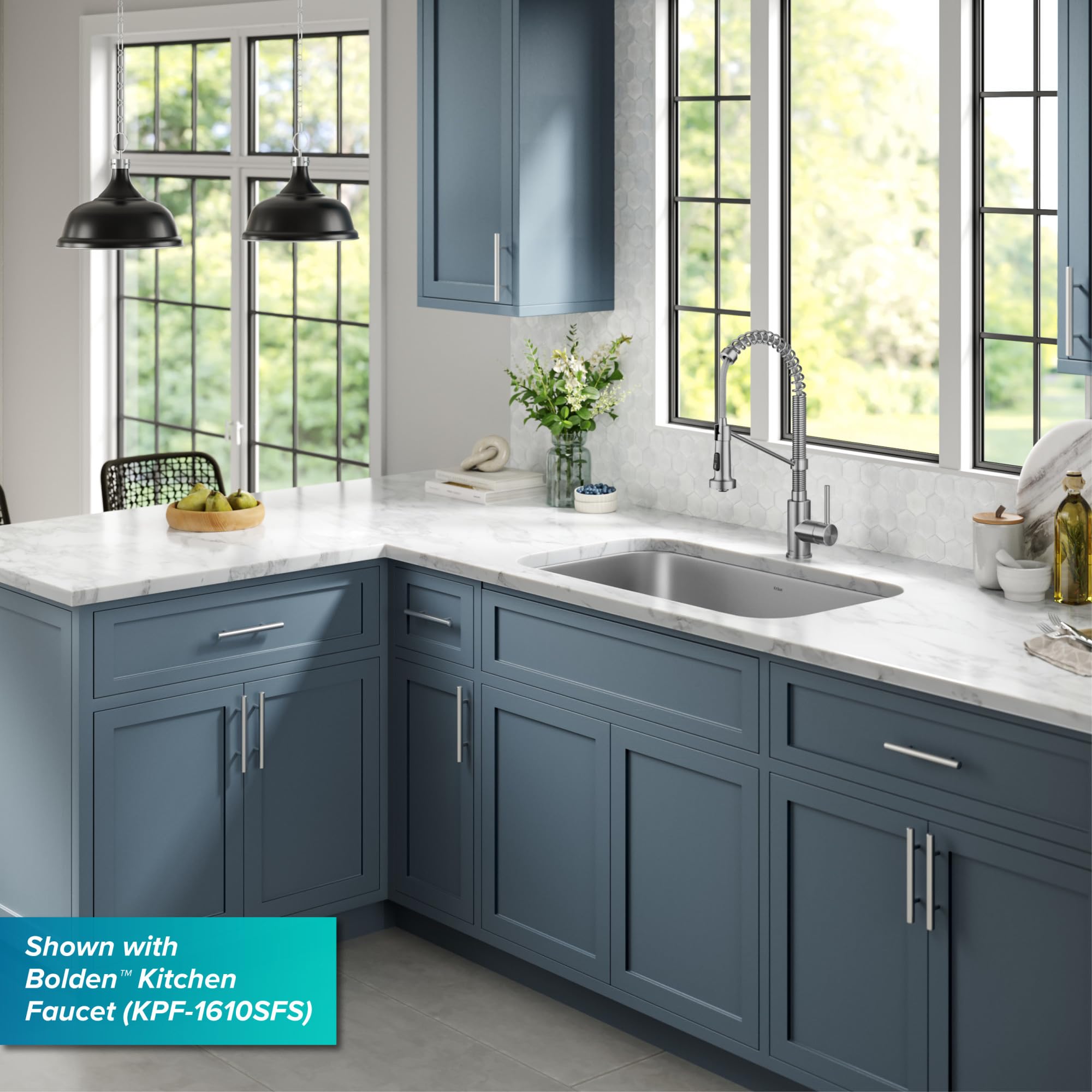 Designed for universal appeal and long-lasting durability, Kraus Premier Sinks feature rounded corners and sloping sidewalls that create a soft transitional look in any kitchen. Undermount installation makes cleaning easy, with no exposed mounting deck to trap food and debris, creating a seamless transition between sink and countertop. Heavy-duty 18-gauge construction offers lasting durability, with resistance to dents and damage. The high-capacity single bowl sink creates an uninterrupted work surface with ample space for large cookware and stacks of dishes. Thick NoiseDefend sound dampening pads help absorb noise and vibration for an ultra-quiet experience when the sink is in use. Perfect for busy kitchens, the commercial-grade satin finish is wear-resistant and not prone to corrosion, stains, or rust. Sweeping rounded corners make this sink easy to wipe clean, and help reduce build-up over time. A sloped bottom improves drainage so that your sink remains drier after each use. The installation-ready sink kit comes with a protective stainless steel bottom grid, cut–out template, and matching drain assembly for a clean look