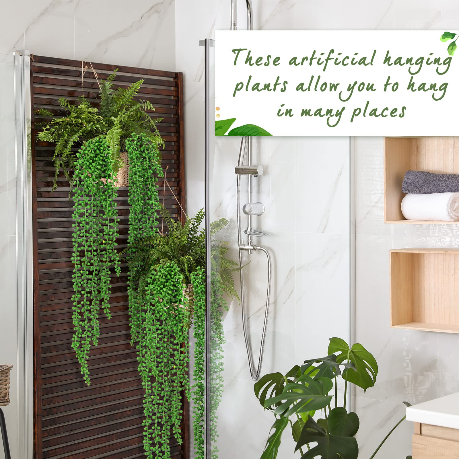 Where You Can Hang: these artificial hanging plants allow you to hang in many places, they can be in line with your different styles, such as desktops, cabinets, bookshelves, wall cabinets and so on, creating a beautiful view that easily indulges you into the joy of ornament