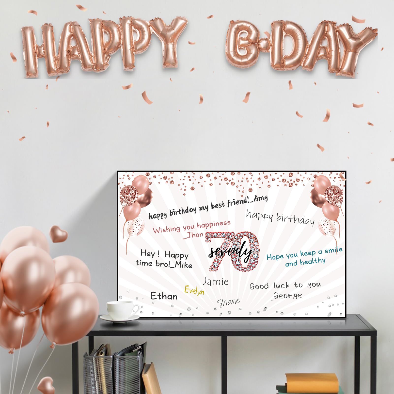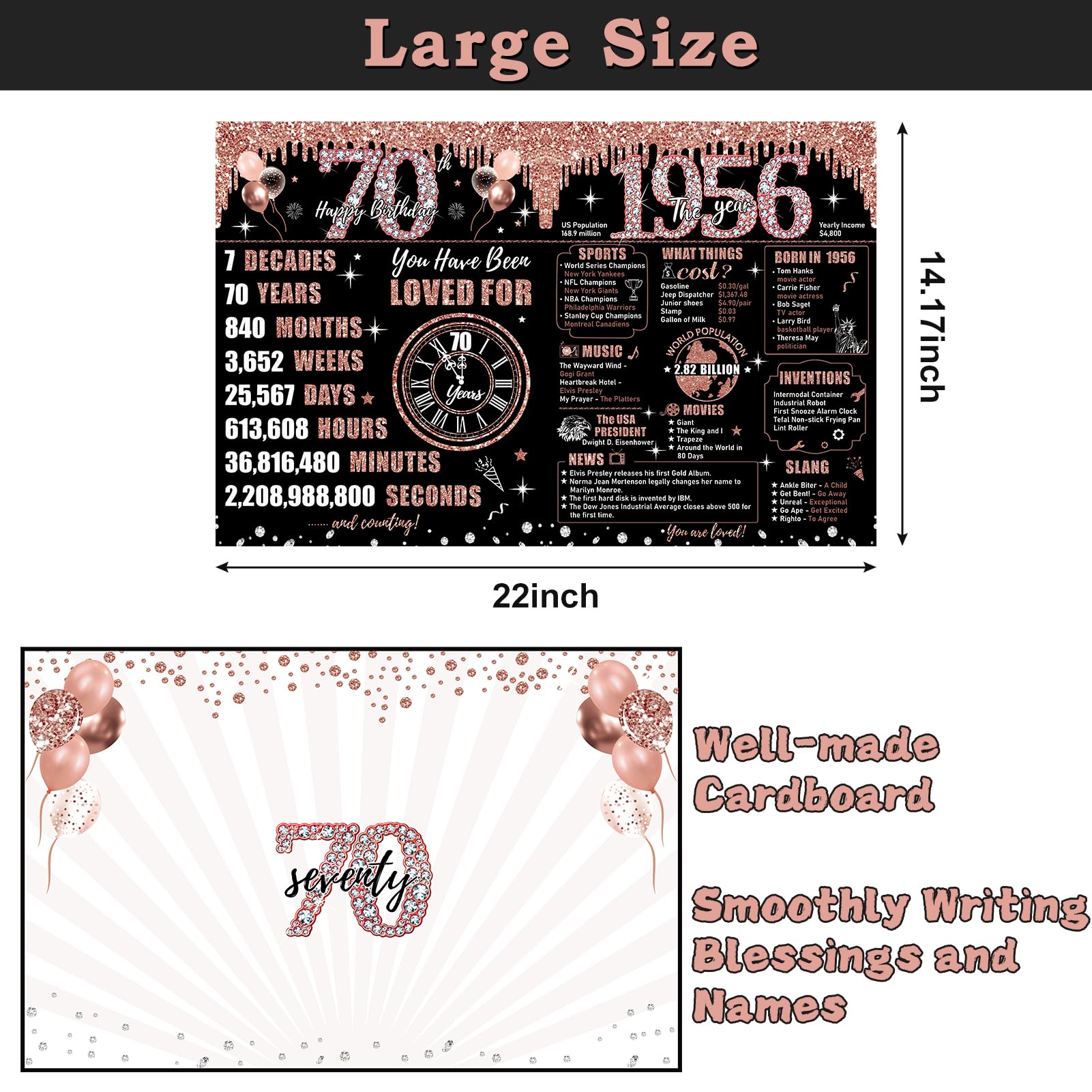 Celebrate 70th Birthday: This extra large rose gold 70th birthday card measures 22x14 inches folded with a matching envelope perfect for signing well wishes in the attached guest book section