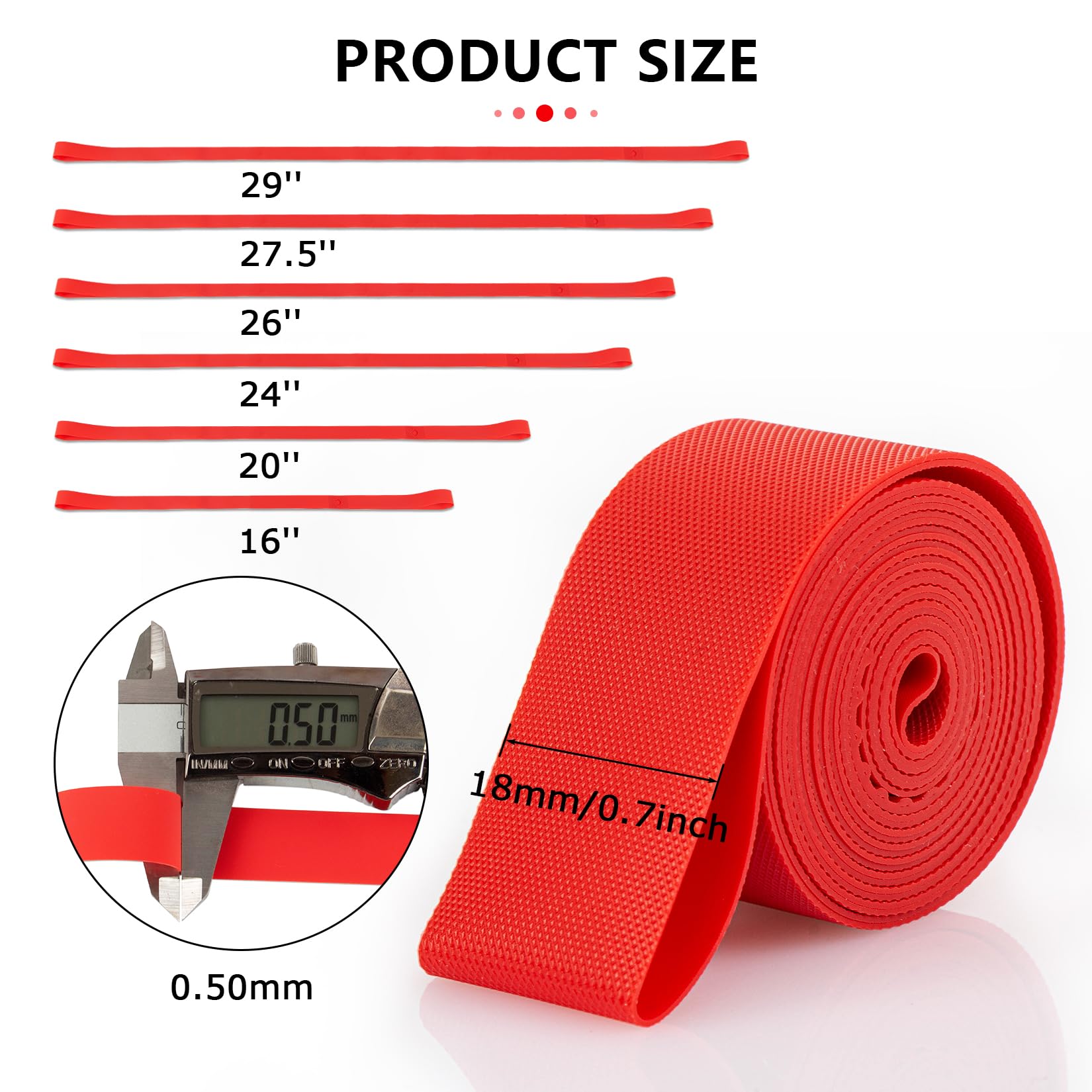 Color and size: Our bike tire liner is red. Sizes available 16inches, 20inches, 24inches, 26inches, 27.5inches, 29inches/700C. Width 18 mm.Thickness 0.50 mm