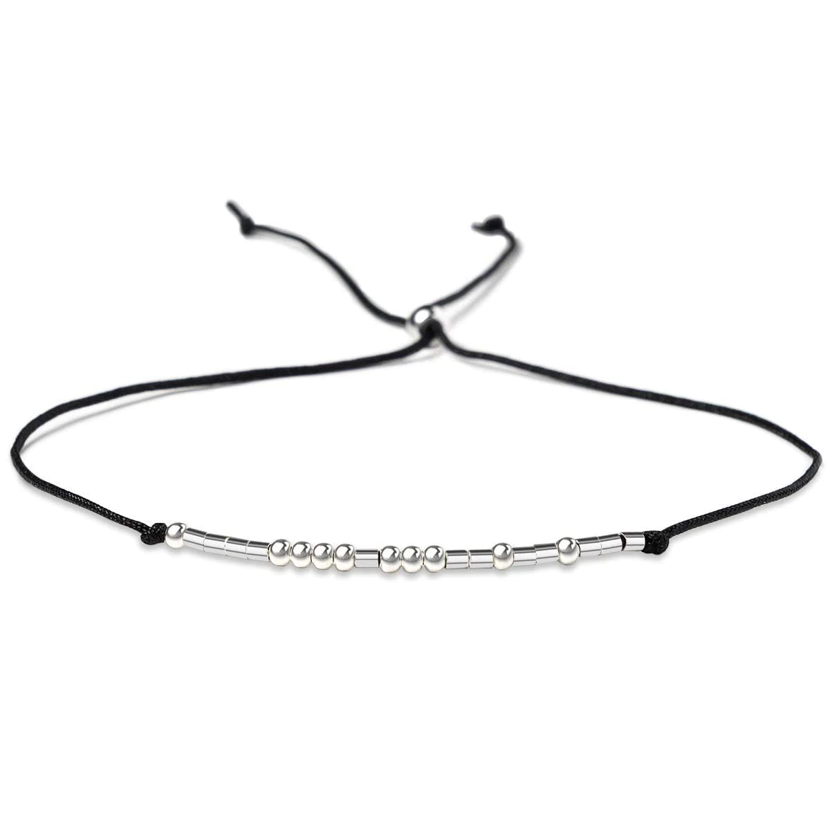 Bracelet Material and Size: Material: Handmade morse code bracelets, made of Solid 925 sterling silver beads for word and black silk cord. Size: Waxed cord with morse code chain length for the perfect fit - 7 inches is the most popular size for adult women.