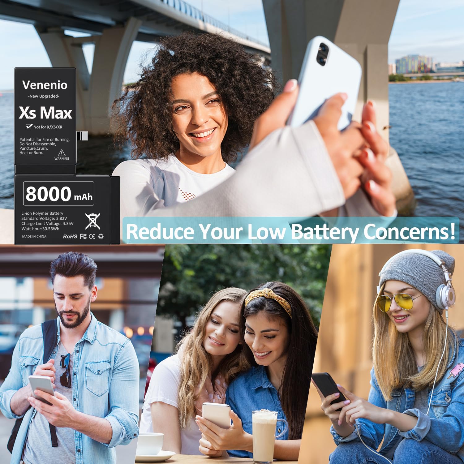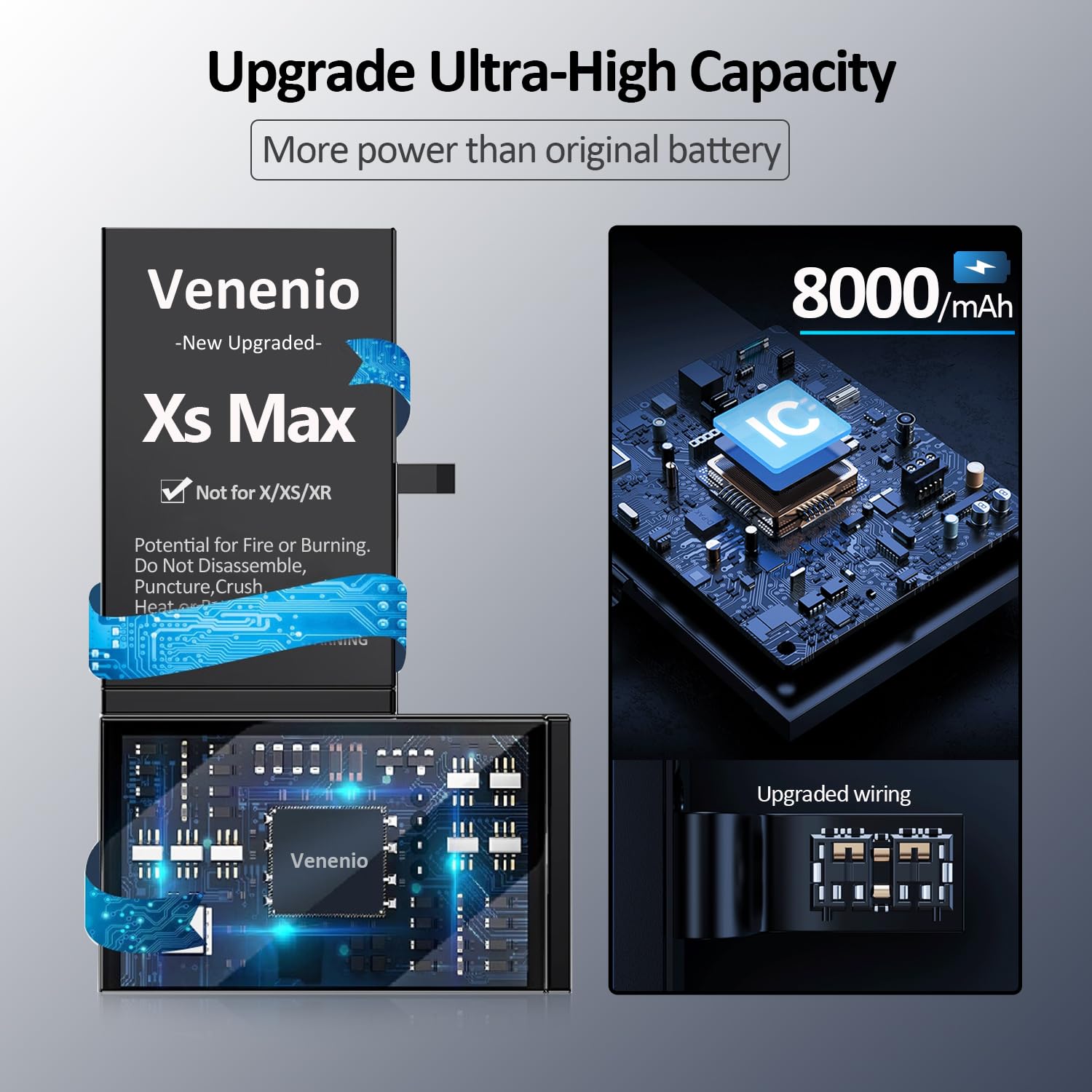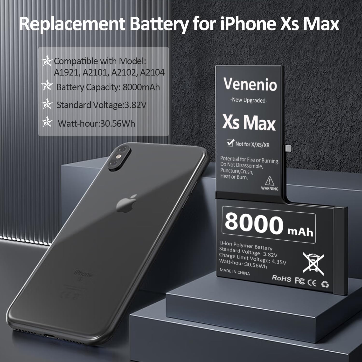 Battery for iPhone XS MAX, 2025 New Upgraded 8000mAh High Capacity 0 Cycle Battery Replacement for iPhone XS MAX Models A1921, A2101, A2102, A2104 with Professional Repair Tool Kit Venenio Replacement Battery is Not OEM. After the installation is completed, the mobile phone system will prompt you that the battery is unknown part, but which does not affect the normal use of the battery and the health of the battery. [ Please Note ] No matter what problems you encountered, please fell free to contact us, we wil try our best to help you. Package List: 1 x 8000mAh XS MAX Battery 1 x Adhesive Strips 1 x Pentacle screwdriver 1 x Y-Shaped Screwdrive 1 x Suction cup 1 x Tweezers 1 x Wedge 1 x Spudgers