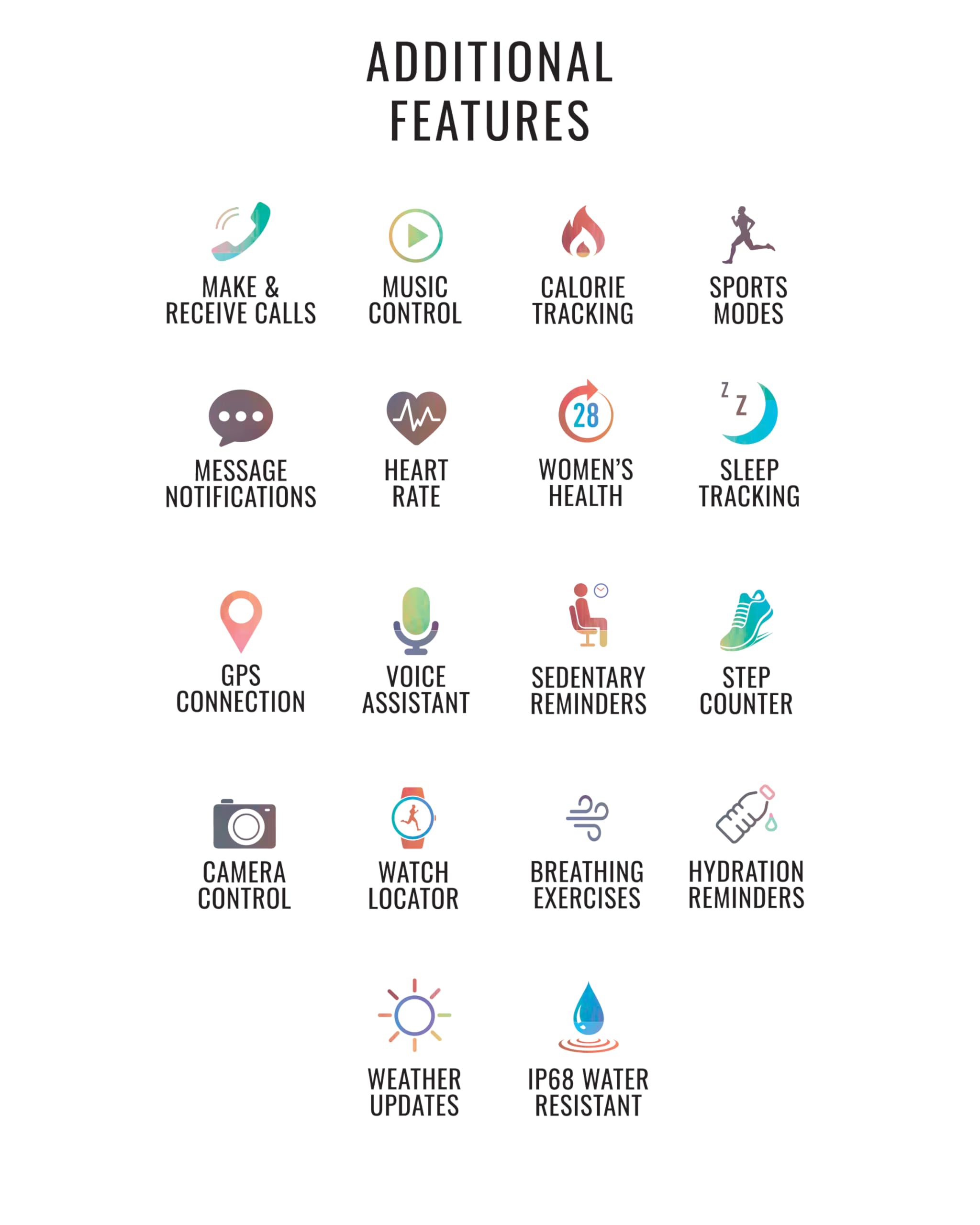 GET ACTIVE: Plan your fitness goals while using the step counter, various sport modes, and reminders to move and stay hydrated.