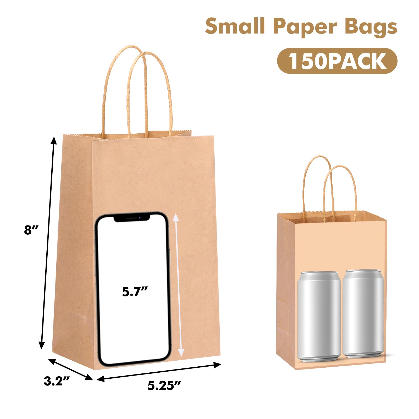 Paper Bags Set: There are a total of 150 brown gift bags with handles. The size of small paper bag is 5.25 x 3.2 x 8 inches. You can use them to package various small crafts, such as homemade chocolates, cookies, candies, soap, jewelry, scented candles, and more.
