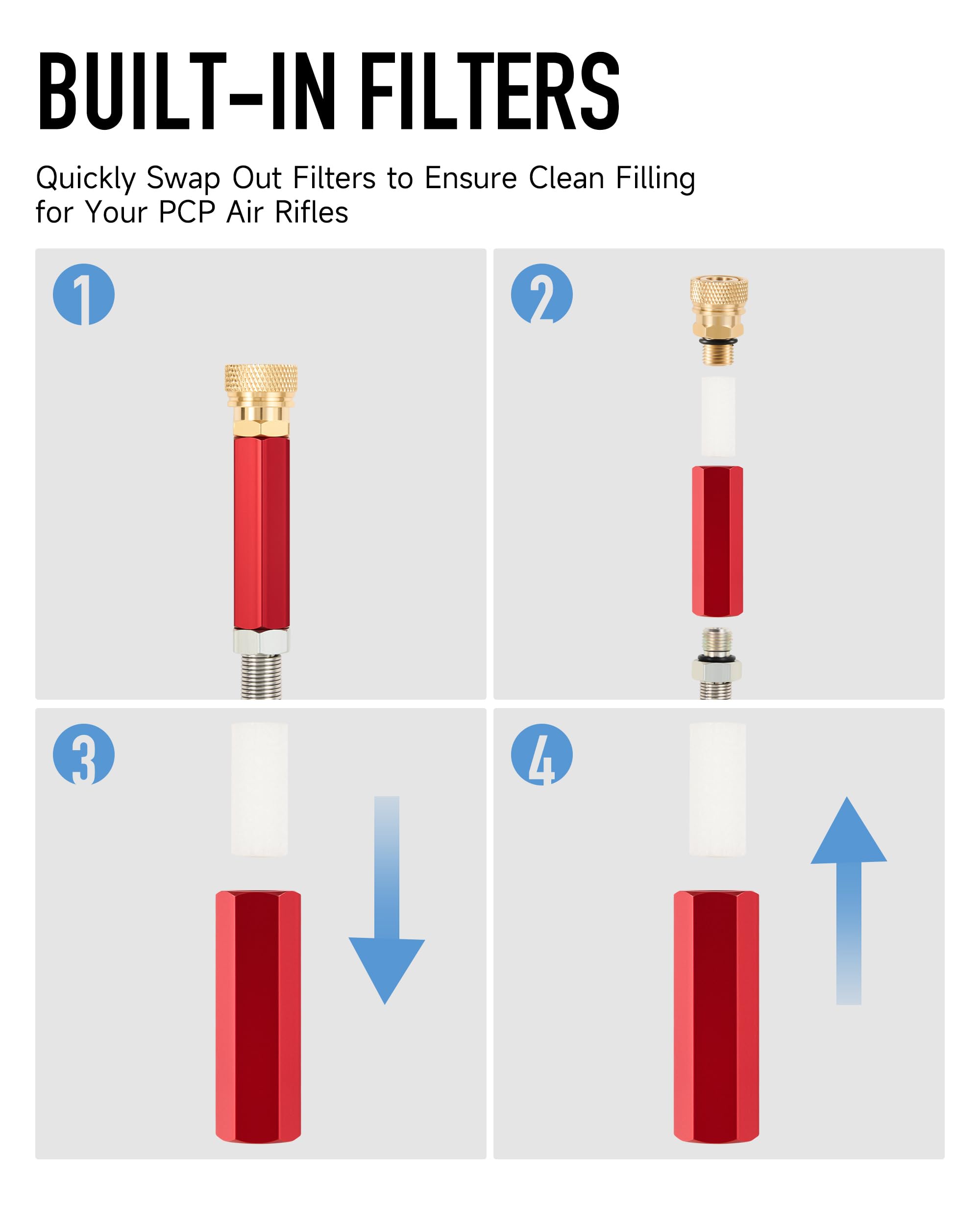 Built-in Filter: Fill your PCP air rifles with dry, clean air, as our integrated oil & water filter effectively captures and removes moisture and contaminants for safe & consistent results